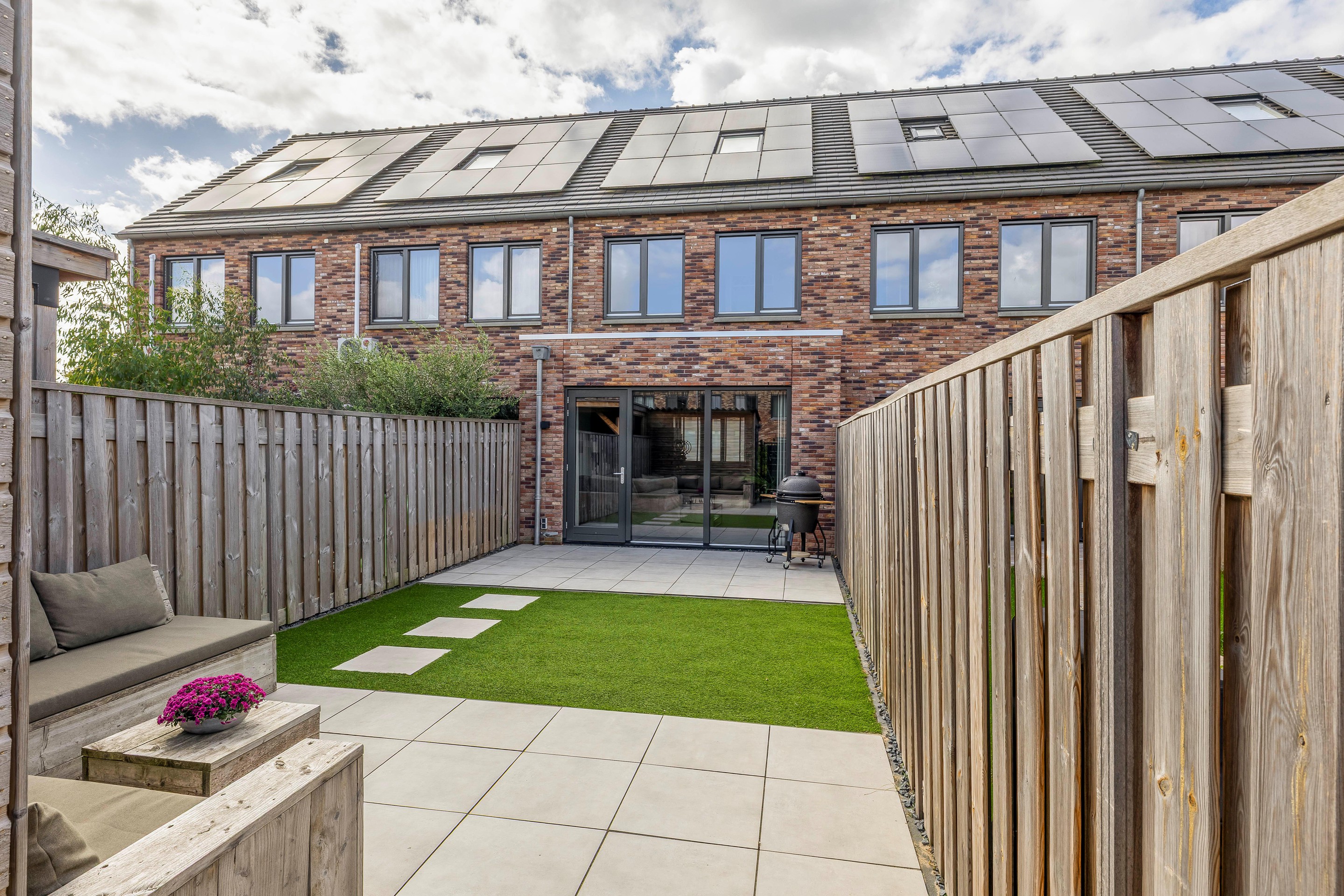 Tuin Tuin en parkeren: gemak rondom huis: De achtertuin is gelegen op het noordoosten en is keurig aangelegd. Direct aan de woning grenst een heerlijk zonneterras, gevolgd door een gazon van (kunst)gras en een tweede terras achterin de tuin. Het geheel is omzoomd door een houten erfafscheiding en beschikt over een praktische berging voorzien van elektra.
