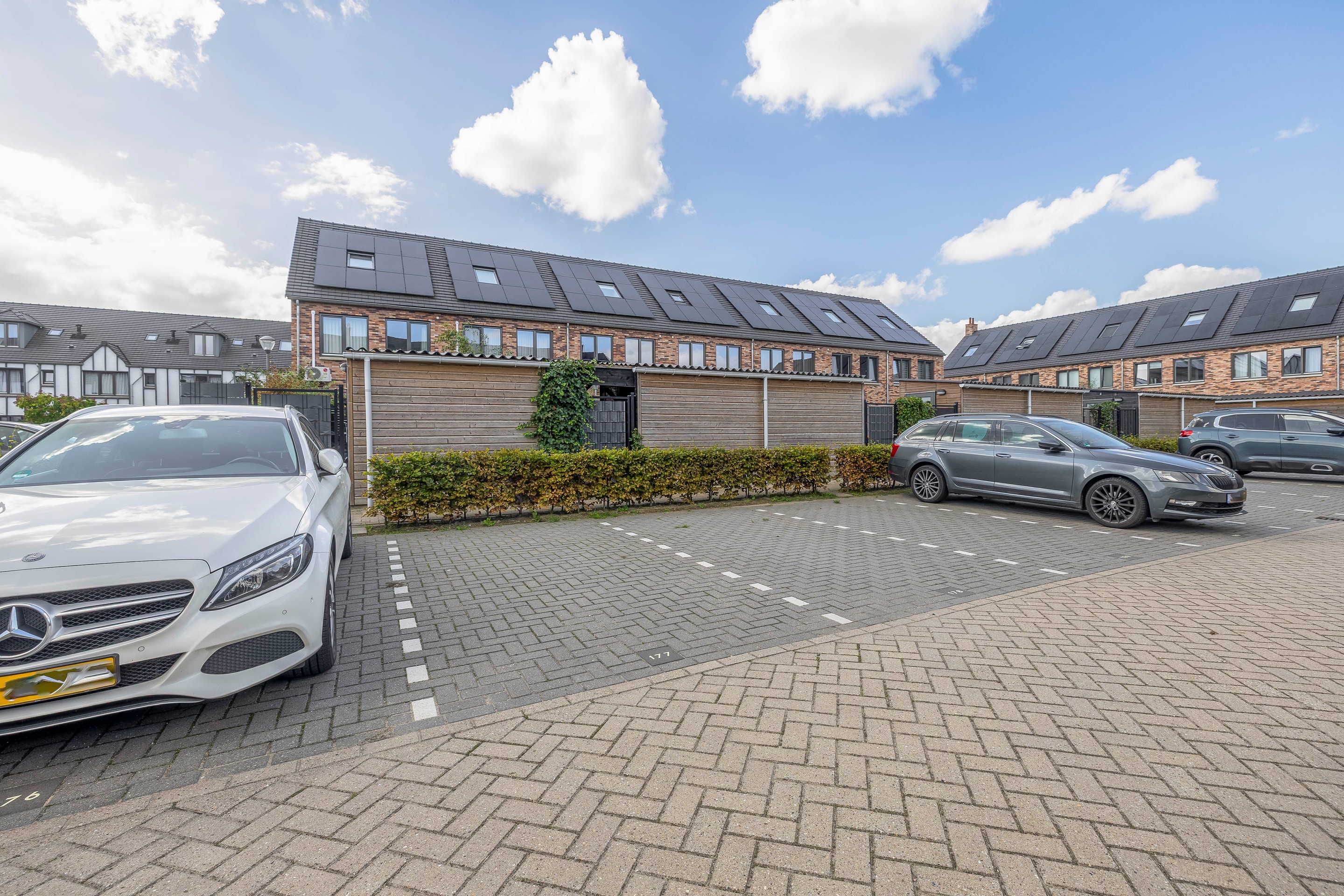Via de achterom bereik je het mandelige binnenterrein, waar je de beschikking hebt over een eigen parkeerplaats.