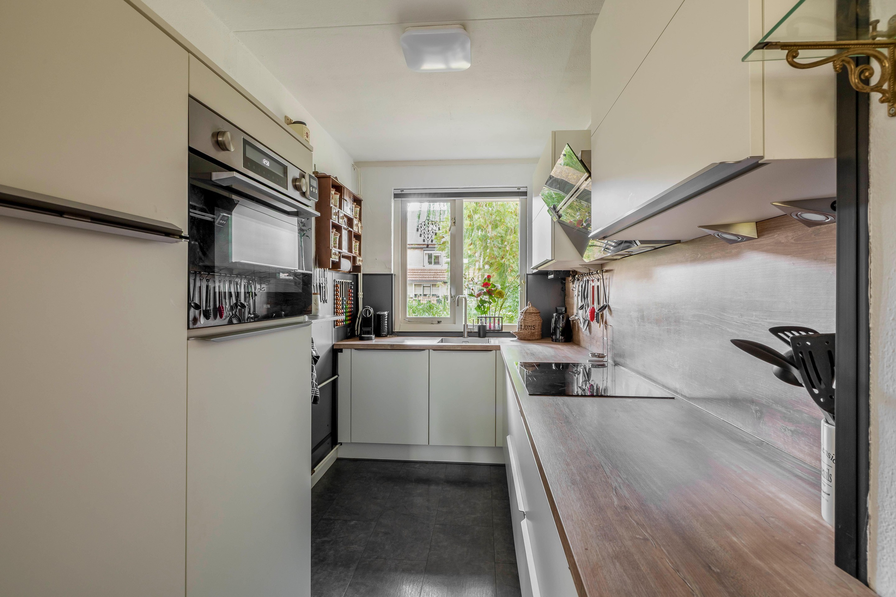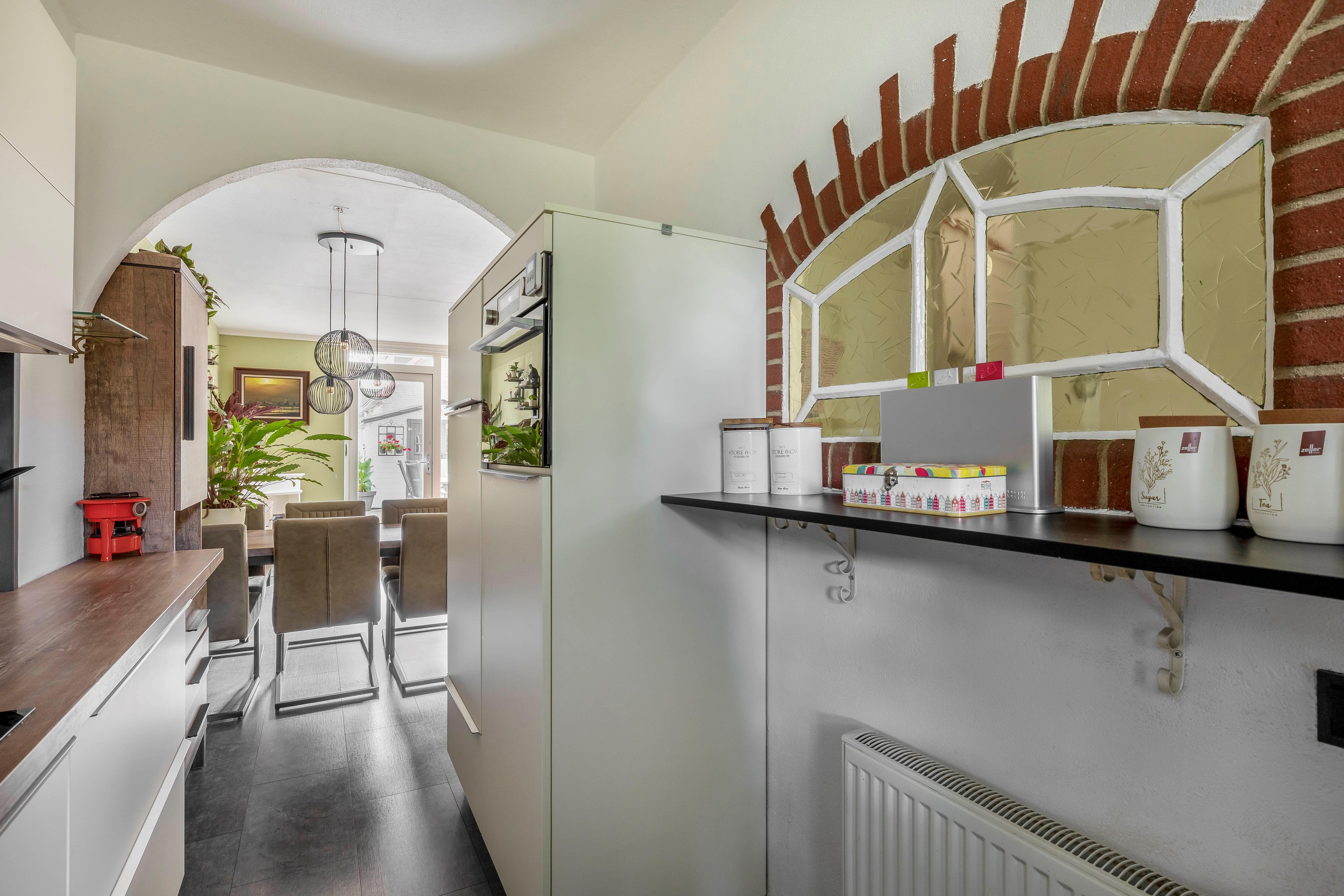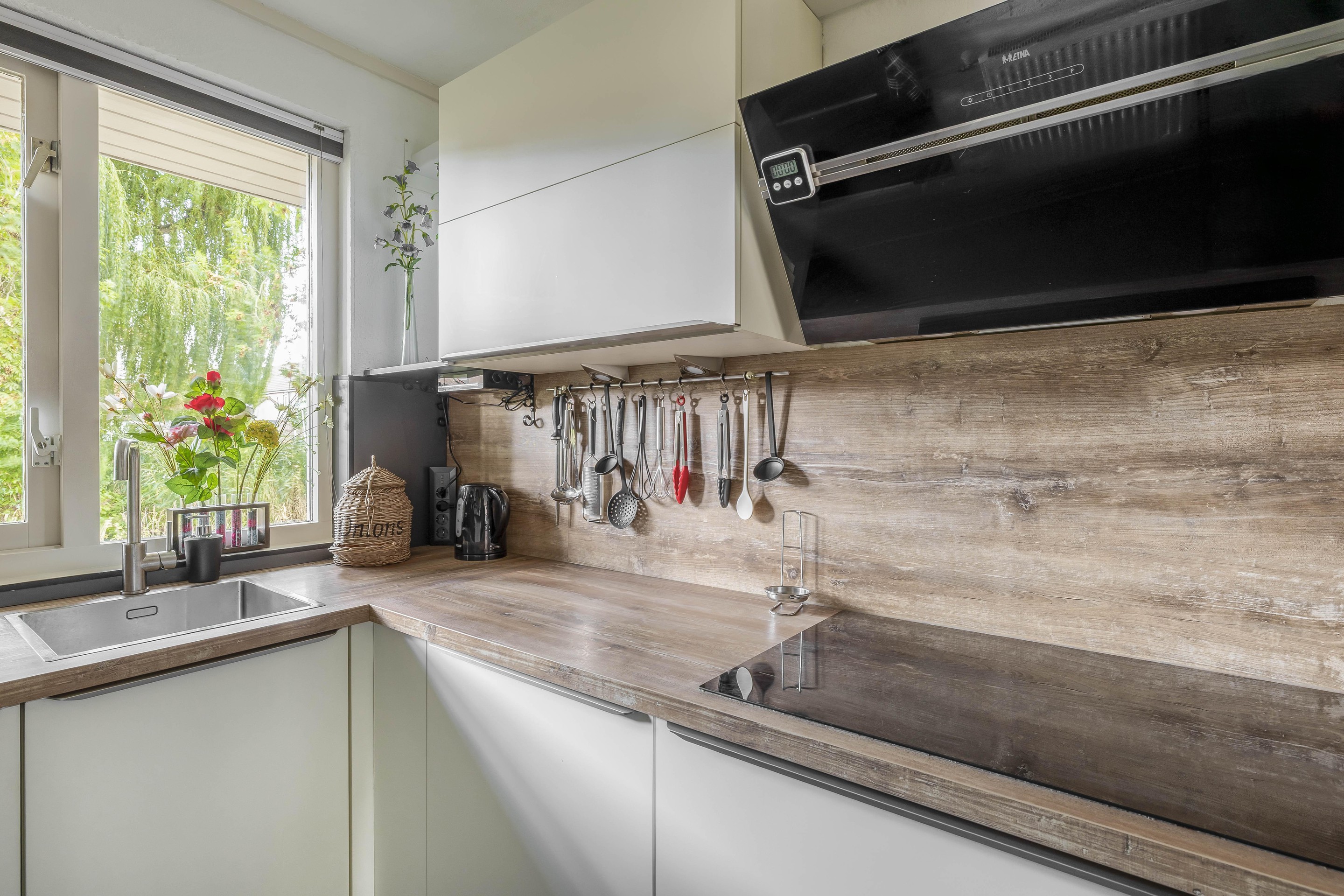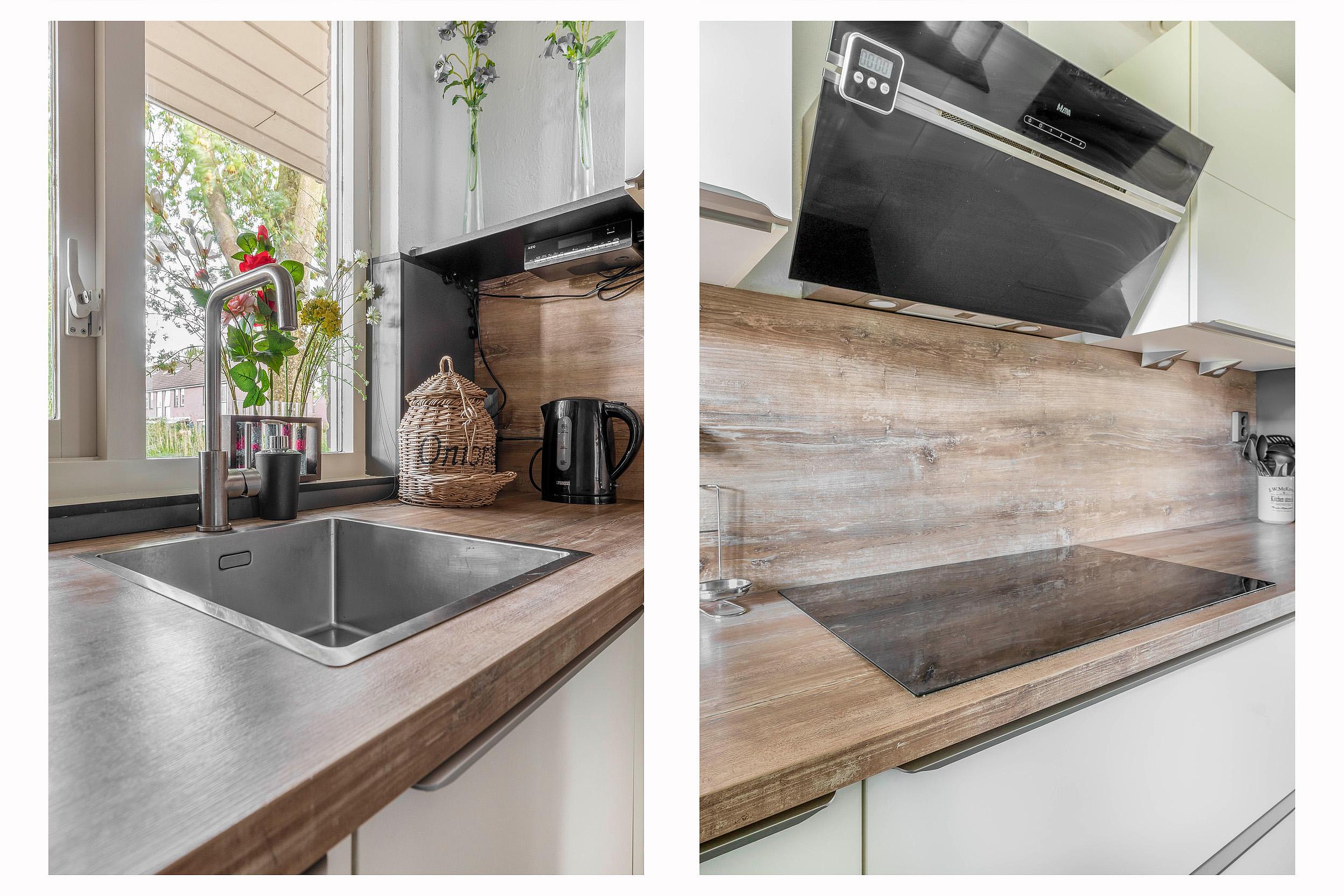 De half open keuken bevindt zich aan de voorzijde. Deze is L-vormig opgesteld en in 2023 vernieuwd. De keuken is voorzien van vaatwasser, inductiekookplaat met afzuigschouw en brede trekladen zodat veel bergruimte is. In een meubel aan de andere kant is de combi-oven, koelkast en vrieskast verwerkt Daarmee is de keuken mooi compleet.