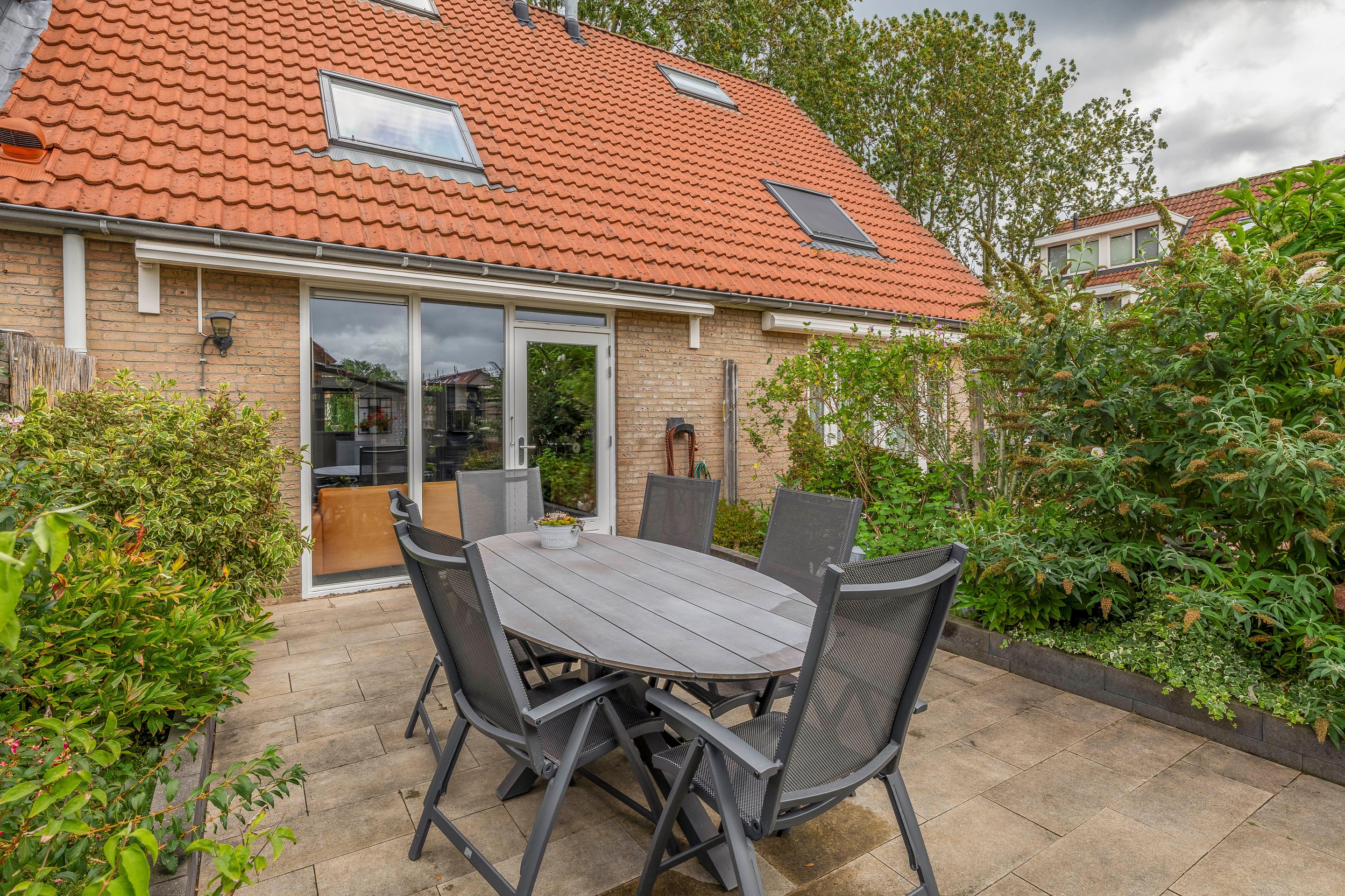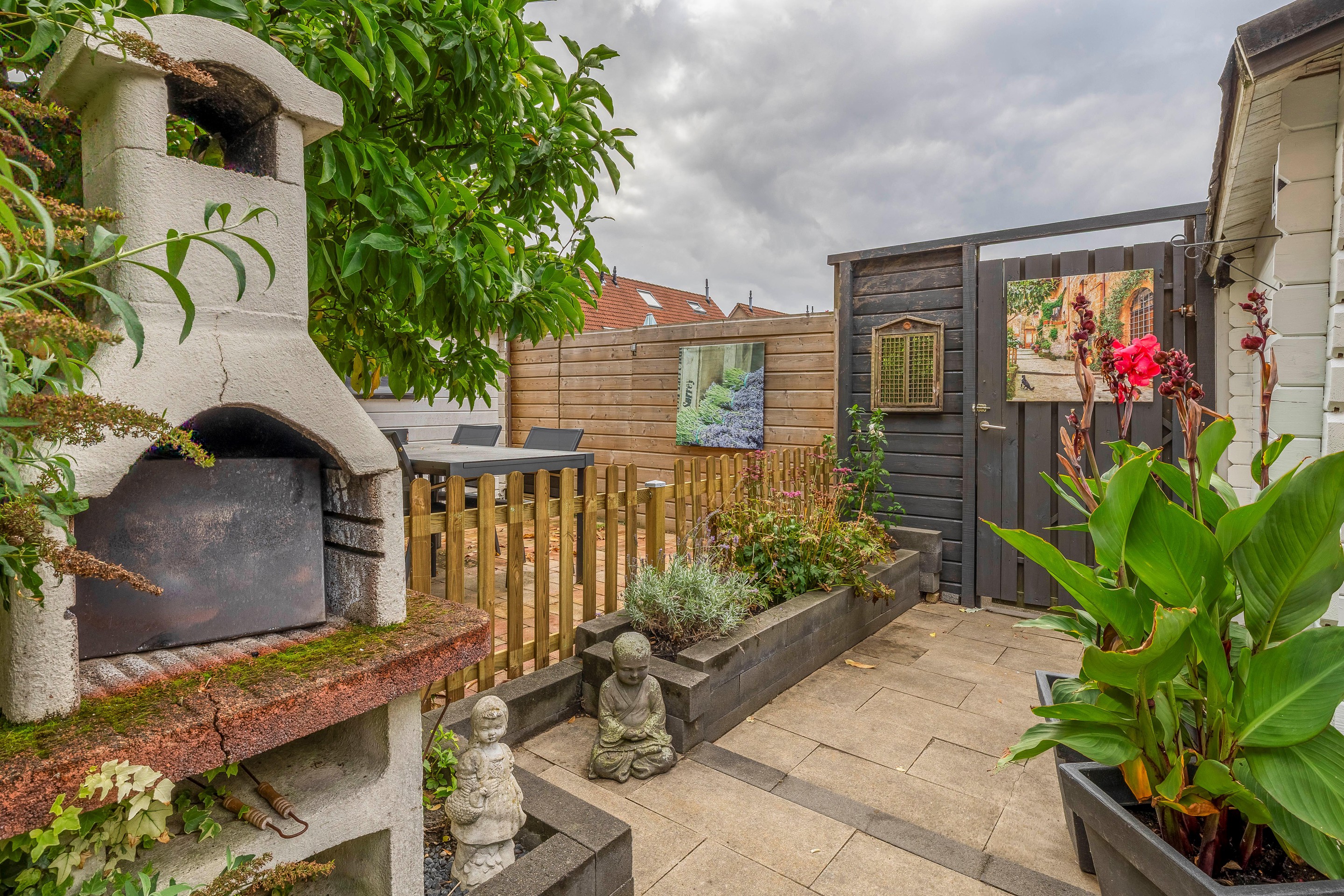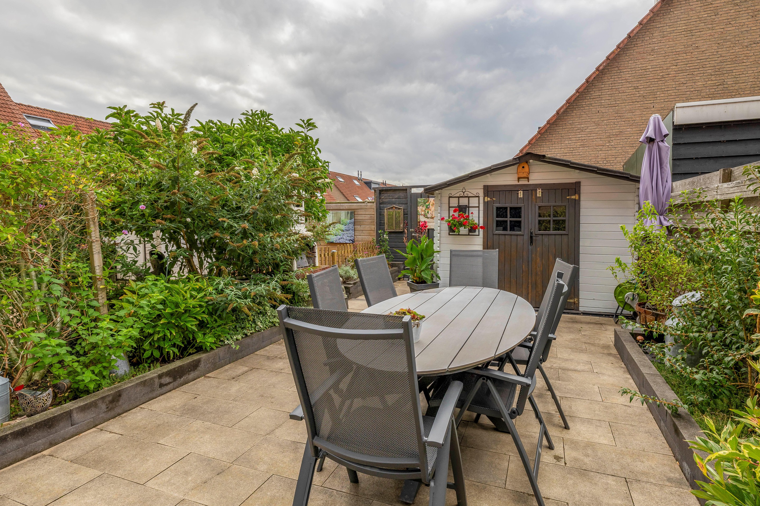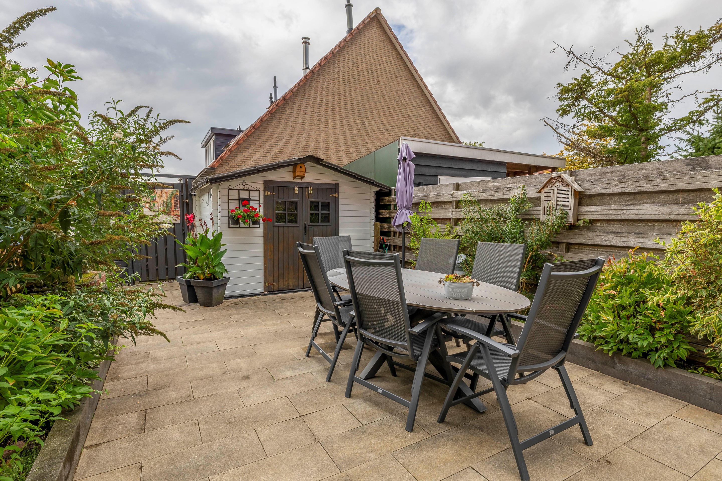 De tuin is grotendeels praktisch ingericht en voorzien van sierbestrating. Langs de randen is beplanting aanwezig. Achter in de tuin staat een houten chalet. Deze beschikt over ruim 7,00m2 opbergruimte, ideaal voor de fietsen, tuinmeubilair en dergelijke. In de tuin en in de houten berging is elektra aanwezig en ook een buitenkraan ontbreekt niet.
