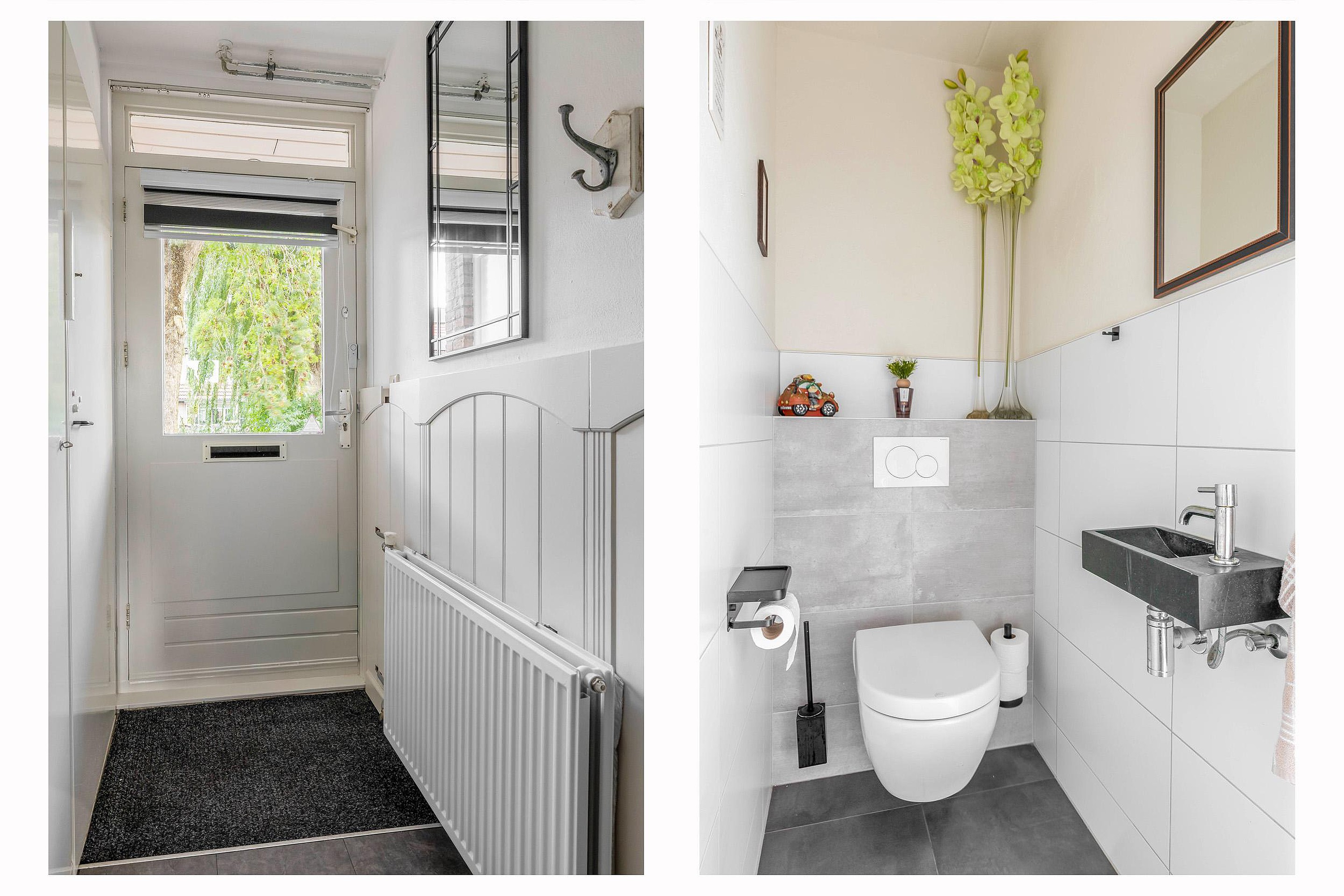 Begane grond Aan de voorzijde beschik je over een korte voortuin. Deze is geheel bestraat. Je komt de woning binnen in een gang met direct rechts de deur naar de inpandige berging, vervolgens vind je hier de (moderne) meterkast, dan het toilet en vervolgens de trap naar de eerste verdieping. Als je verder doorloopt kom je in de woonkamer. De inpandige berging is in gebruik als bijkeuken. Zeer handig voor voorraad en ook de wasmachineaansluiting is hier gemaakt. Het toilet is ongeveer 5 jaar geleden vernieuwd, is gedeeltelijk betegeld en voorzien van vrij hangend closet en fontein.