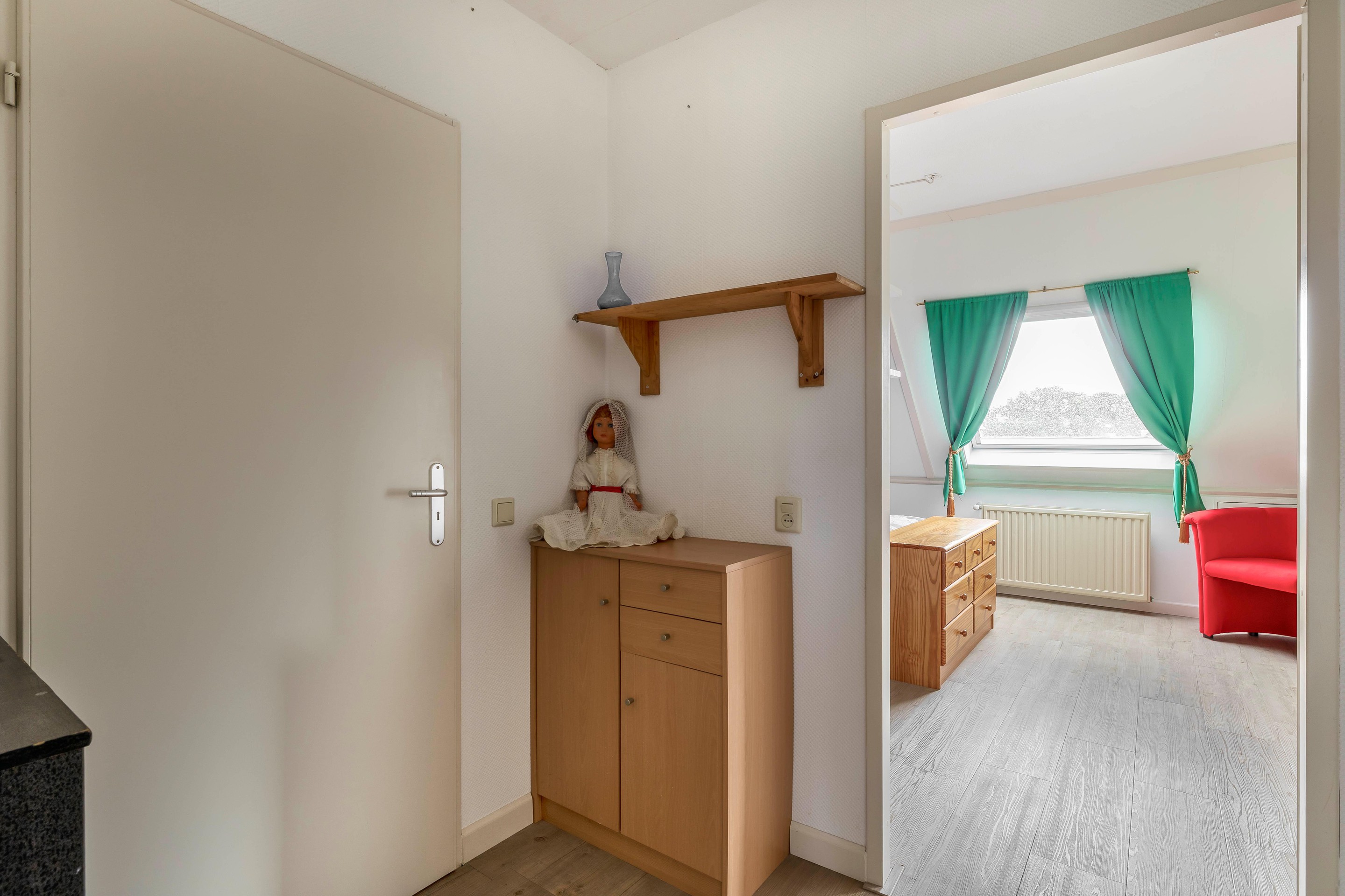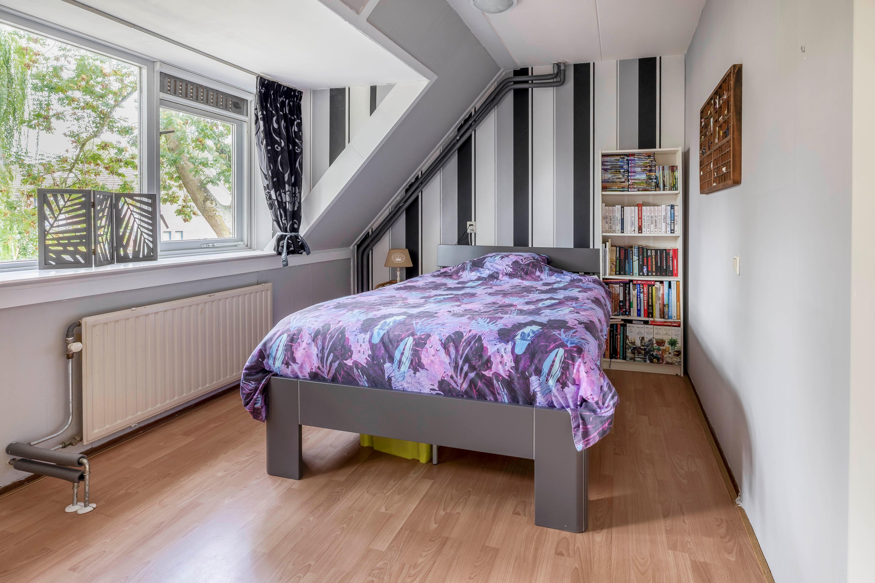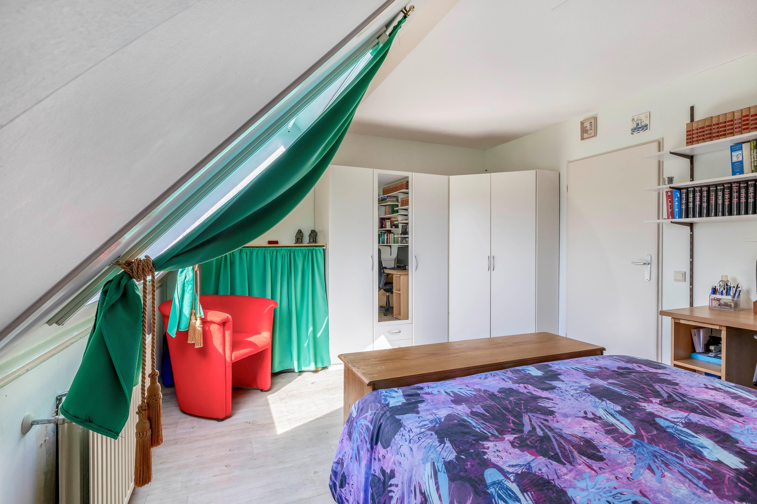 Eerste verdieping Via de in lichte kleur geschilderde trap kom je op de eerste verdieping. De twee originele slaapkamers aan de voorzijde zijn samengevoegd tot 1 groot formaat slaapkamer, maar kan indien gewenst weer worden gesplitst, waardoor een extra slaapkamer ontstaat. Deze kamer beschikt over een dakkapel. De tweede slaapkamer bevindt zich aan de achterzijde. Deze is standaard heerlijk ruim met ongeveer 16,00m2 vloeroppervlak. Lichtinval is hier door een groot kunststof Velux dakvenster.