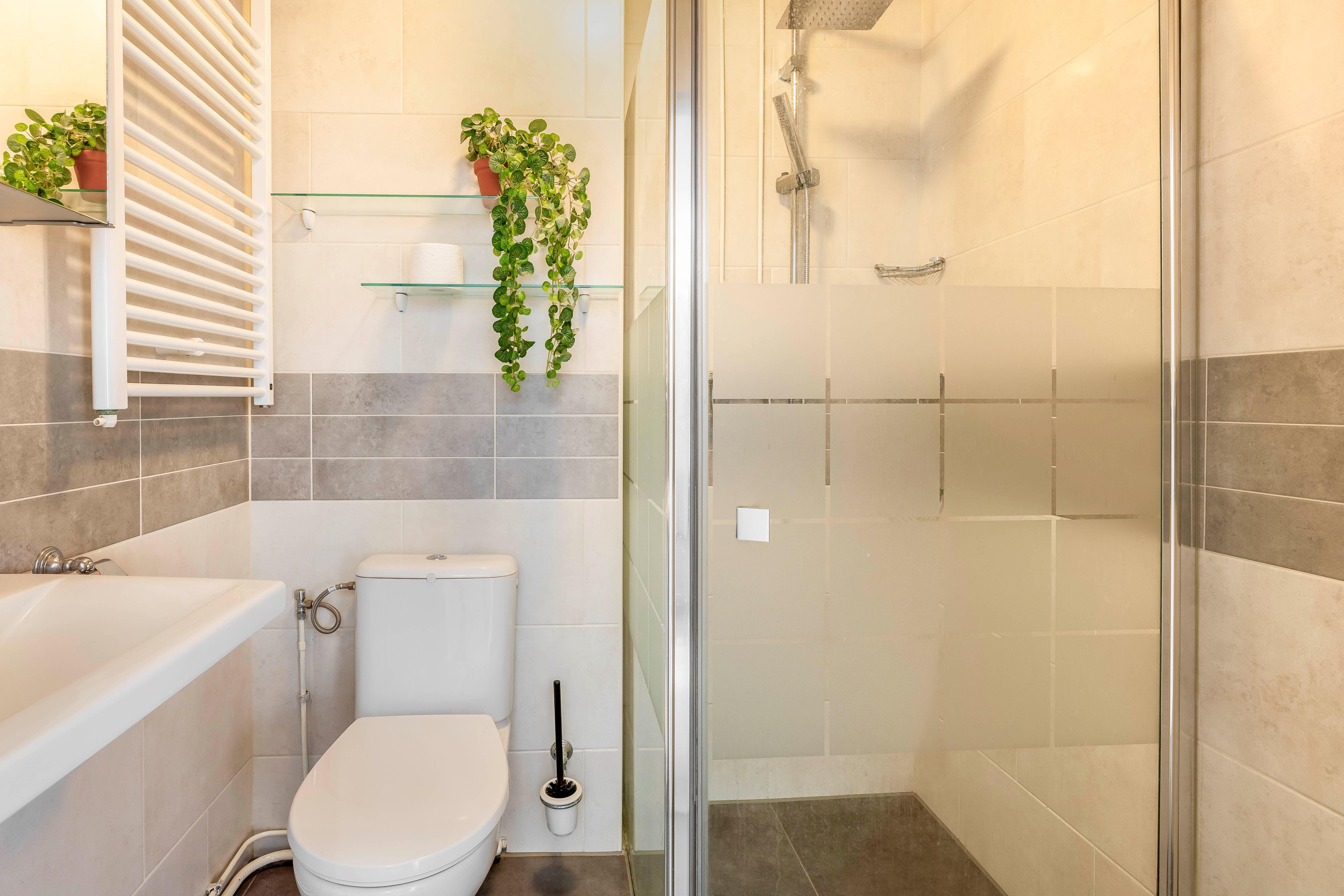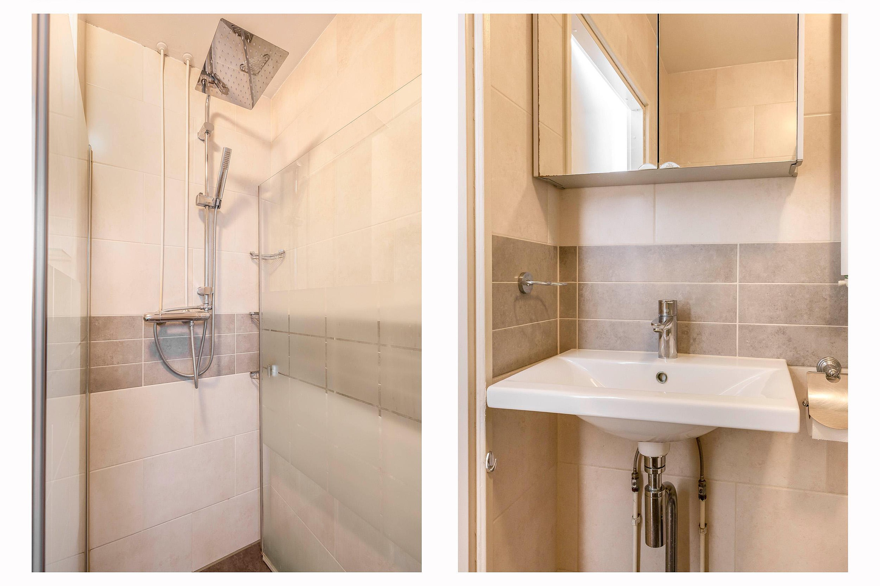 De badkamer is in 2016 vernieuwd en voorzien van een douche met glazen douchewand en deur, een staand toilet, wastafel met spiegelkast en handdoekradiator.
