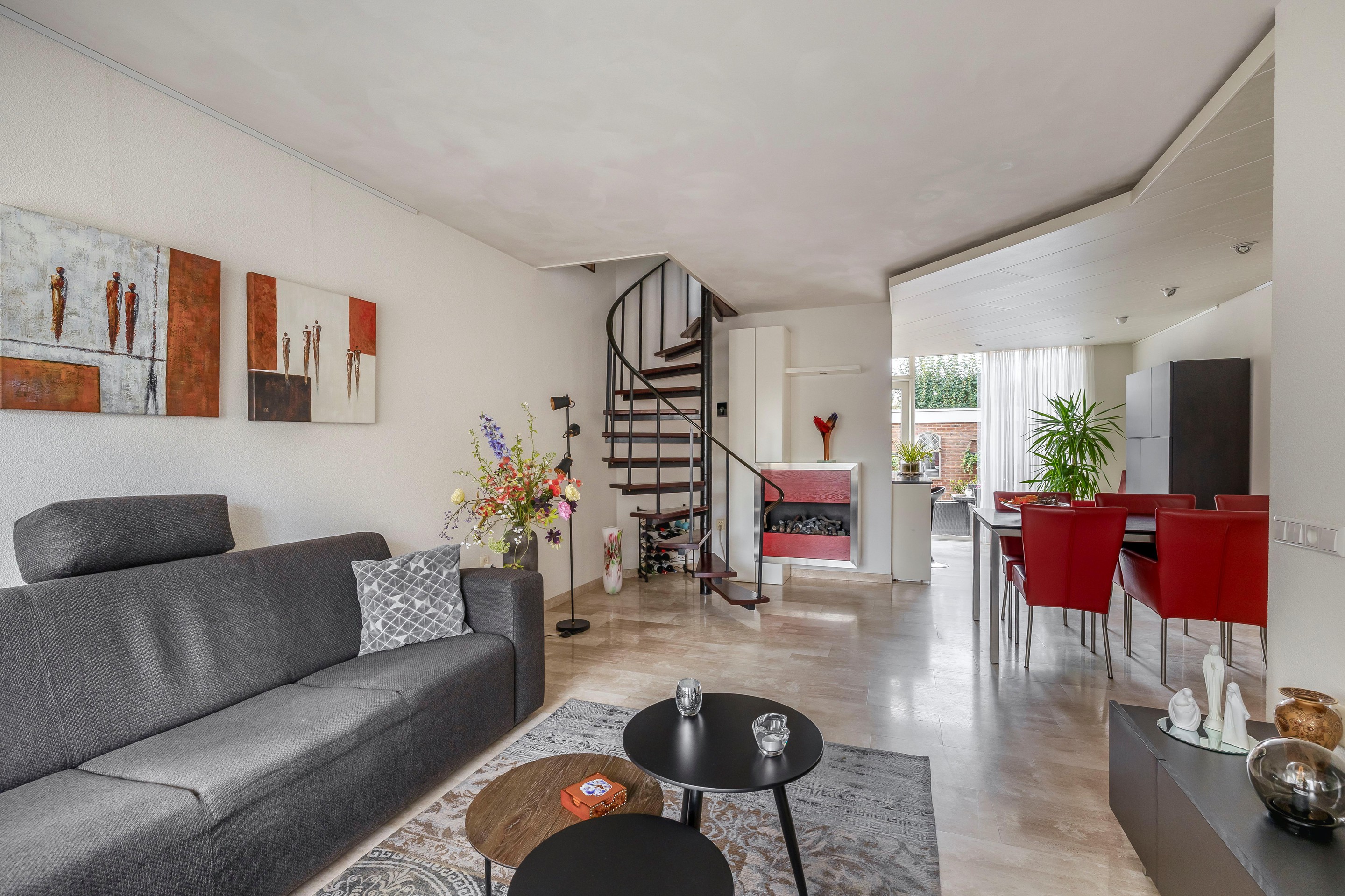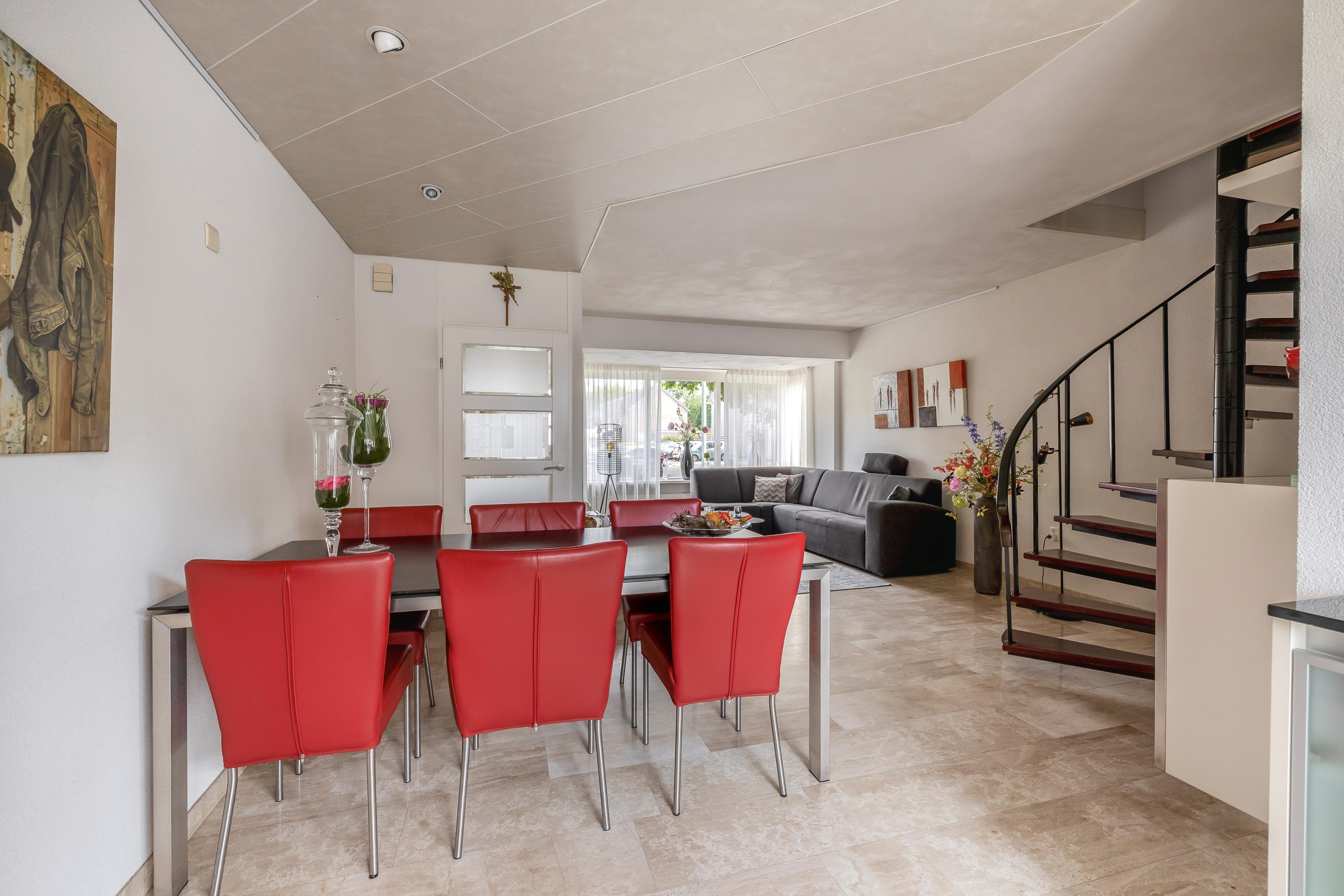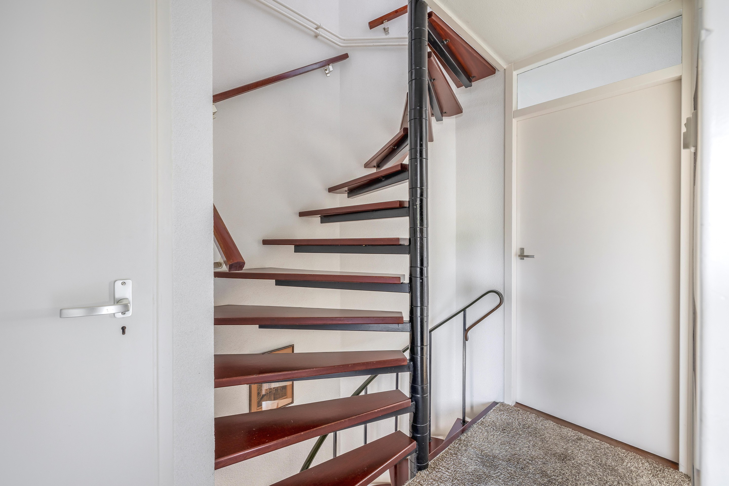 Een spiltrap geeft vanuit de woonkamer toegang tot de eerste verdieping.