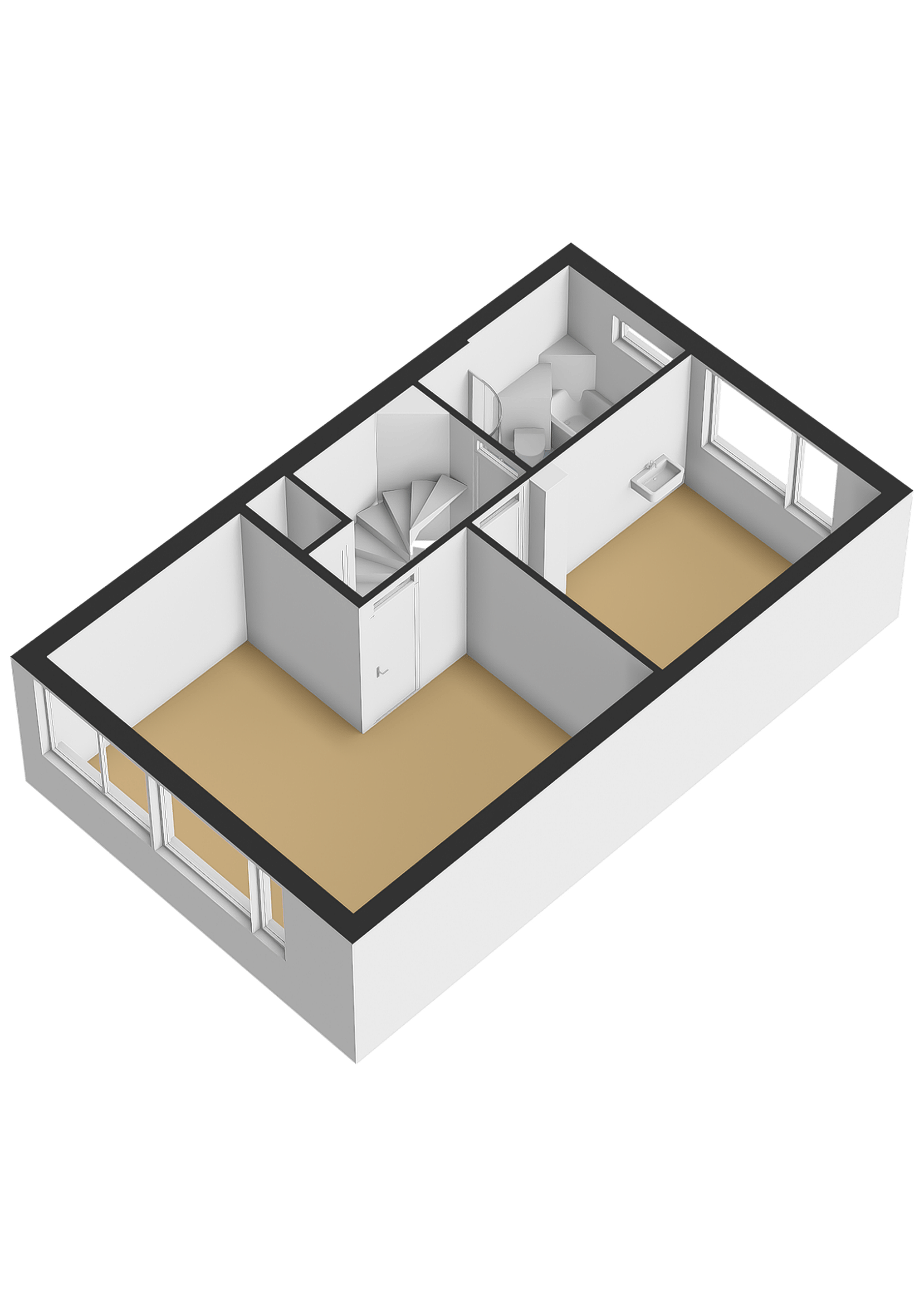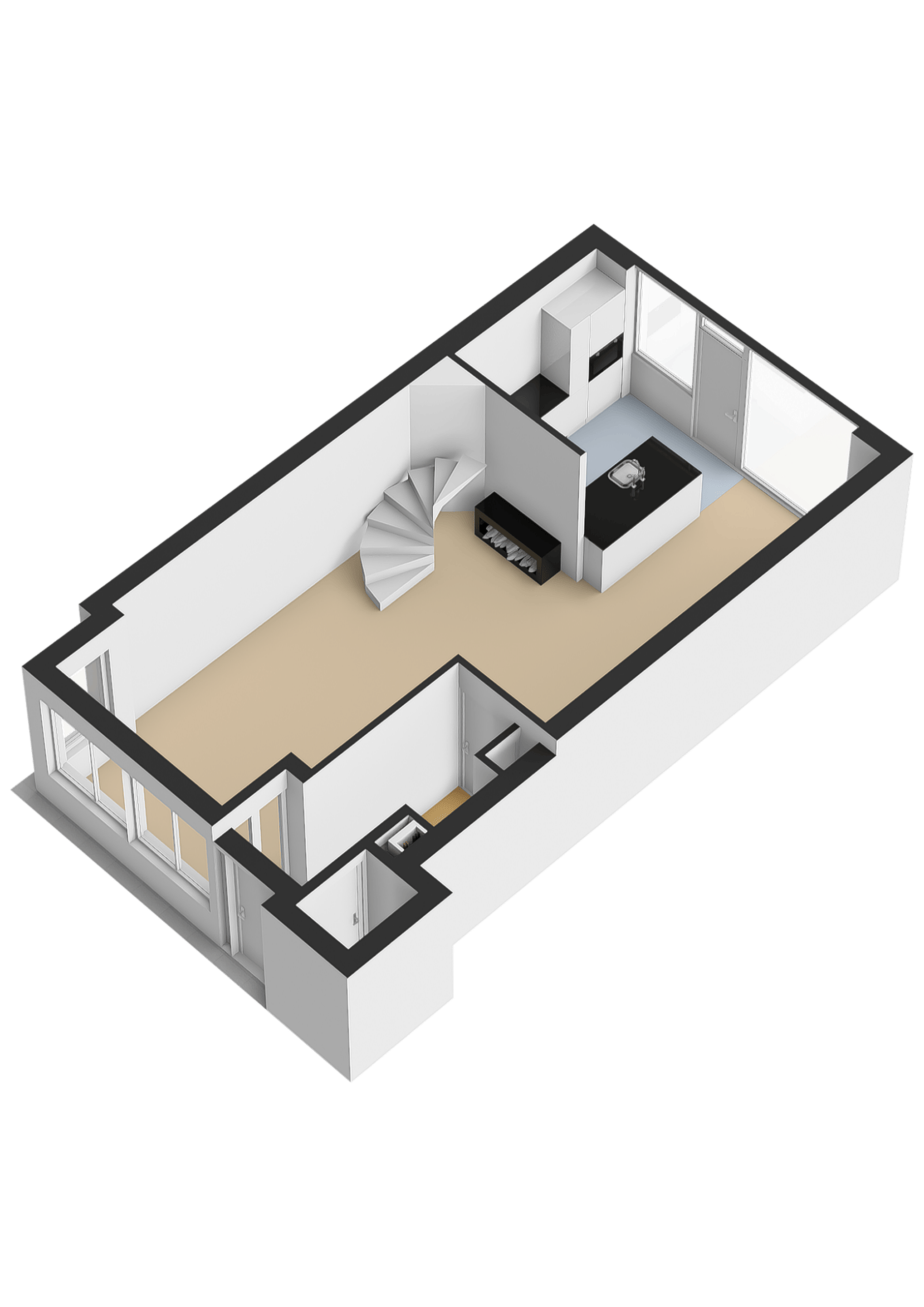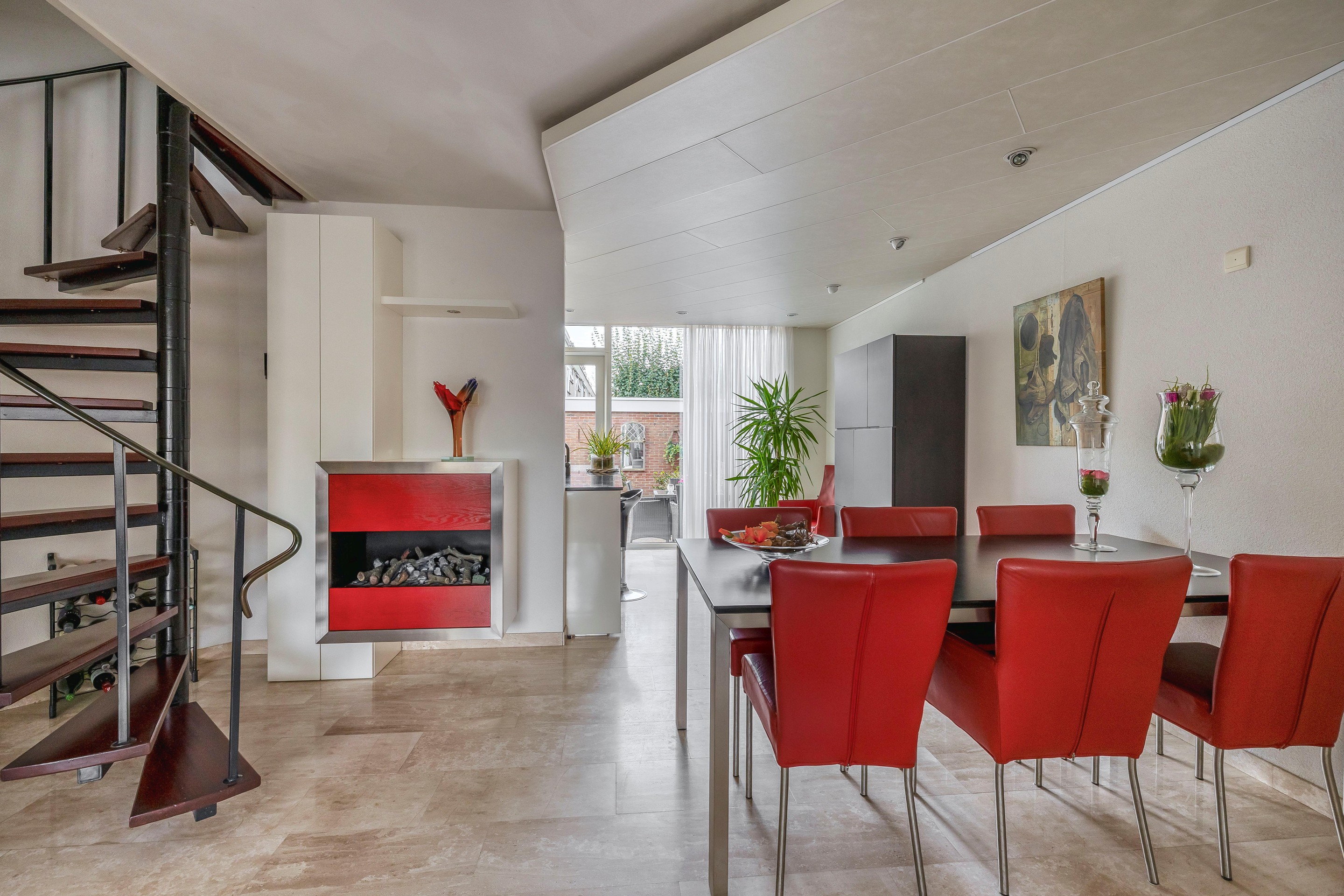 Een spiltrap geeft vanuit de woonkamer toegang tot de eerste verdieping.