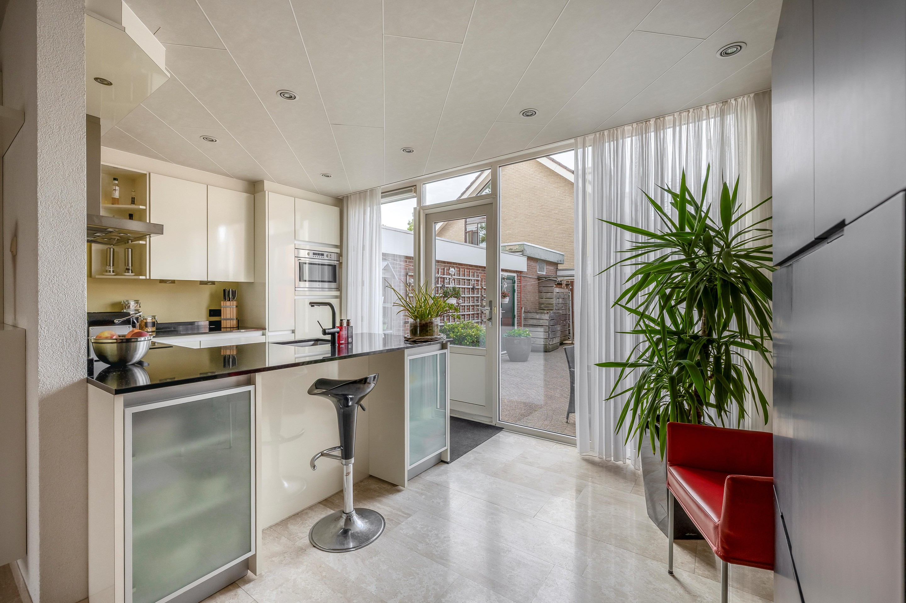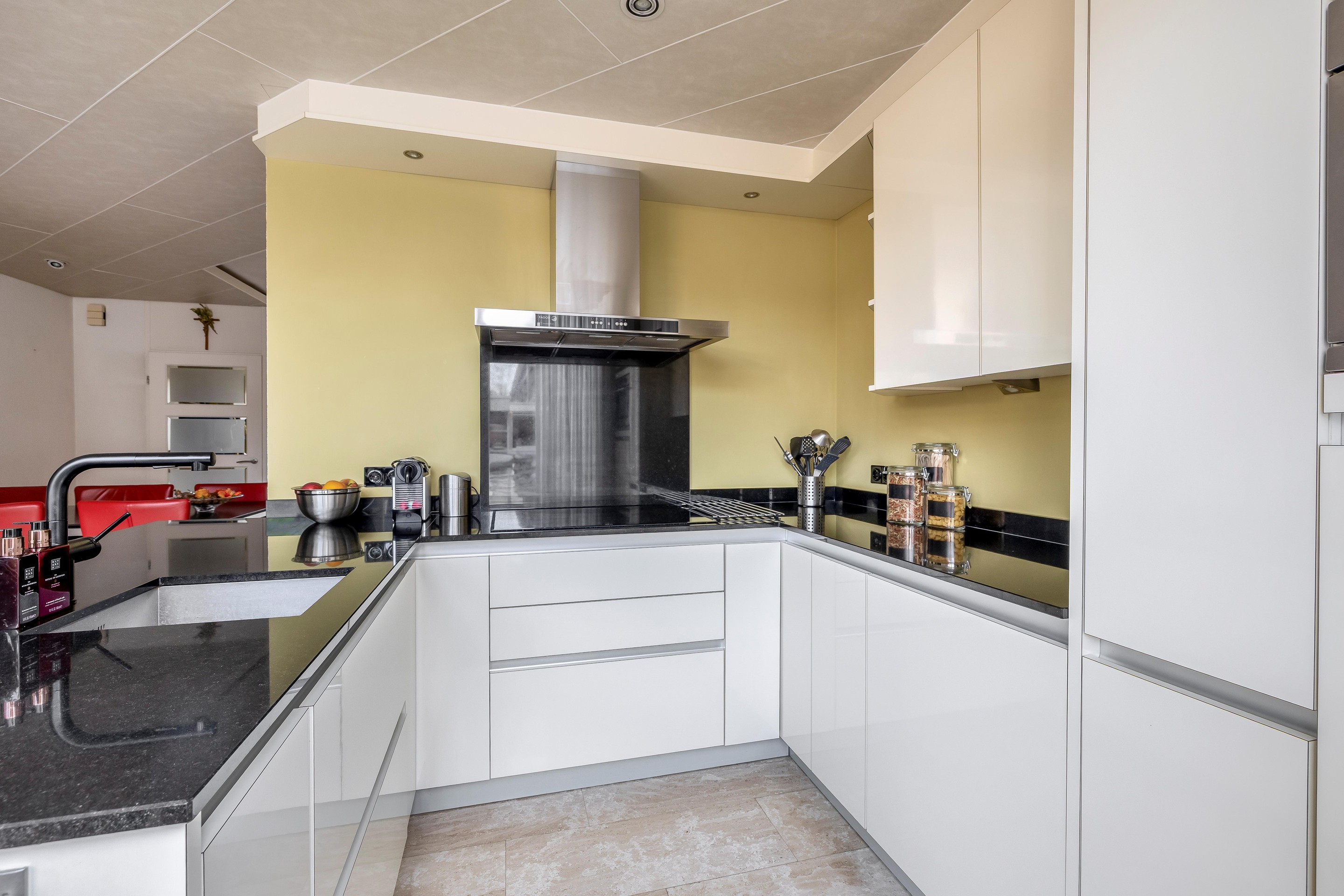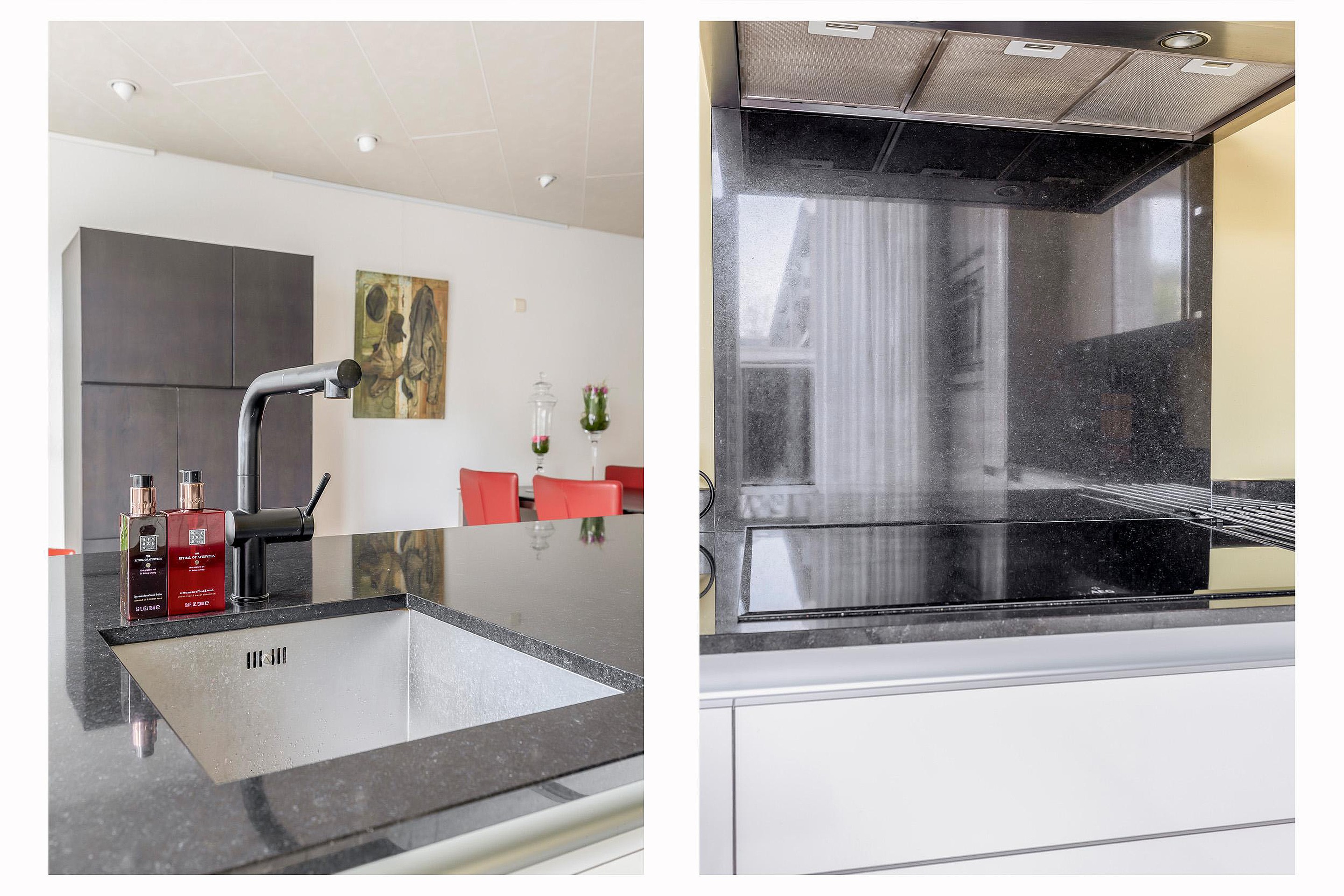 De keuken bevindt zich aan de achterzijde en is U-vormig opgesteld. Door de grote raampartij met ramen tot op de vloer is er veel lichtinval vanaf deze zijde. De keuken beschikt over diverse apparatuur, zoals een vaatwasser, combi-oven, inductiekookplaat met afzuigschouw, close-in boiler en koelkast. De keuken is greeploos uitgevoerd en heeft een granieten werkblad. Zet een paar barkrukken aan het schiereiland, schuif erbij aan met een kop koffie en start je dag relaxed.