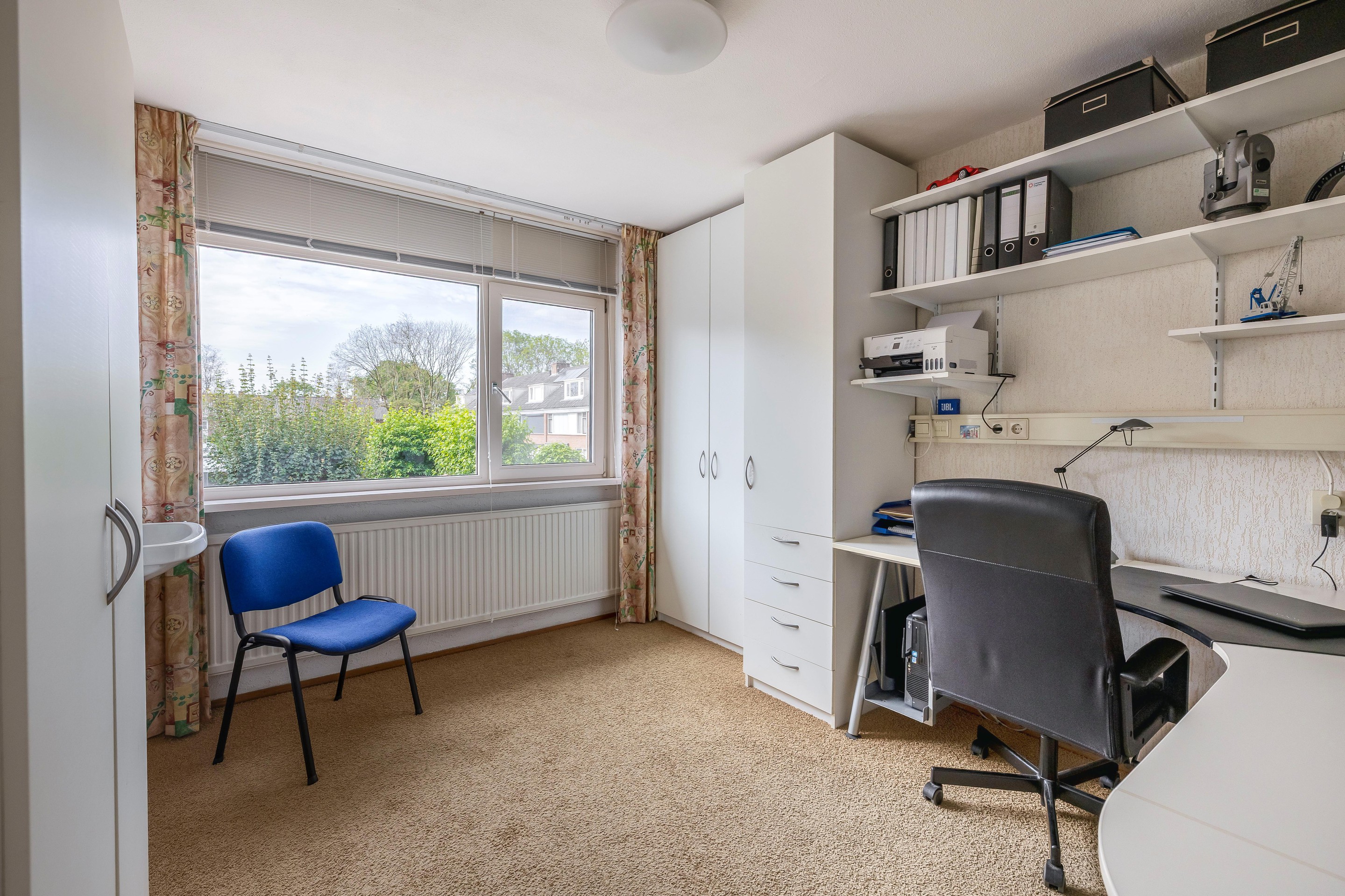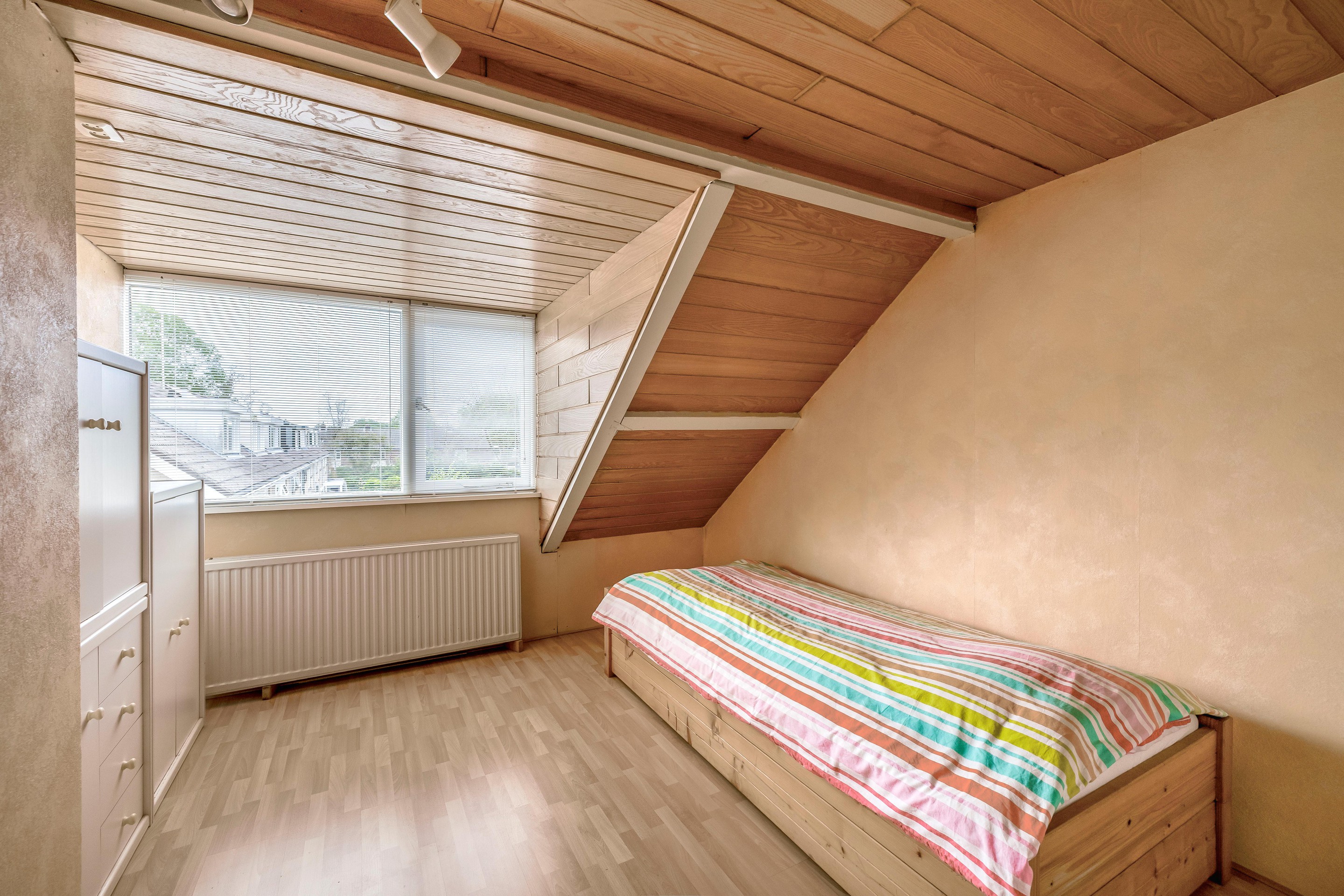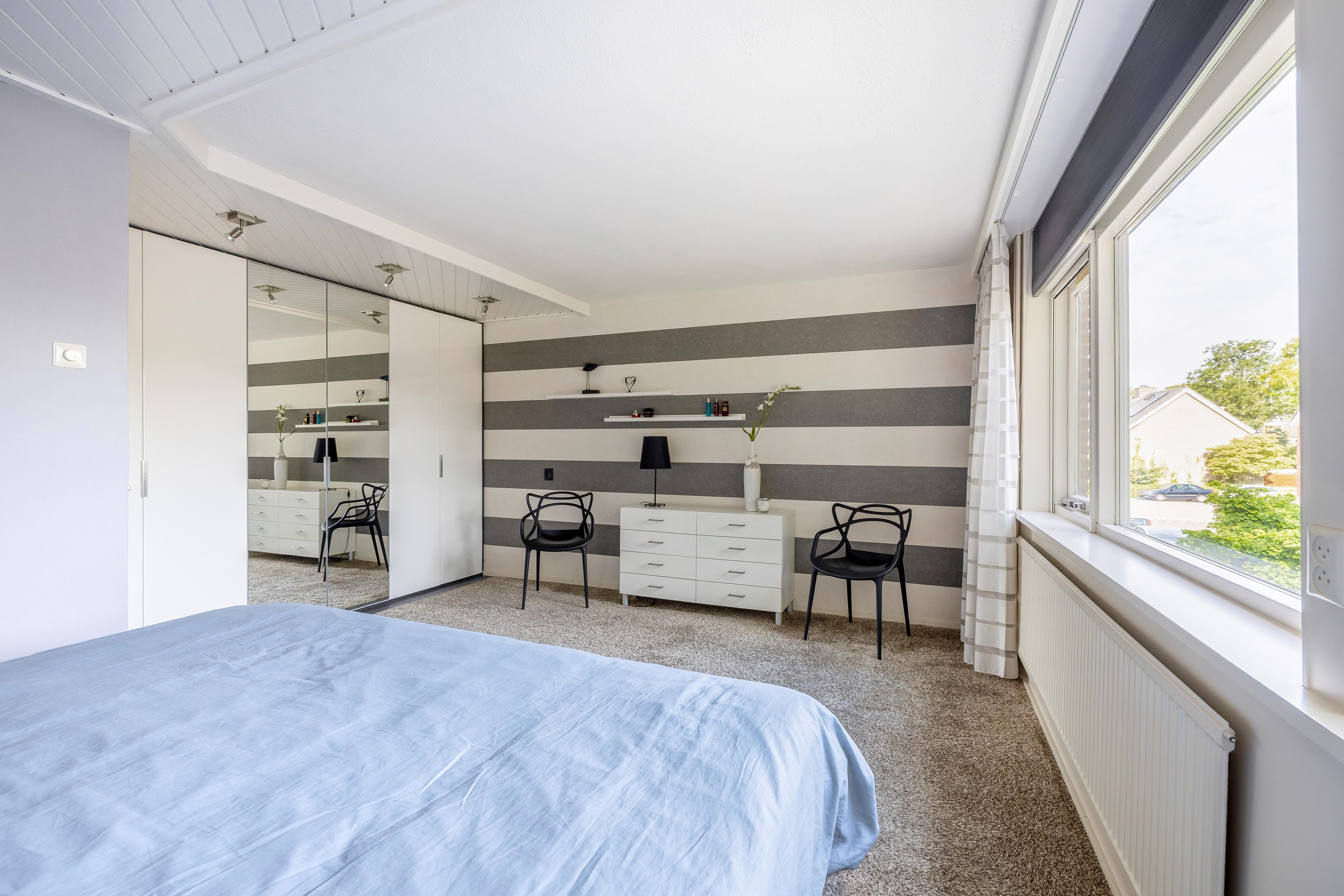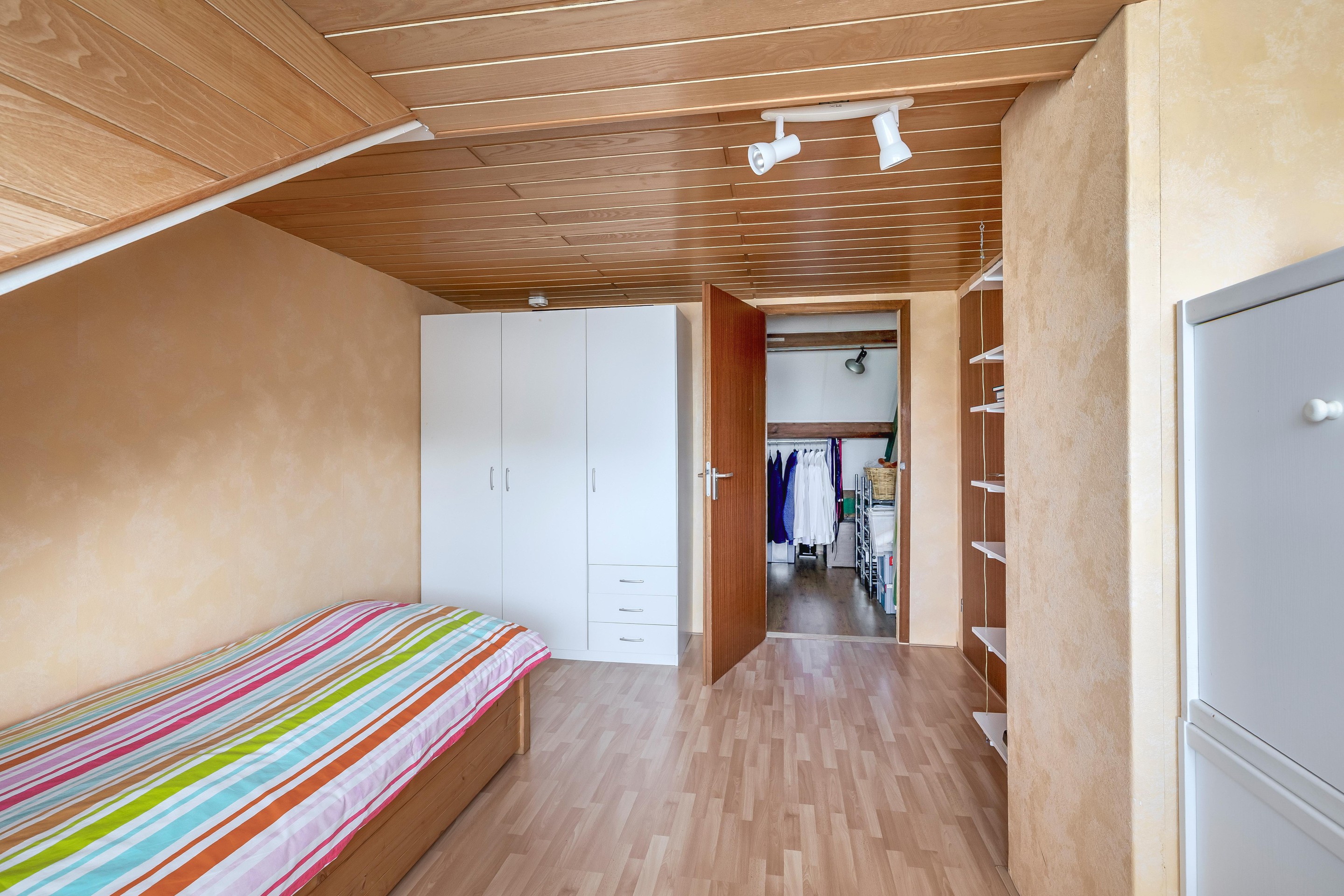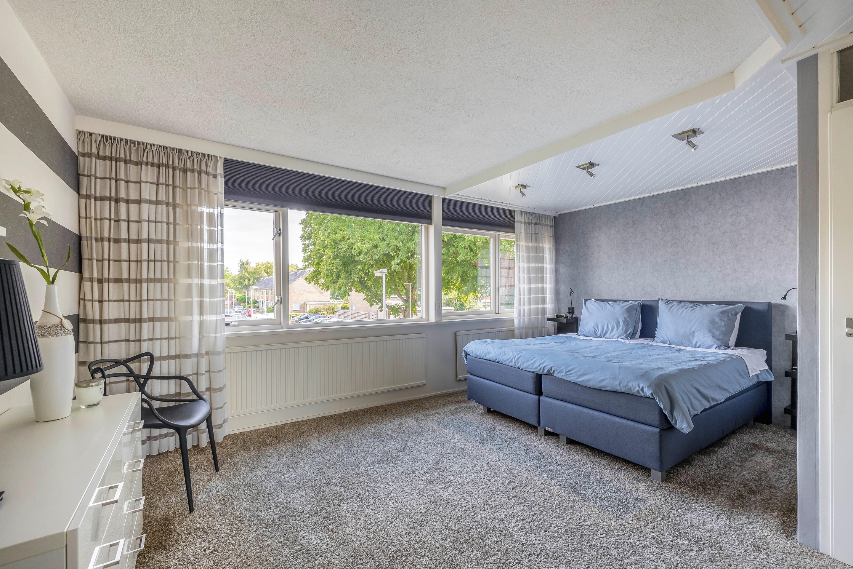 Eerste verdieping Op de eerste verdieping kun je alle kanten op. De grootste slaapkamer aan de voorkant – de masterbedroom – is echt riant en voelt als een luxe hotelkamer. Door de samenvoeging van twee kamers is er maar liefst zo’n 21m2 aan ruimte, compleet met kastenwand en een plafond met spots. Nooit meer stoeien met te weinig kledingruimte! De kamer aan de achterkant heeft een eigen wastafel – ideaal voor de kinderen of gasten, zeker in de drukke ochtenden.
