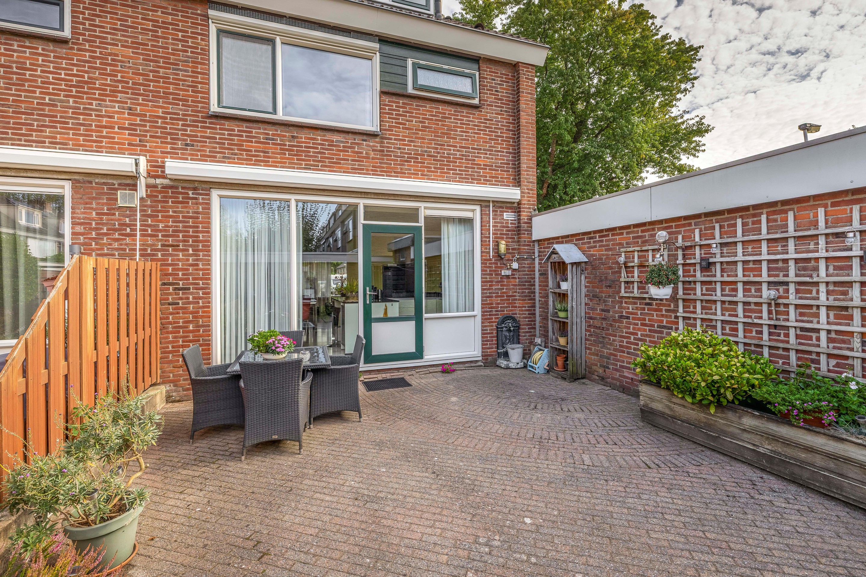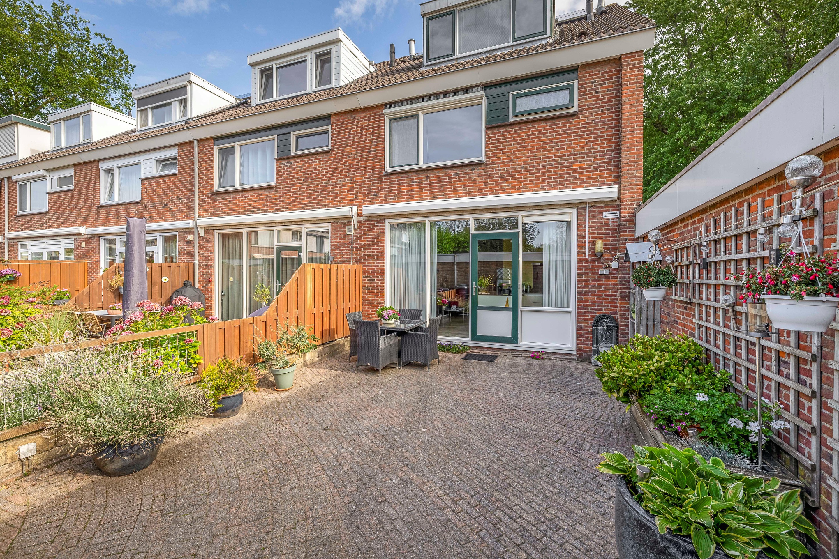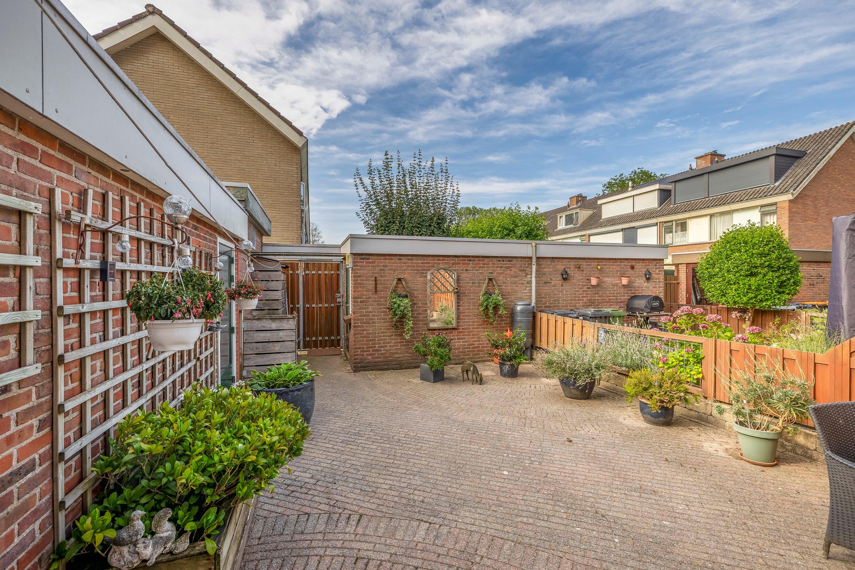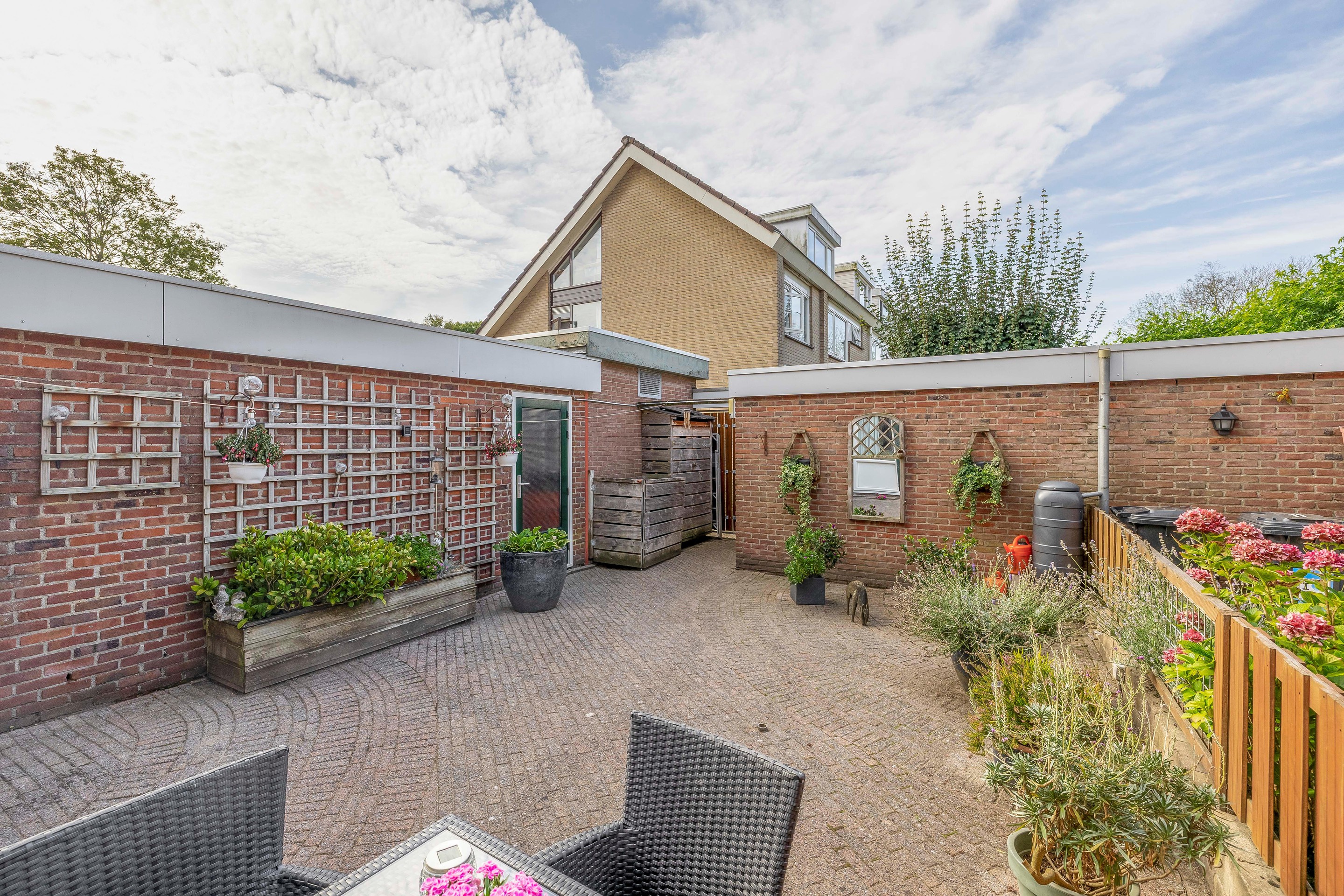 Tuin De tuin ligt op het zuiden en is daarmee de gehele dag zonnig. Aan de gevel van het huis is een elektrisch bediend zonnescherm bevestigd. De tuin is geheel voorzien van sierbestrating , er is een buitenkraan en achter in de tuin staat een stenen berging welke is voorzien van elektra. Er is een achterom aanwezig.