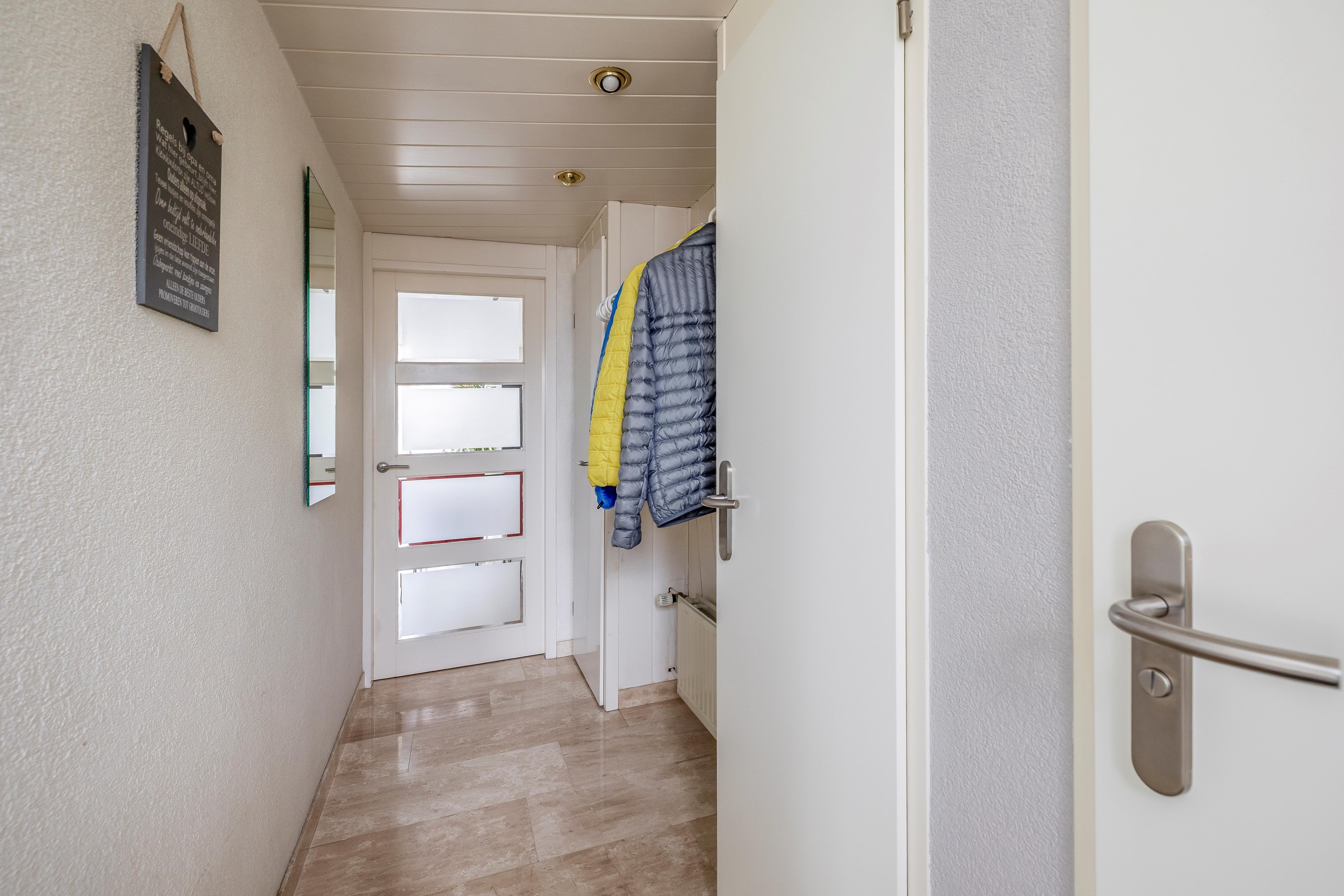 Begane grond Je komt deze woning binnen in een gang met aan de rechterzijde de toiletruimte met vrij hangend closet en fontein, vervolgens de moderne meterkast met 8 groepen en aparte kookgroep. Er is daarnaast plek om jassen op te hangen en de praktische vaste kast houdt het mooi opgeruimd.