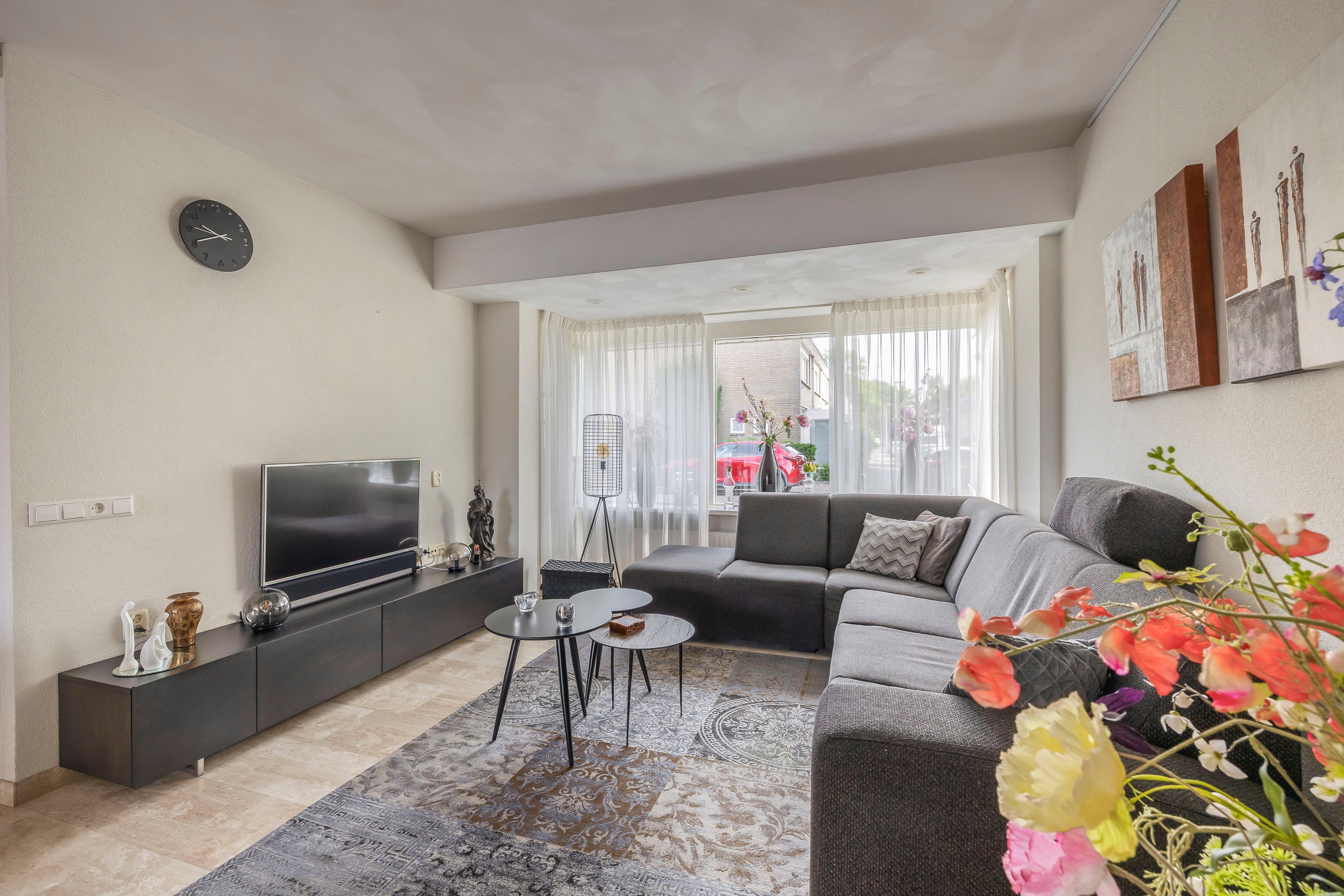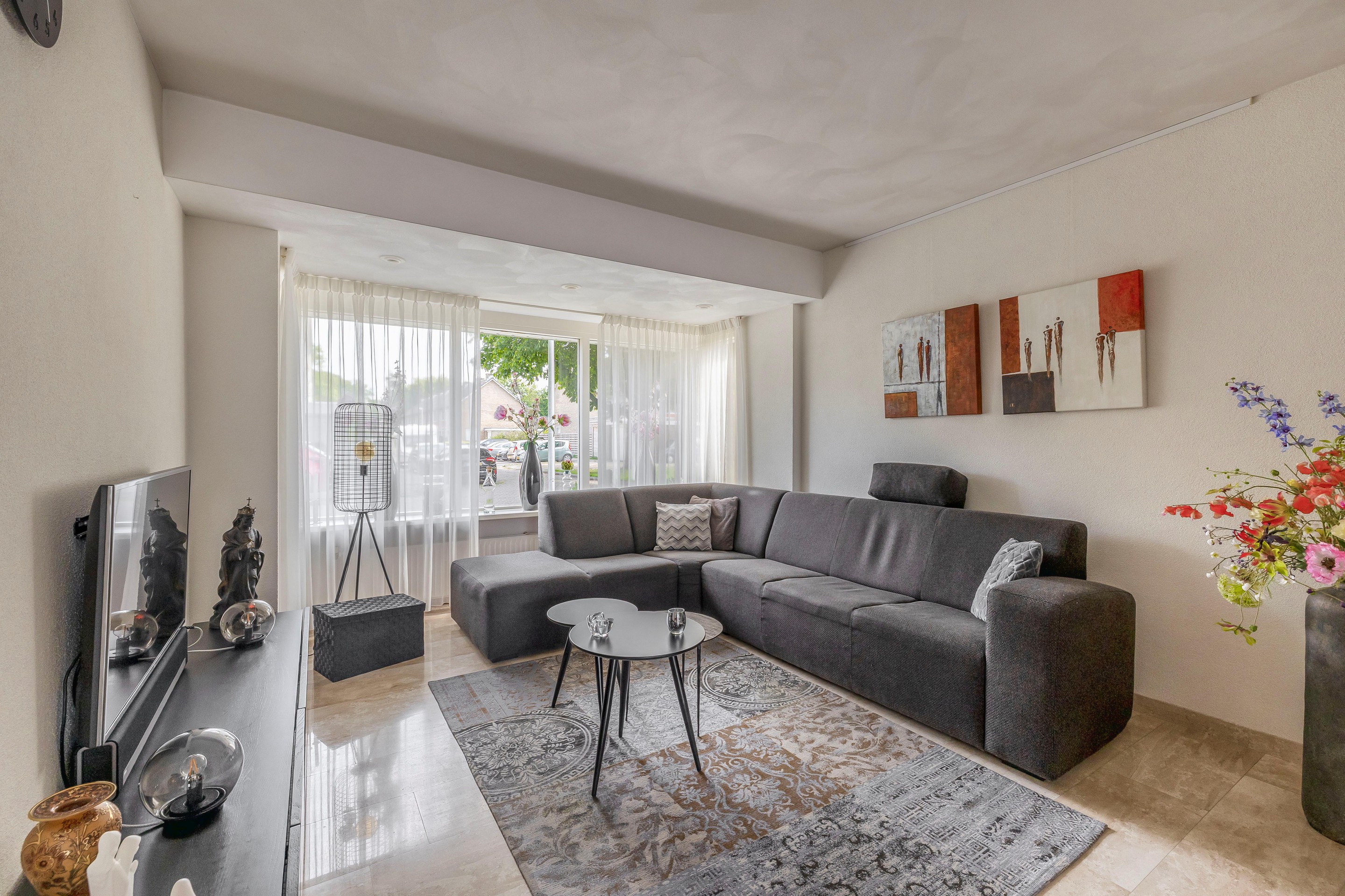 Het zitgedeelte bevindt zich aan de voorzijde. Loop door naar de Z-vormige woonkamer en wauw, wat een plek! Dankzij de erker aan de voorzijde geniet je van extra licht en ruimte – en kijk je vrij uit over de straat. Da’s nét dat beetje meer sfeer waar je blij van wordt.. In de vloer van de begane grond is vloerverwarming aangebracht en zijn marmer vloertegels toegepast. Het plafond is gedeeltelijk verlaagd en voorzien van inbouwspots. De Z-vormige woonkamer heeft samen met de keuken een totaal vloeroppervlak van ongeveer 43m2.