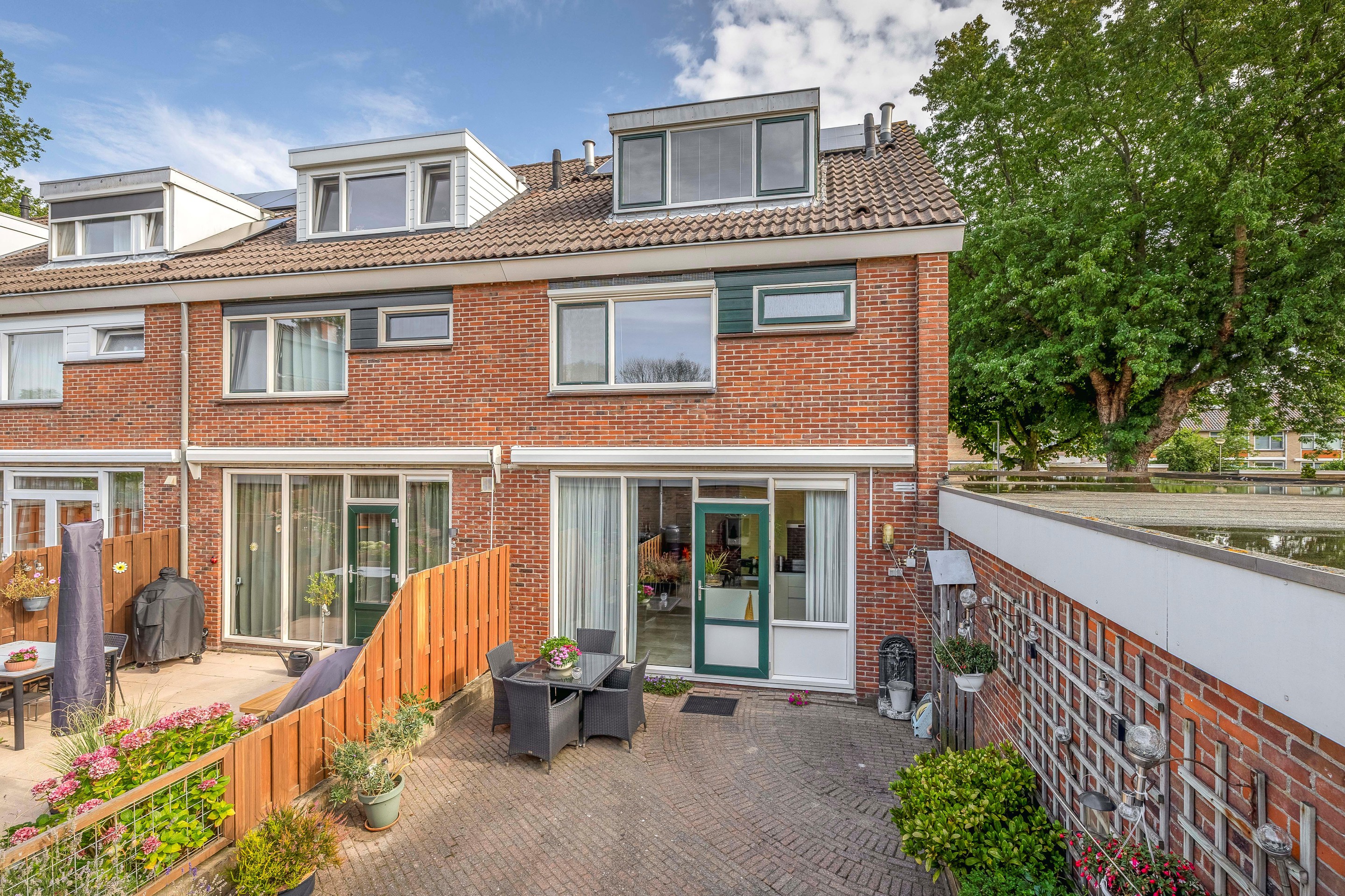 Voorgevel en dakkapel voorzien van houten kozijnen.