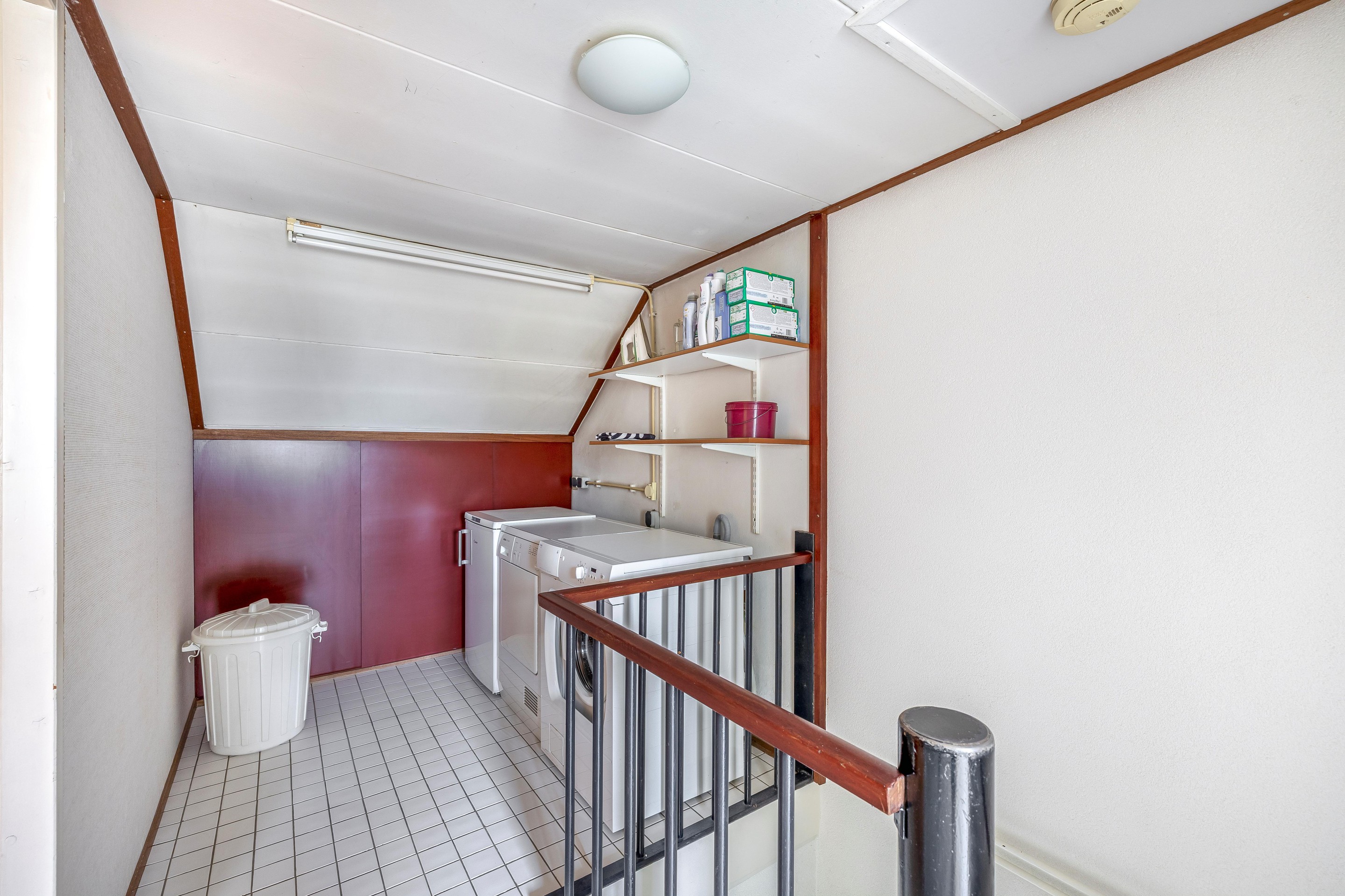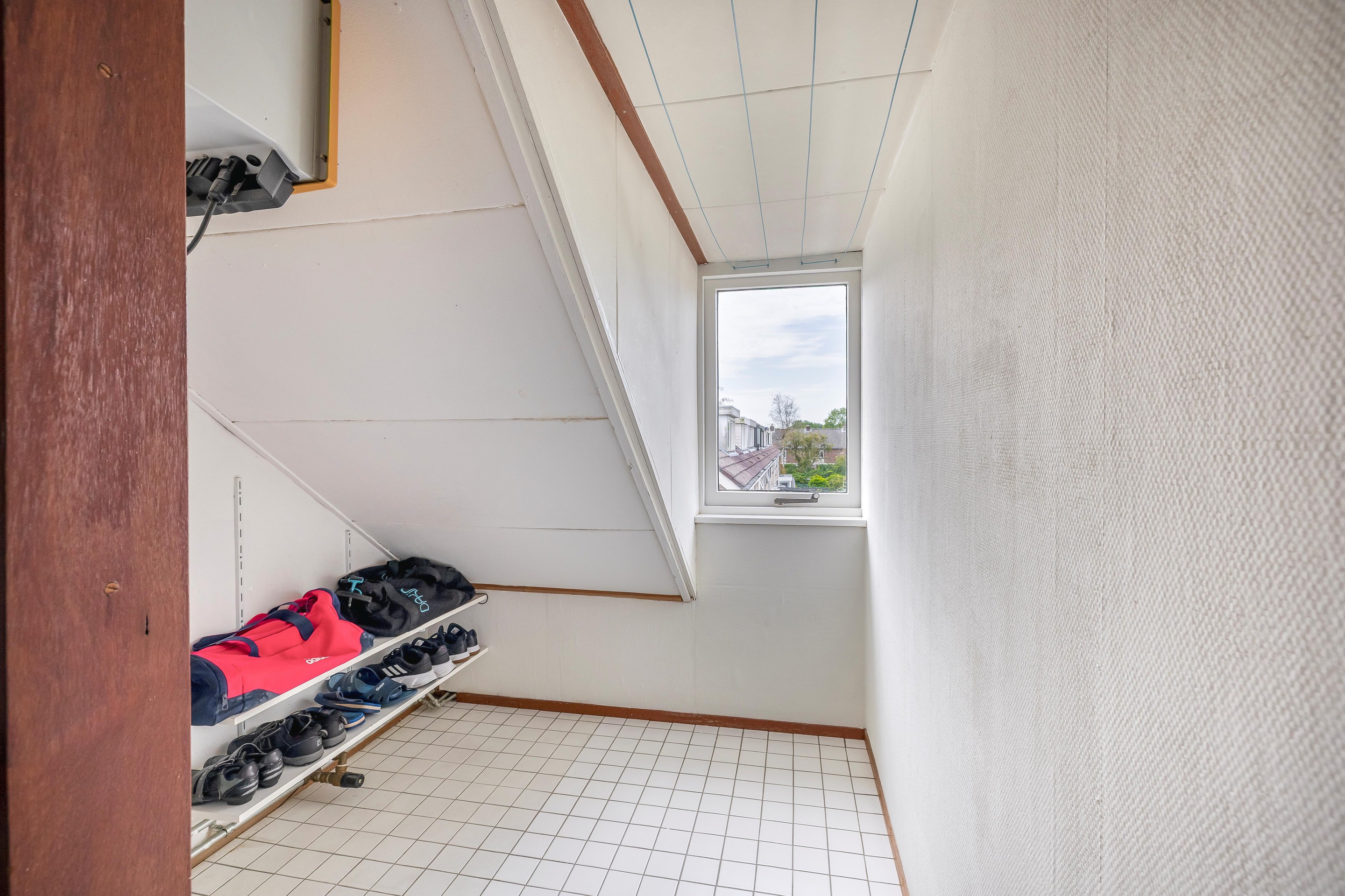 Tweede verdieping De tweede woonlaag heeft een ruime voorzolder, een slaapkamer en een royale opbergruimte. Op de voorzolder bevindt zich de omvormer van de zonnepanelen, CV-combiketel (bouwjaar 2016) en de wasmachineaansluiting. De vloer is heel praktisch voorzien van tegels. Aan de achterzijde is een brede dakkapel op het huis aanwezig. Deze dakkapel geeft licht en ruimte op de voorzolder en ook in de slaapkamer. Vanuit de slaapkamer geeft een deur toegang tot een flinke opbergruimte. En als dat nog niet genoeg is dan is er boven de slaapkamer bovendien een opbergvliering welke via een luik toegankelijk is.