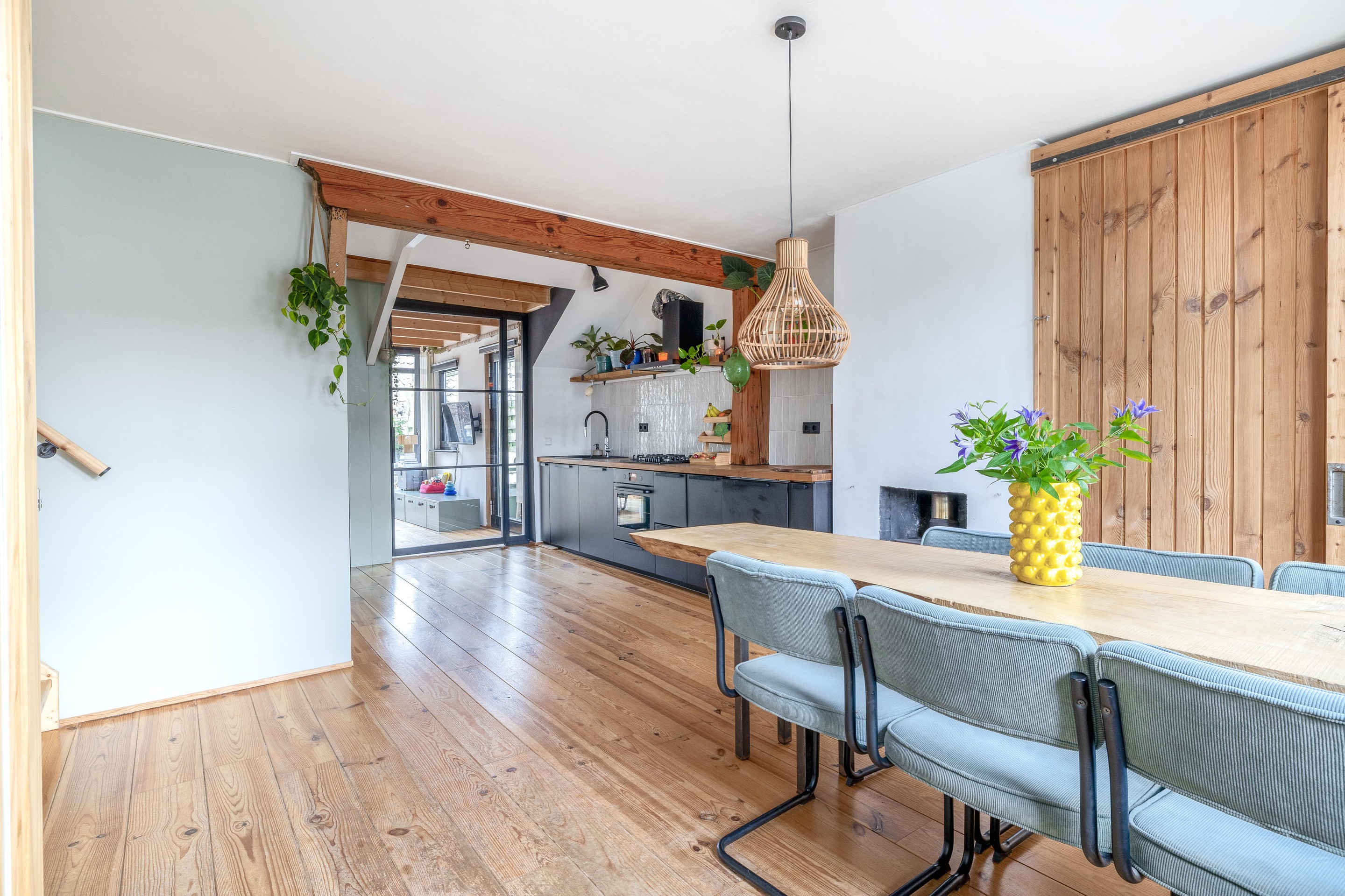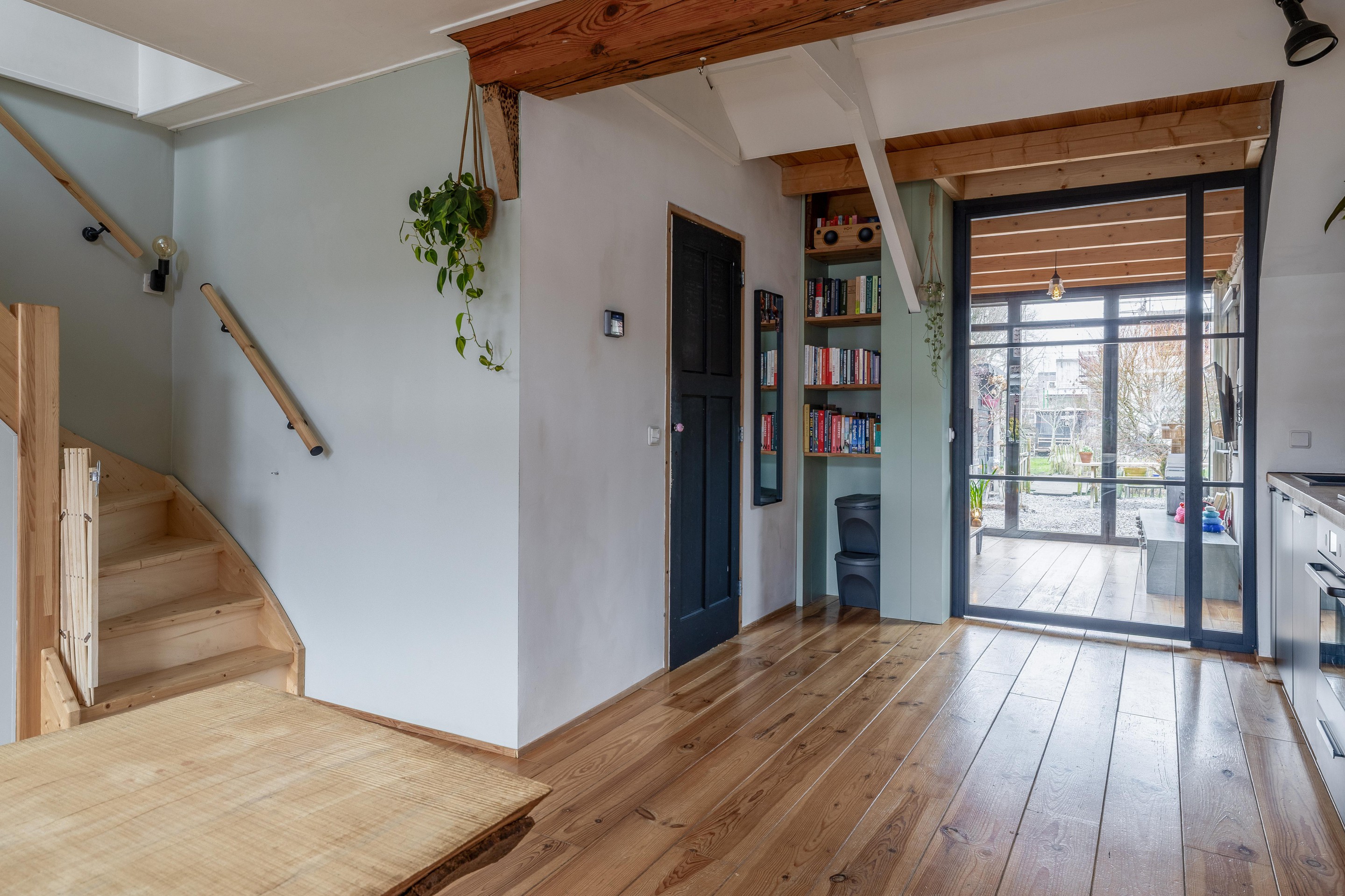 Binnen wordt u verwelkomd in een woning die met zorg is gemoderniseerd zonder haar authentieke sfeer te verliezen. De voorzijde van het huis biedt plaats aan een royale woonkeuken en de badkamer. Aan de achterzijde is de woning over de volle breedte uitgebouwd met een glazen gevel, waardoor de woonkamer baadt in het daglicht en u een prachtig vrij uitzicht heeft op de tuin.