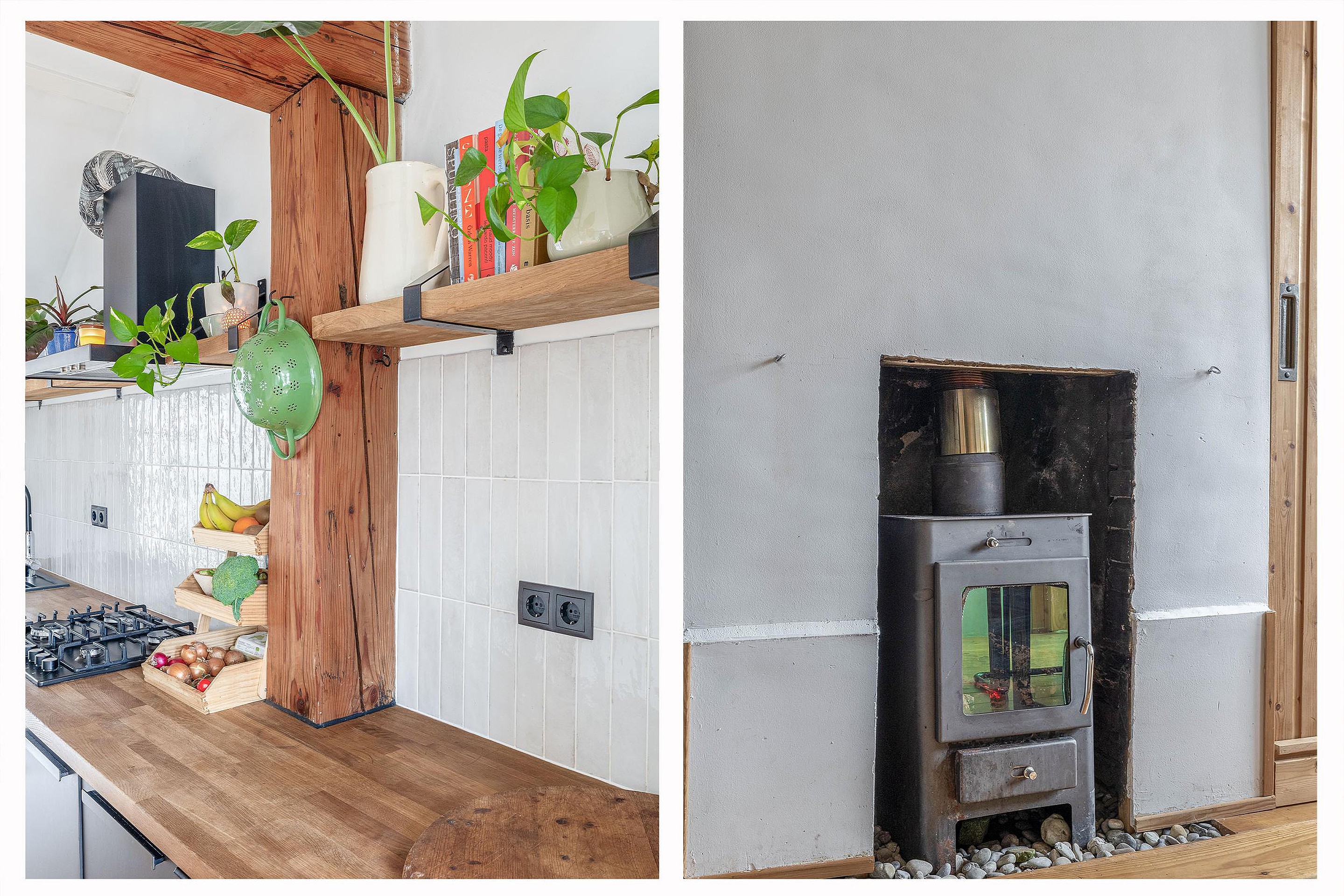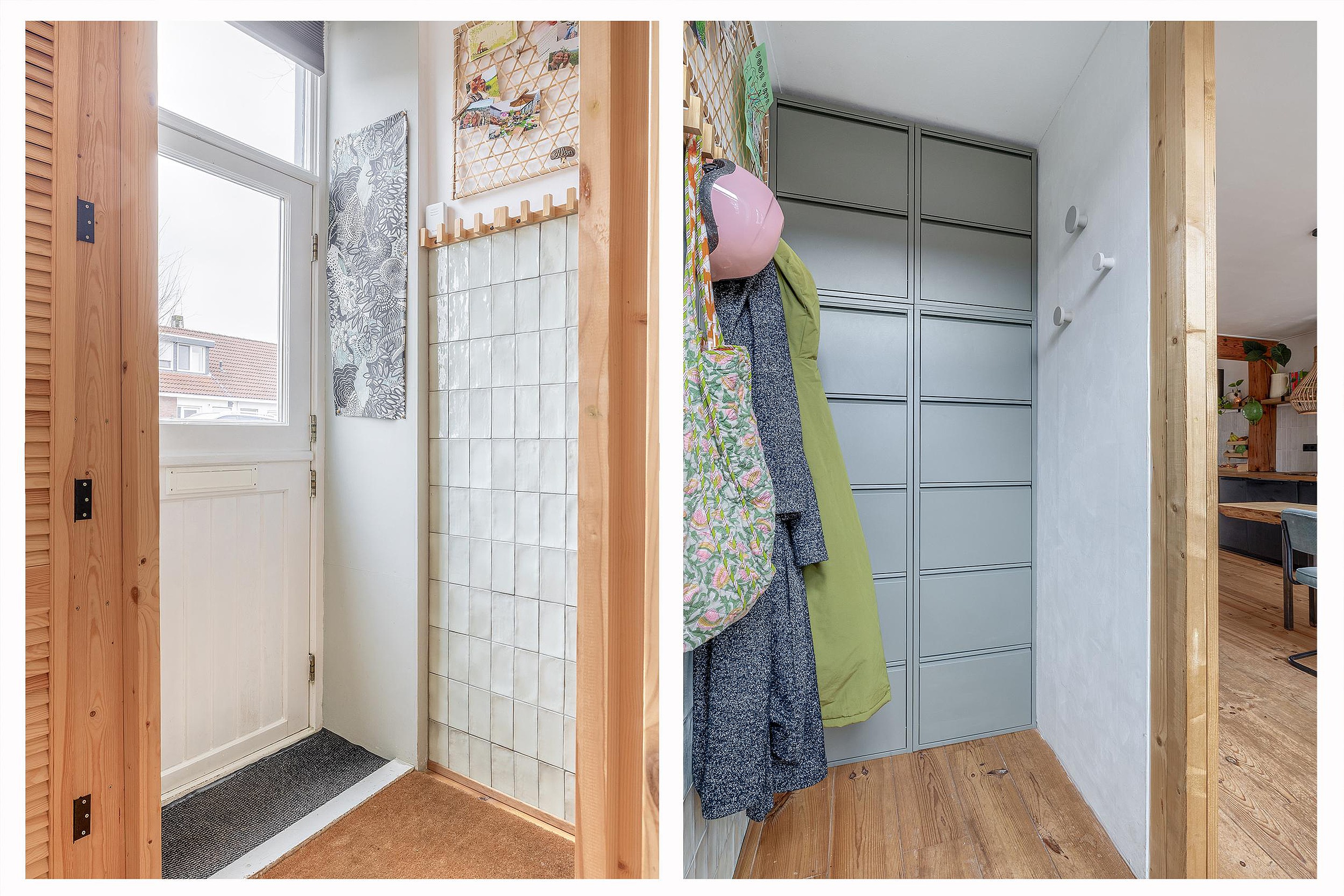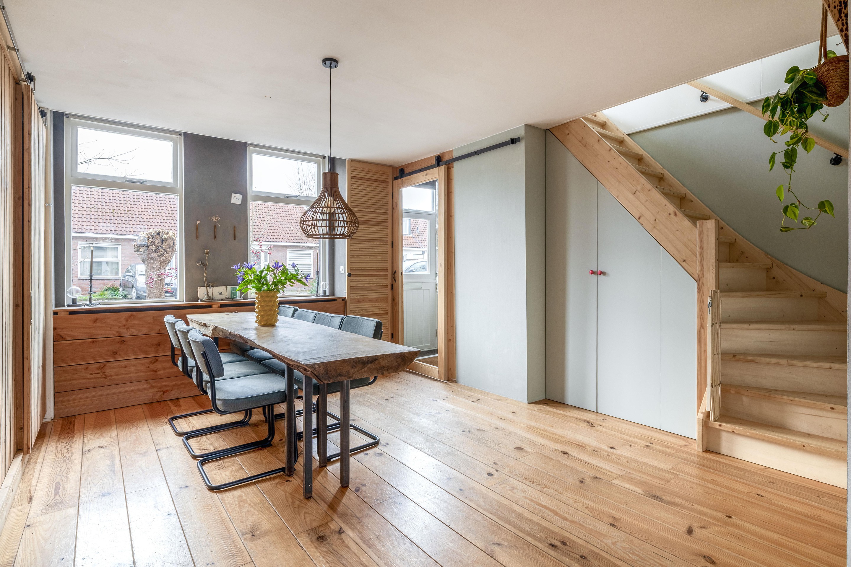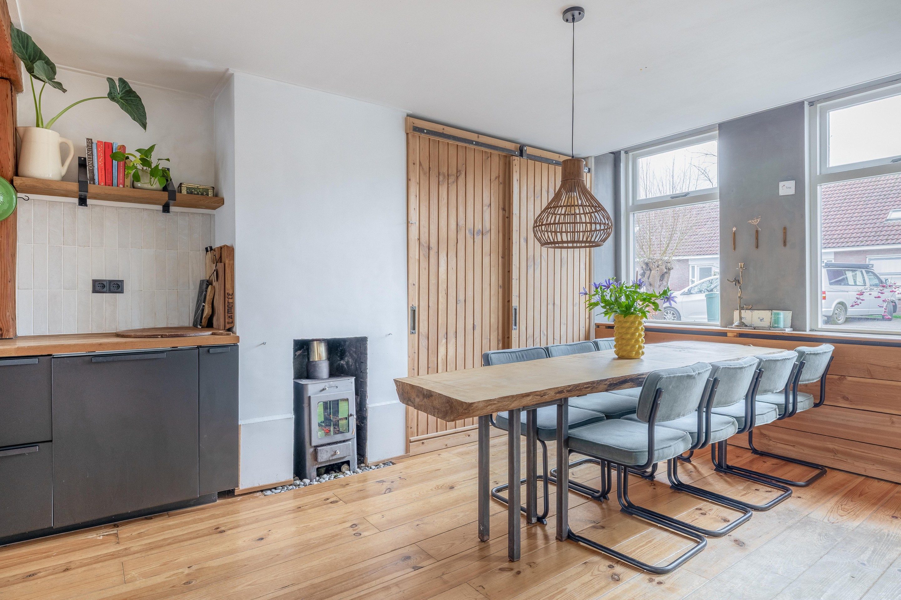 Bij binnenkomst via de voorzijde word je direct verwelkomd in een ruime entreehal. Vanuit hier stap je de lichte woonruimte binnen, waar aan de straatzijde volop plek is voor een gezellige eettafel met uitzicht op de buurt. Een bijzonder detail is de kleine houtkachel in het oude haardkanaal; een warme blikvanger die voor extra sfeer zorgt tijdens koude winteravonden.