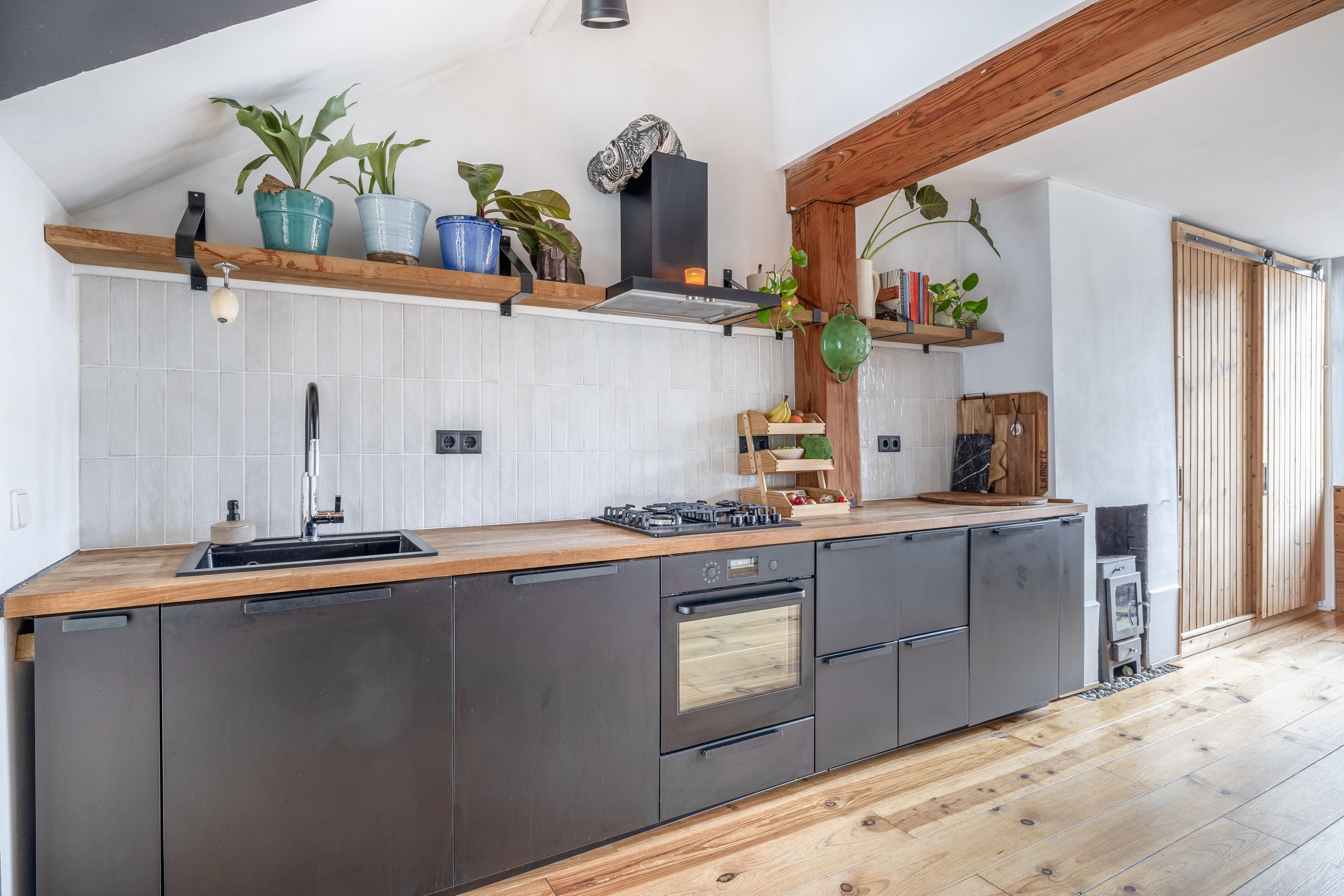 De keuken uit 2021 is uitgevoerd in een praktische, rechte opstelling en van alle gemakken voorzien, waaronder een oven, kookplaat, koelkast en een close-in boiler. Naast de keuken en onder de trap vind je een verrassend grote bergkast, ideaal voor al je voorraad en huishoudelijke spullen.
