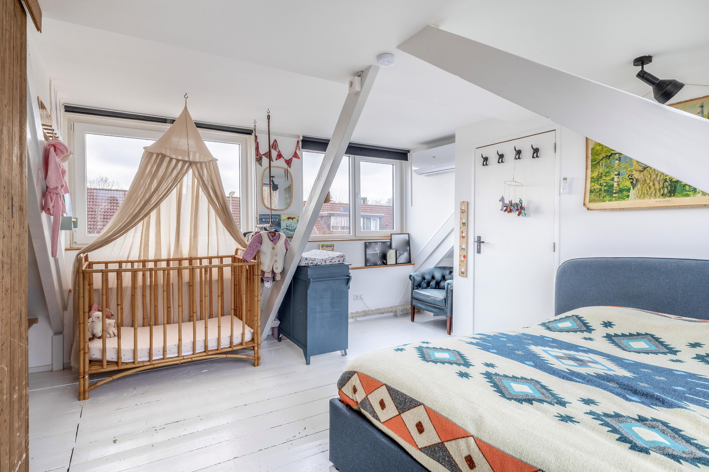 De trap leidt je direct naar de eerste verdieping, die momenteel is ingericht als één royale slaapkamer. Dankzij de twee dakkapellen geniet je hier van een prachtig uitzicht op het omliggende groen en de buurt. De kamer is uitgerust met een vaste kast en een moderne airconditioning (2024) voor een perfect klimaat in elk seizoen.
