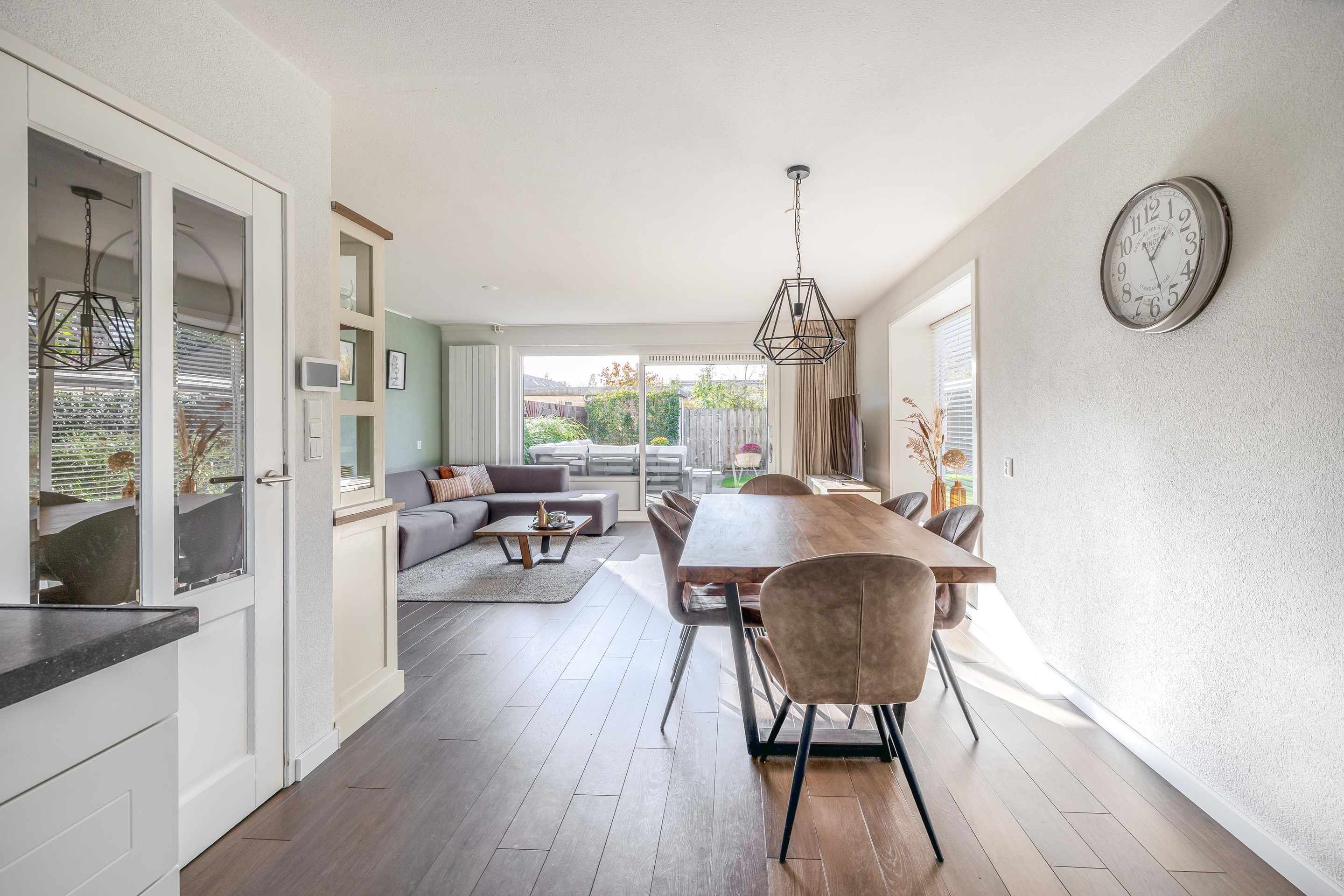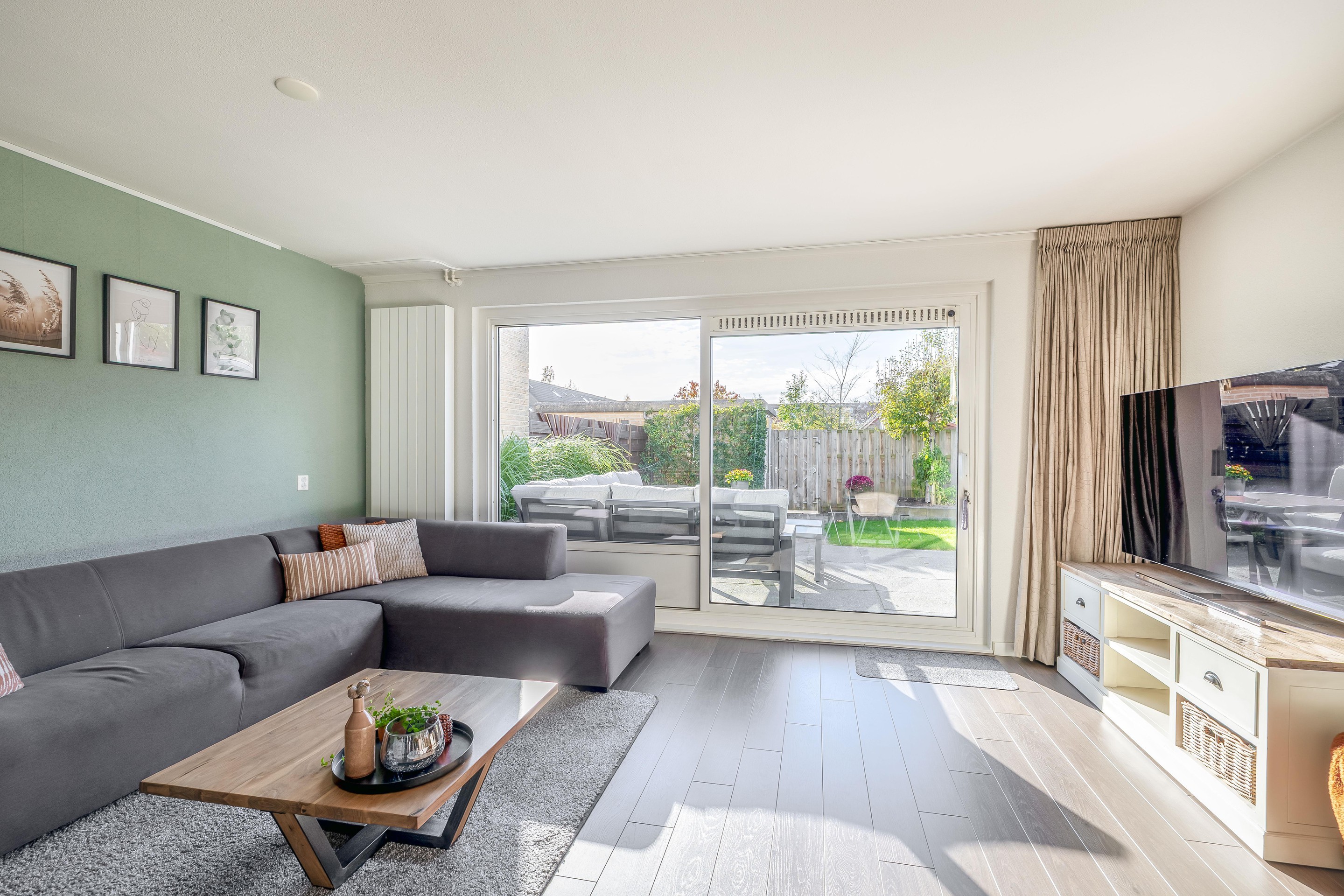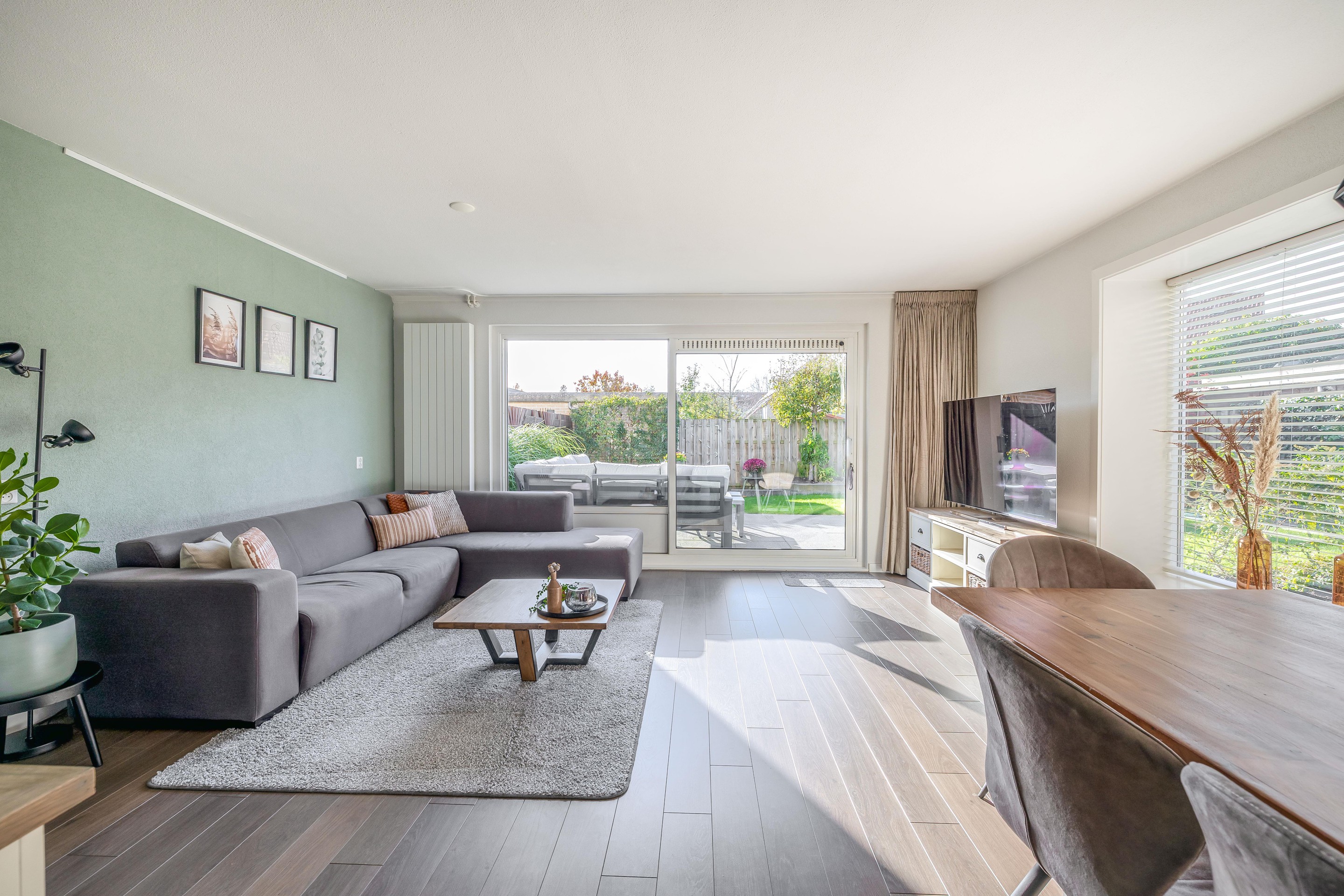 De woonkamer is tuingericht en heeft een oppervlakte van circa 29 m2. Ook hier zijn de wanden afgewerkt met spachtelputz en het plafond met spuitwerk. Bij binnenkomst valt meteen de hoeveelheid daglicht op! Dat komt door het grote zijraam in combinatie met de brede schuifpui aan de achterzijde. En niet onbelangrijk: vanuit de woonkamer heb je een leuk uitzicht op zowel de zij- als de achtertuin.