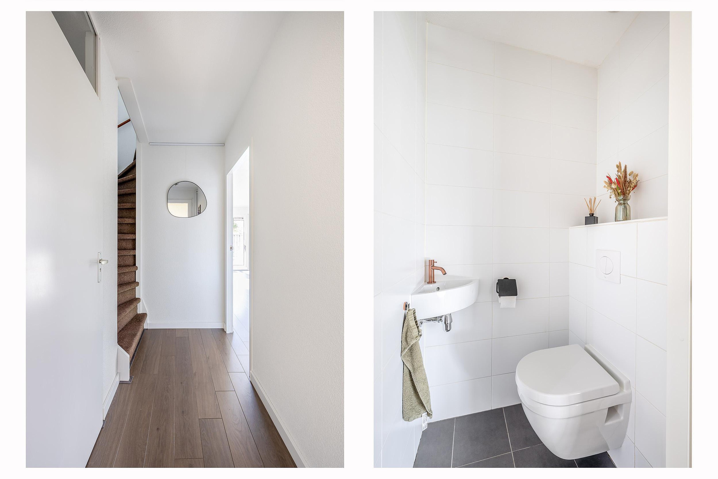 Begane grond Als je de woning binnenstapt, kom je eerst in de hal. Hier vind je de meterkast (modern uitgevoerd met 12 groepen), het toilet en de trapopgang naar de eerste verdieping. De hal en de gehele trapopgang tot aan de zolder zijn afgewerkt met spachtelputz op de wanden. De trappen zijn netjes bekleed en het plafond is voorzien van spuitwerk. De hele begane grond is afgewerkt met een keurige laminaatvloer. Het toilet is vernieuwd en voorzien van een vrijhangend closet en een fonteintje.