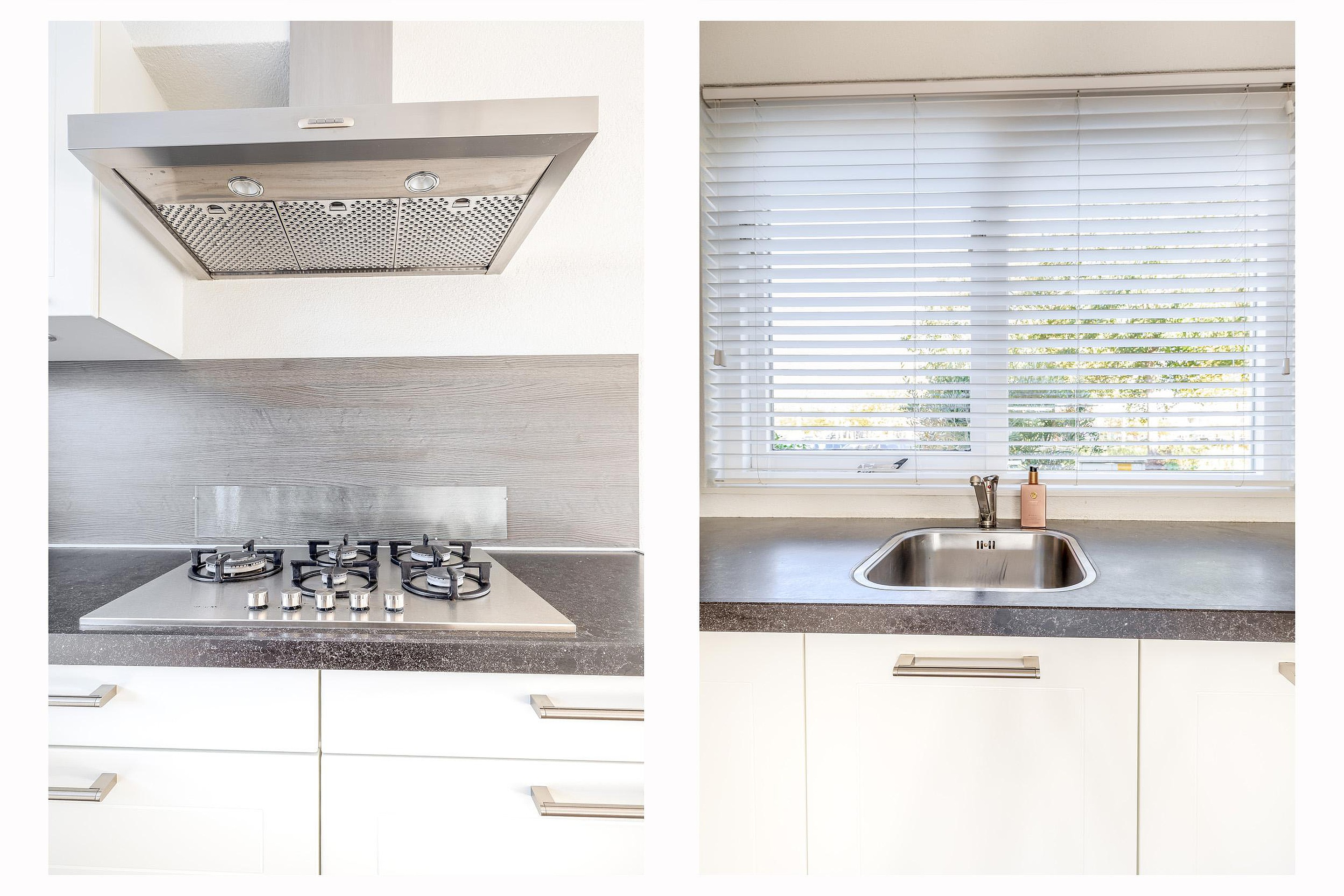 De woonkamer staat in open verbinding met de keuken. De keuken is geplaatst in een ruime L-vormige opstelling en is uitgerust met diverse inbouwapparatuur, waaronder een 5-pits kookplaat met afzuigkap, oven, vaatwasser en koel-/vriescombinatie. Vanuit de keuken heb je bovendien een prettig uitzicht over de straat en de singel.