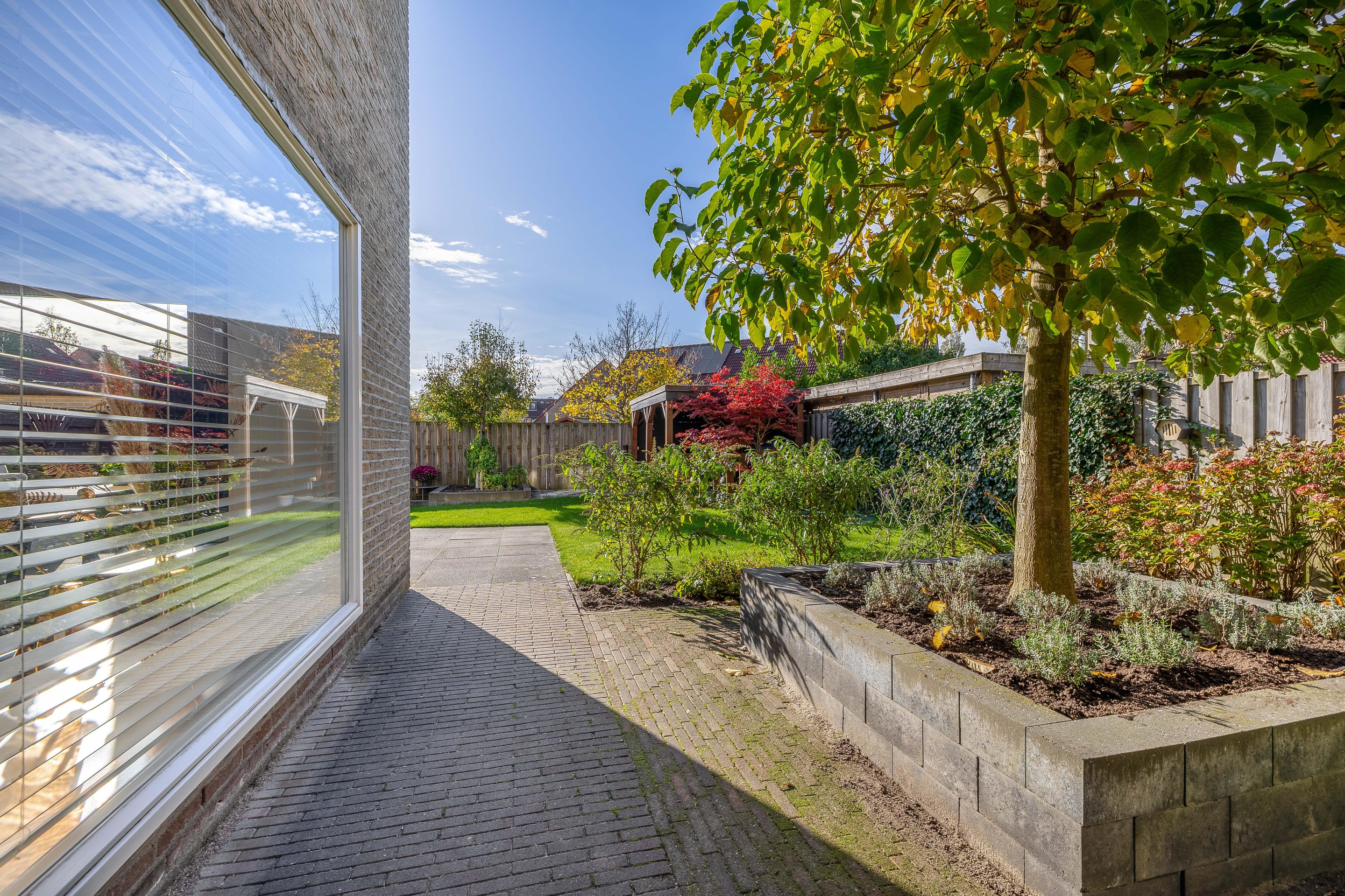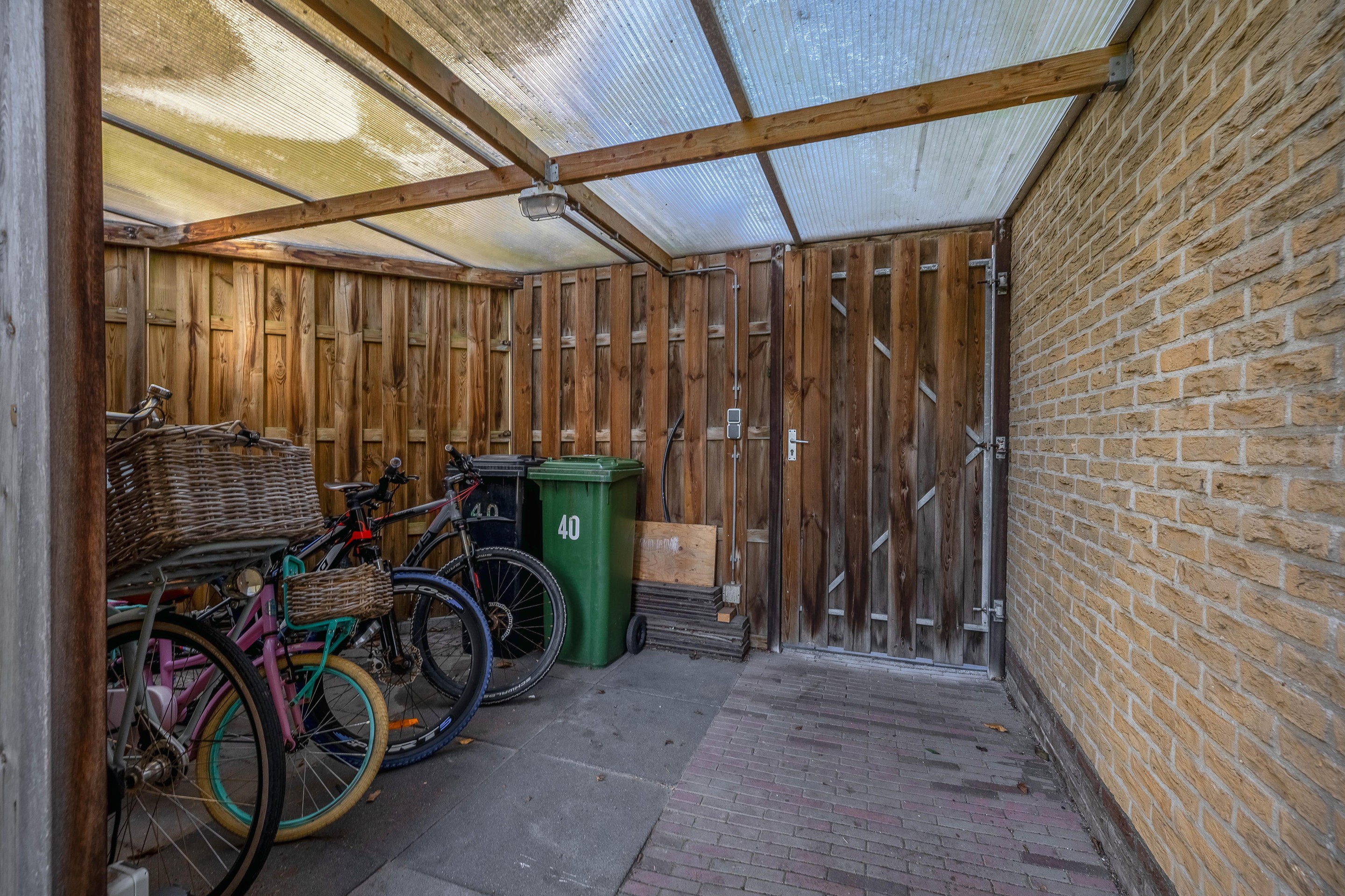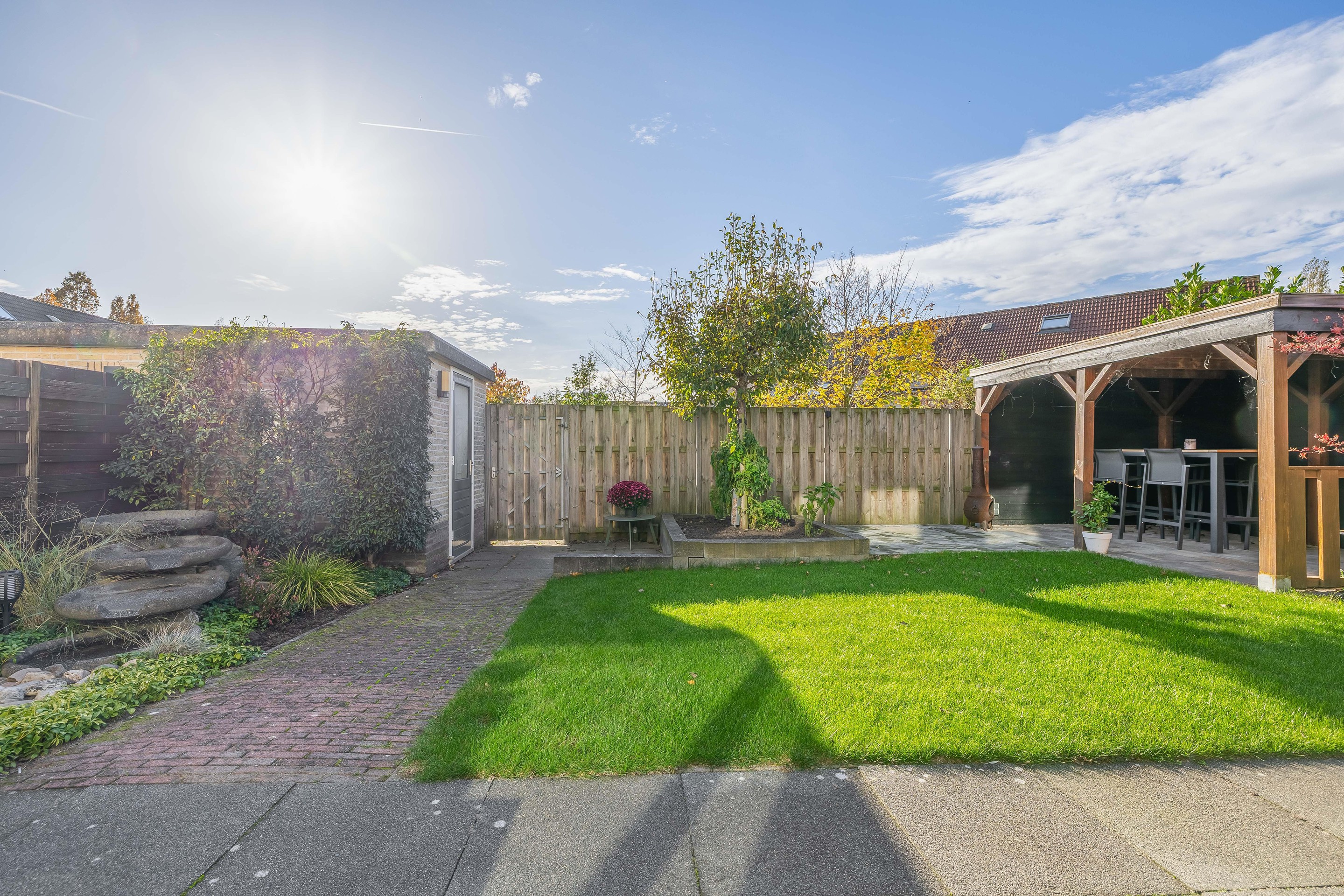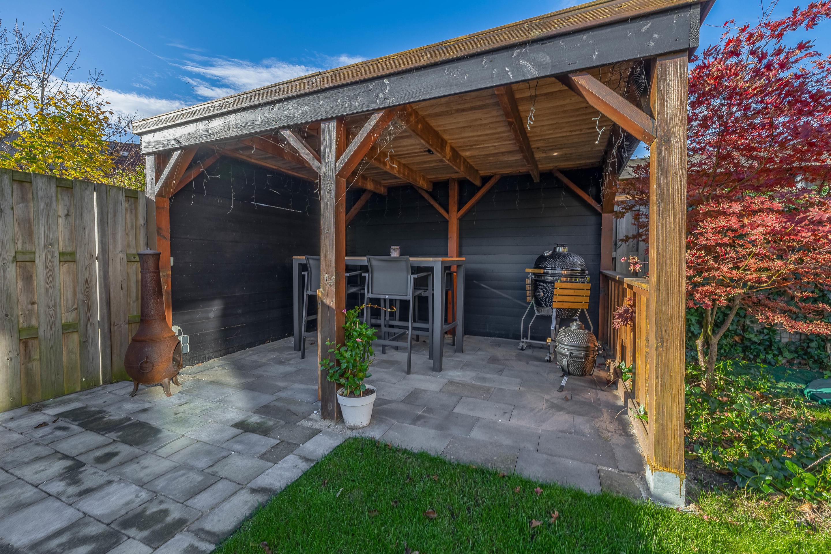 Achter in de tuin is een gezellige veranda gebouwd, waar je lekker kunt bbq’en of borrelen. De tuin is verder fraai aangelegd met een ruim terras, diverse beplanting en een stuk gazon. Aan de voorzijde, langs de zijkant van de woning, is een houten overkapping geplaatst die ideaal is voor het stallen van fietsen. Natuurlijk kun je die ook kwijt in de stenen berging achter in de tuin.