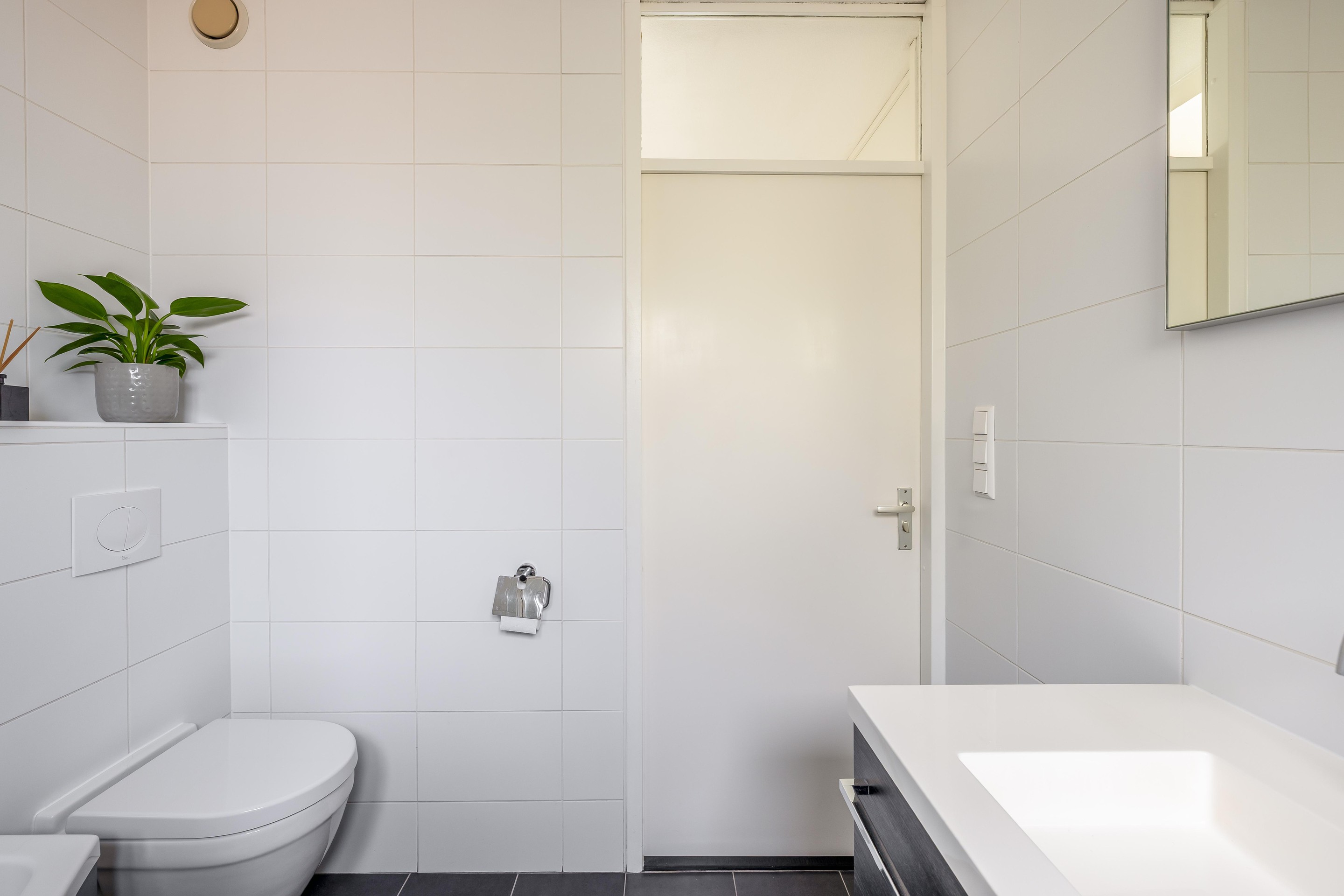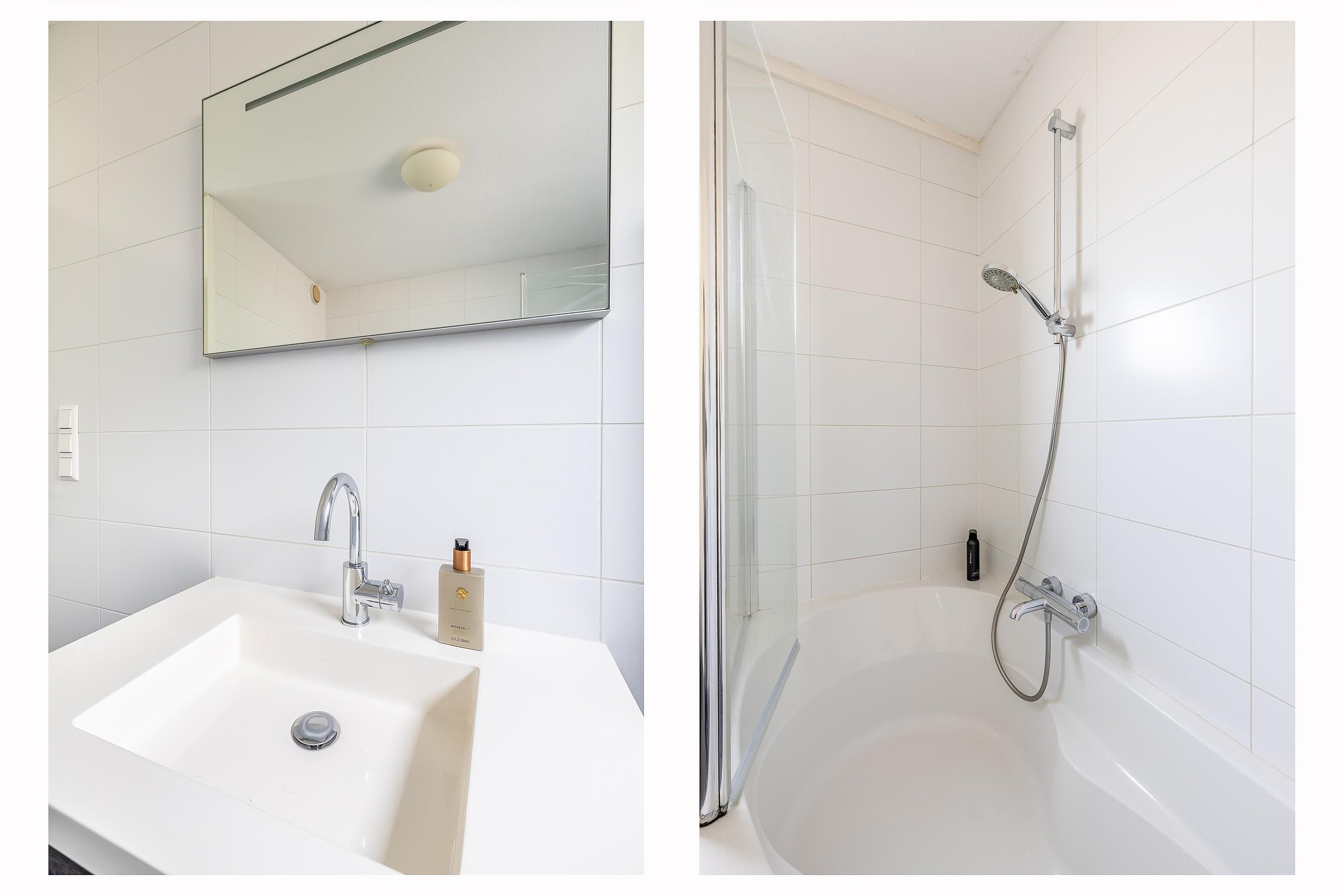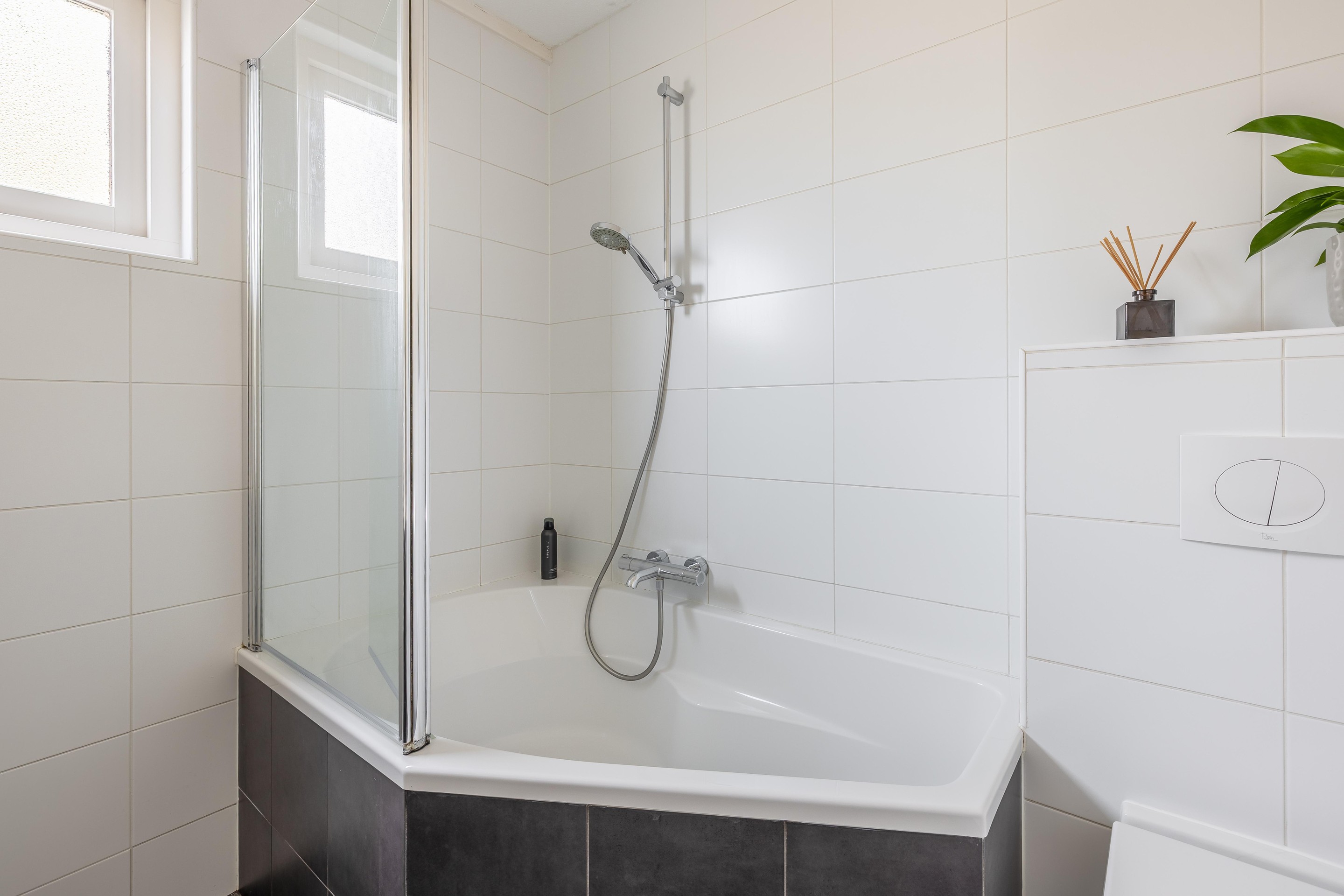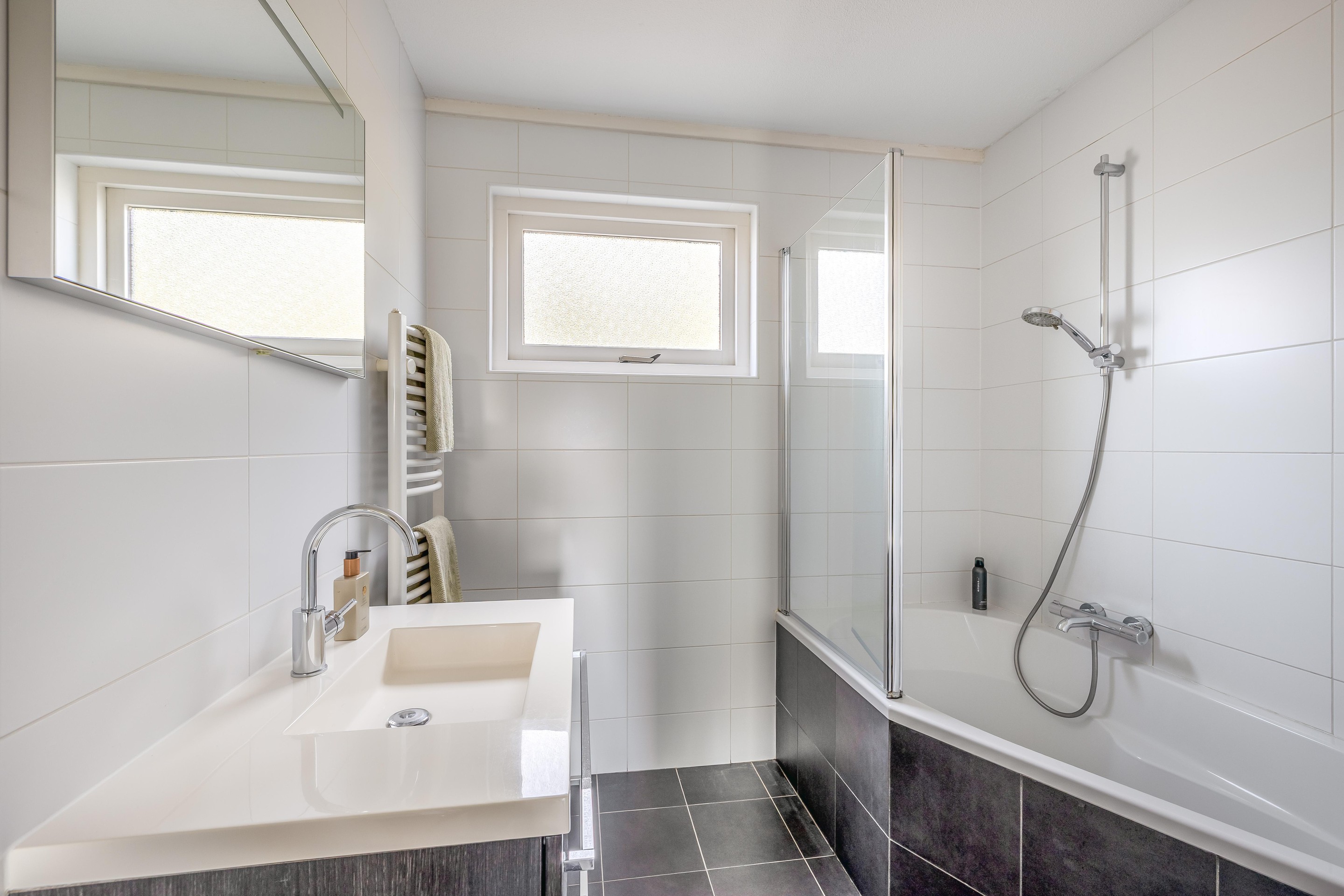 De badkamer heeft een frisse uitstraling en is volledig betegeld tot aan het plafond. Er is zowel mechanische ventilatie als een groot raam dat open kan voor natuurlijke ventilatie. Verder is de badkamer voorzien van een toilet, een breed wastafelmeubel met bijpassende spiegel en een praktisch ligbad waarin je ook comfortabel kunt douchen.