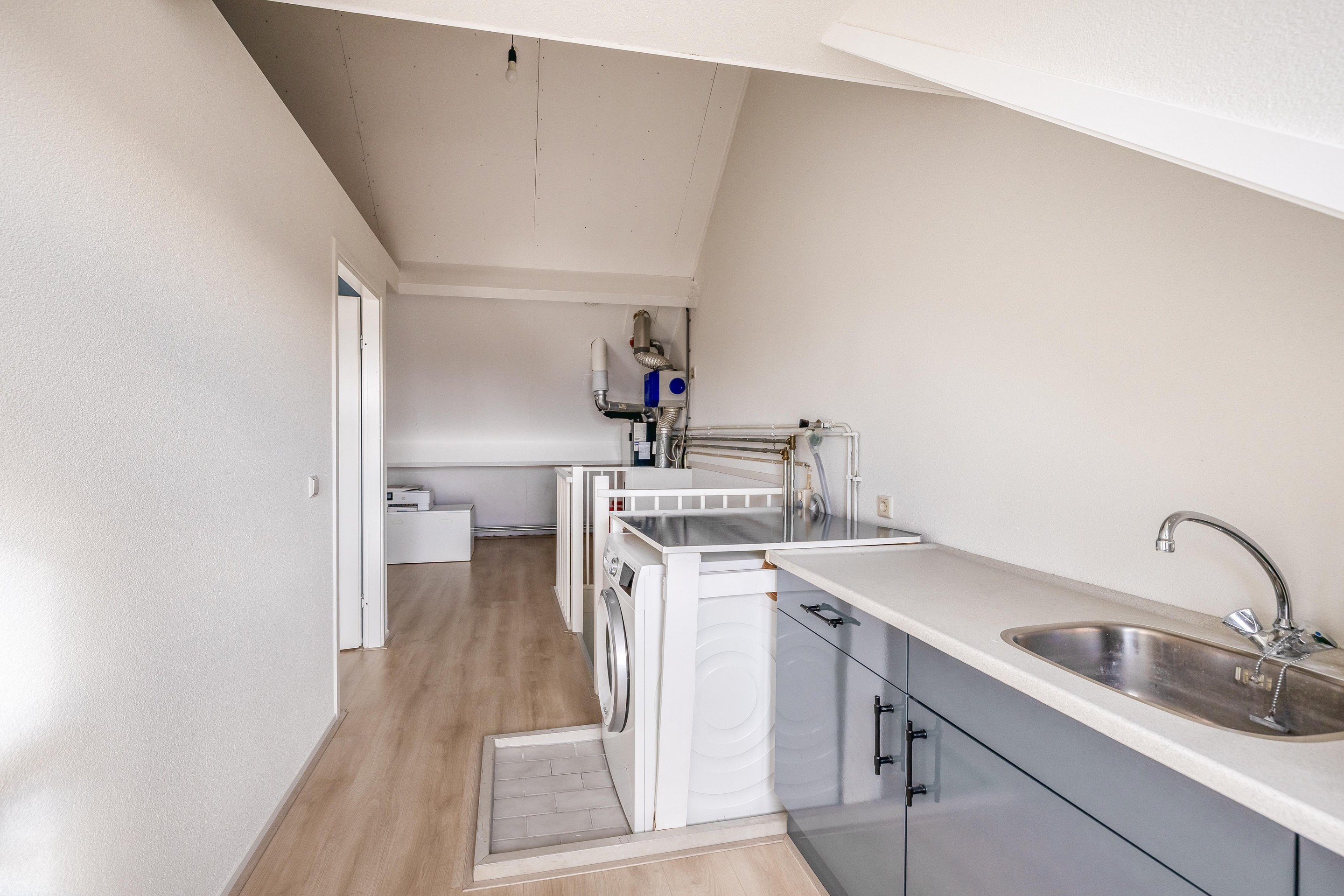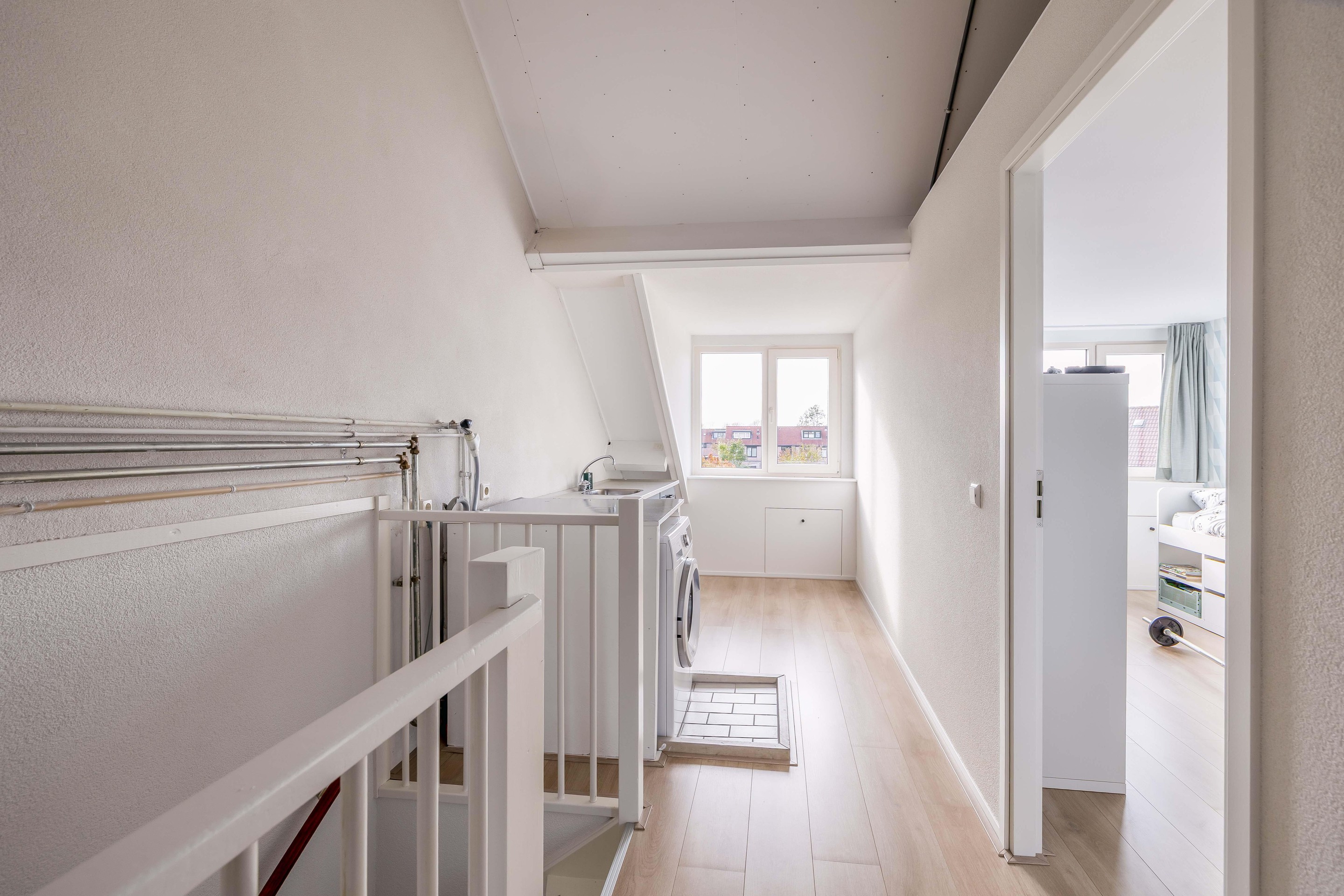 Op de overloop vind je de aansluitingen voor de wasmachine en droger, evenals de opstelplaats voor de cv-combiketel en de unit voor de mechanische ventilatie. Vanaf de voorzolder is de bergvliering bereikbaar — ideaal voor extra opbergruimte.