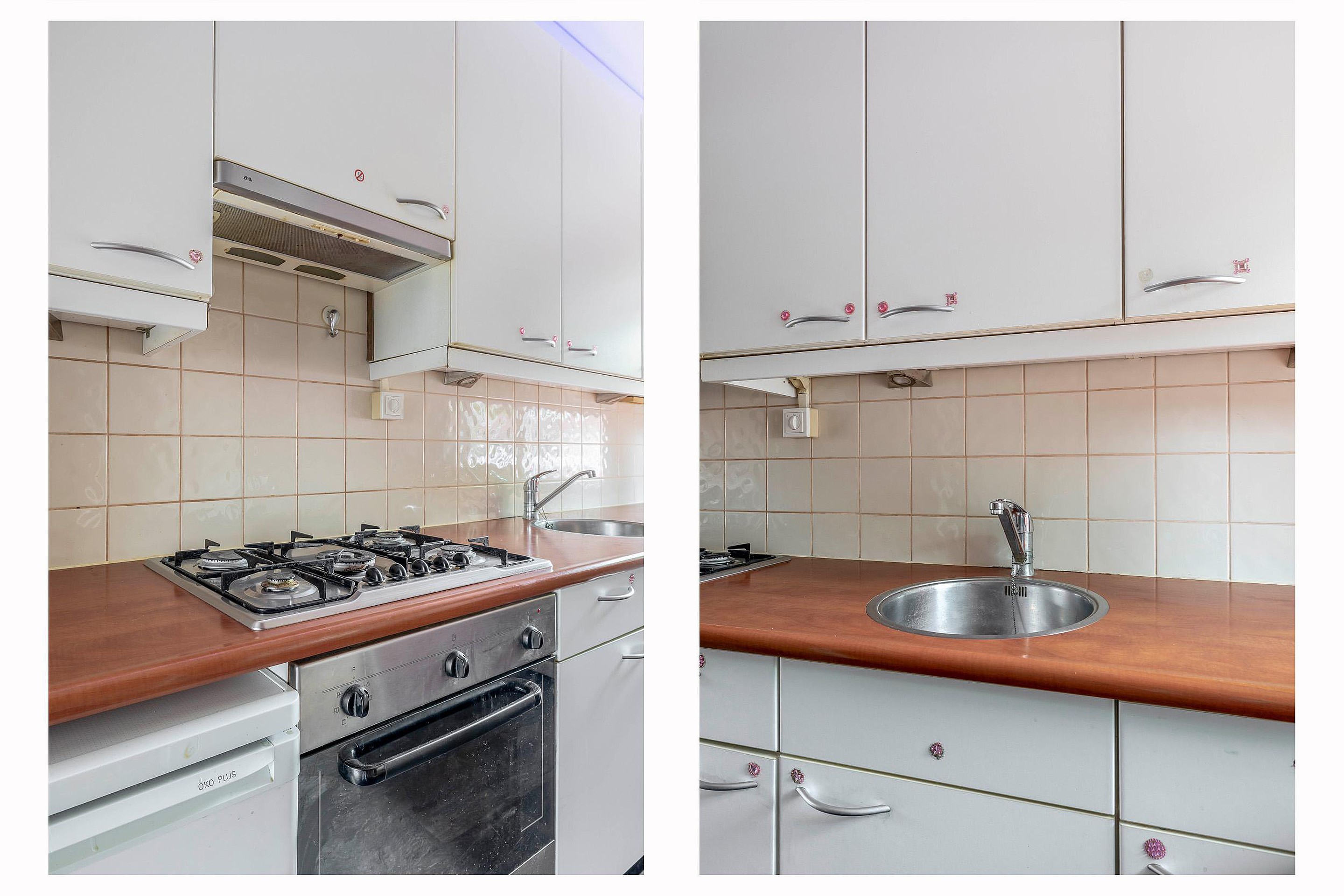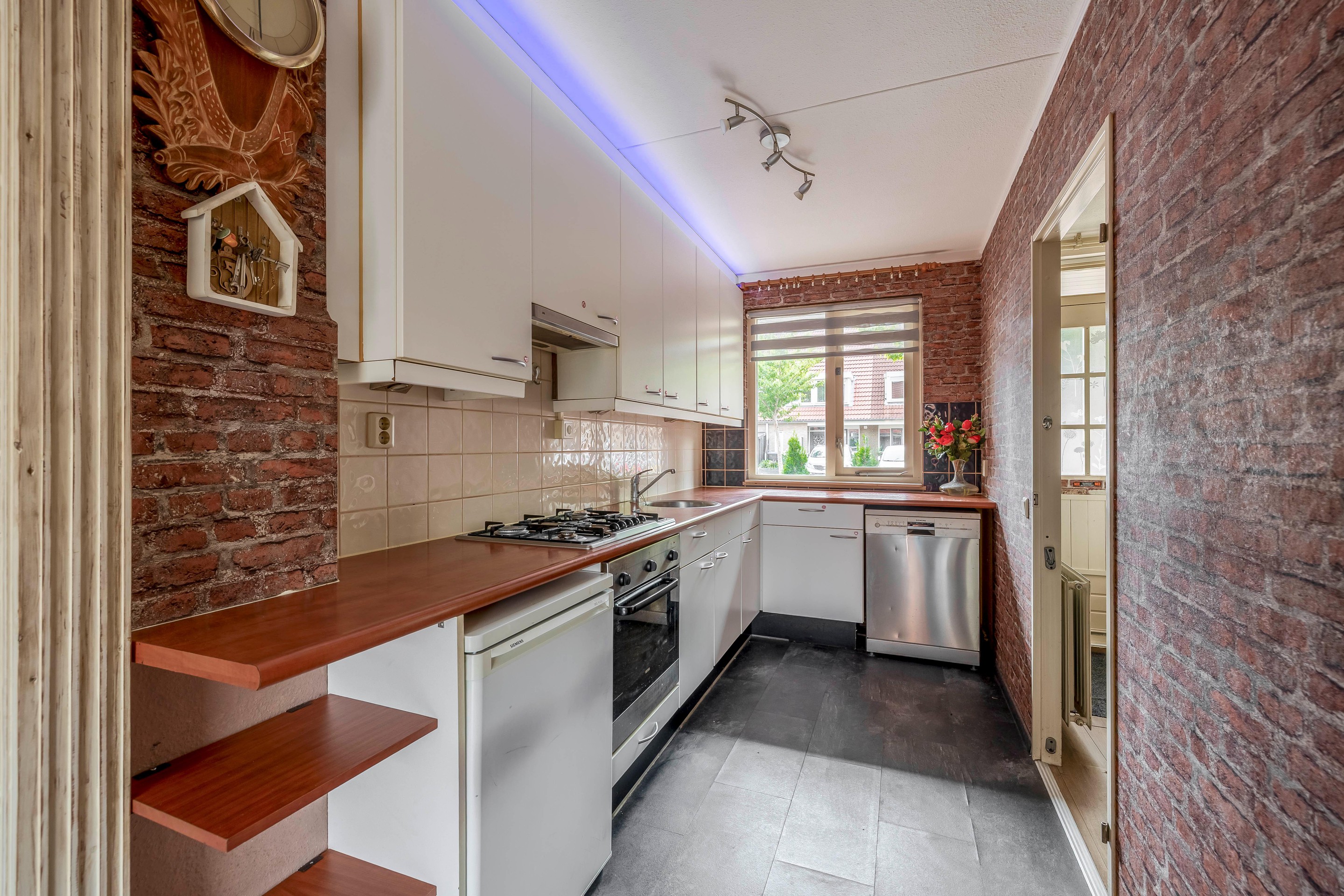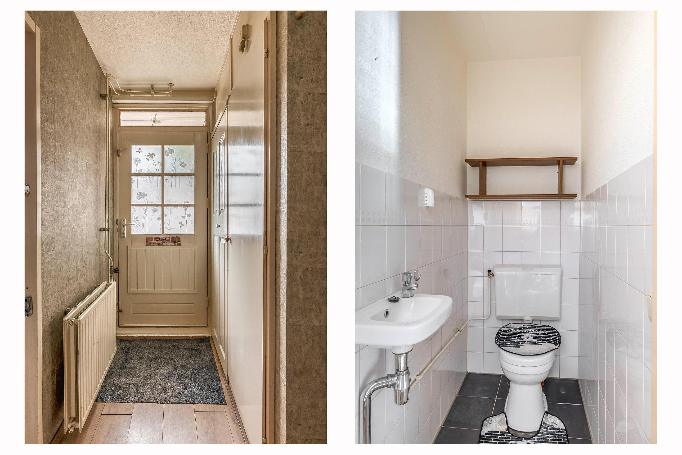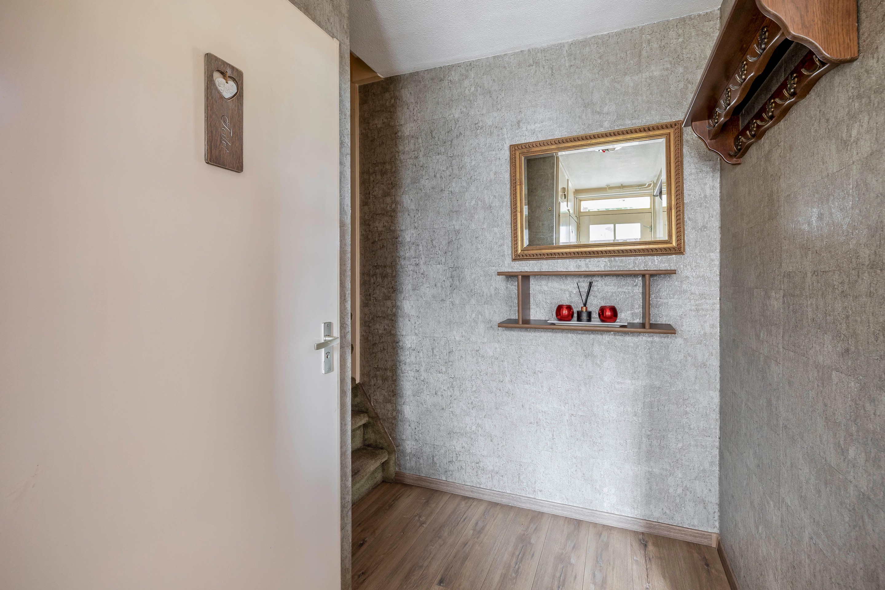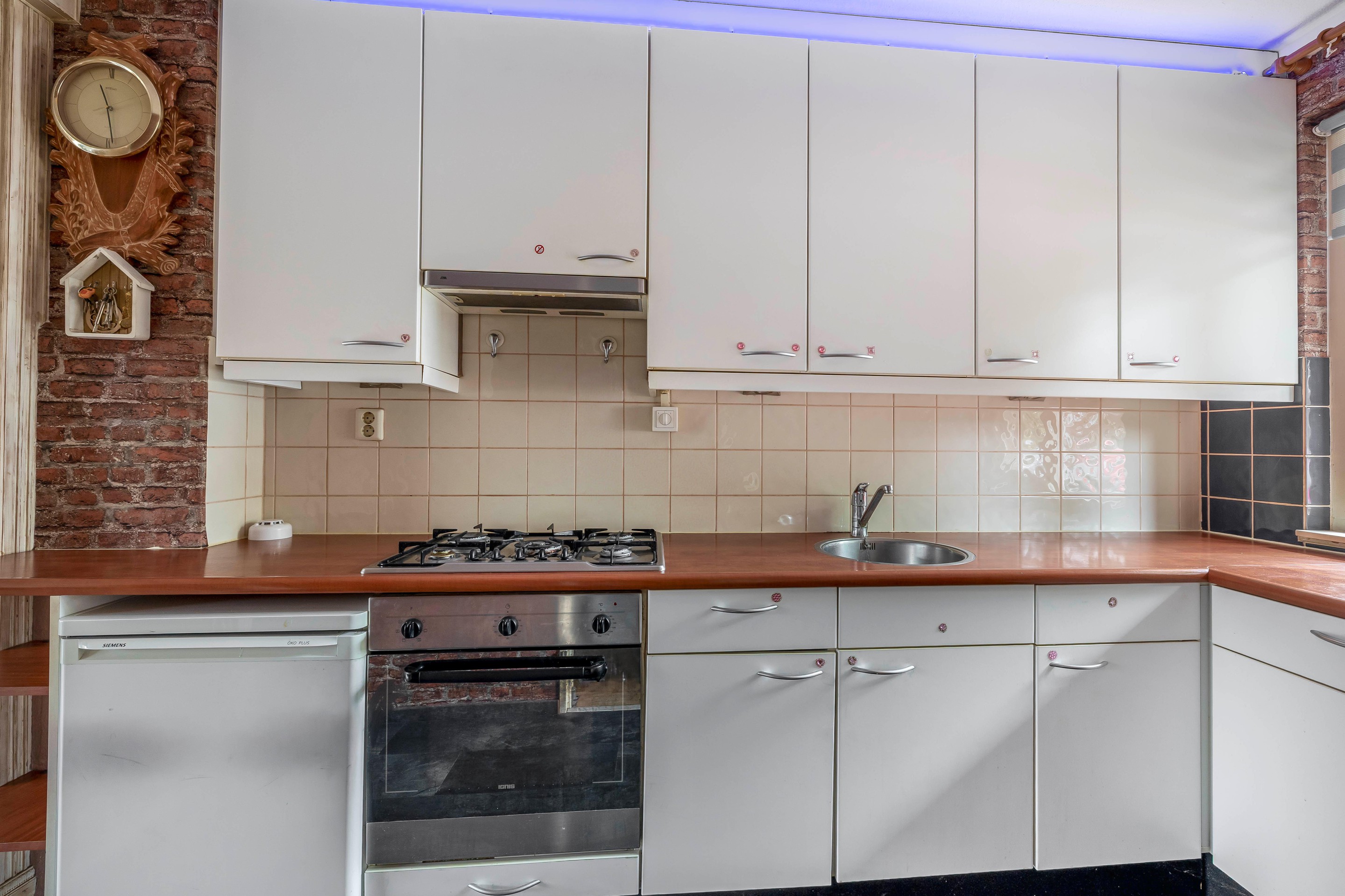 Begane grond Bij binnenkomst kom je in de ruime hal met toegang tot de inpandige berging, het toilet met fonteintje, de trap naar de eerste verdieping en de keuken. De L-vormige keuken is praktisch ingericht en voorzien van een 5-pits gasfornuis en voldoende kastruimte. Vanuit de keuken loop je door naar de lichte woonkamer, waar brede raampartijen zorgen voor veel daglicht.