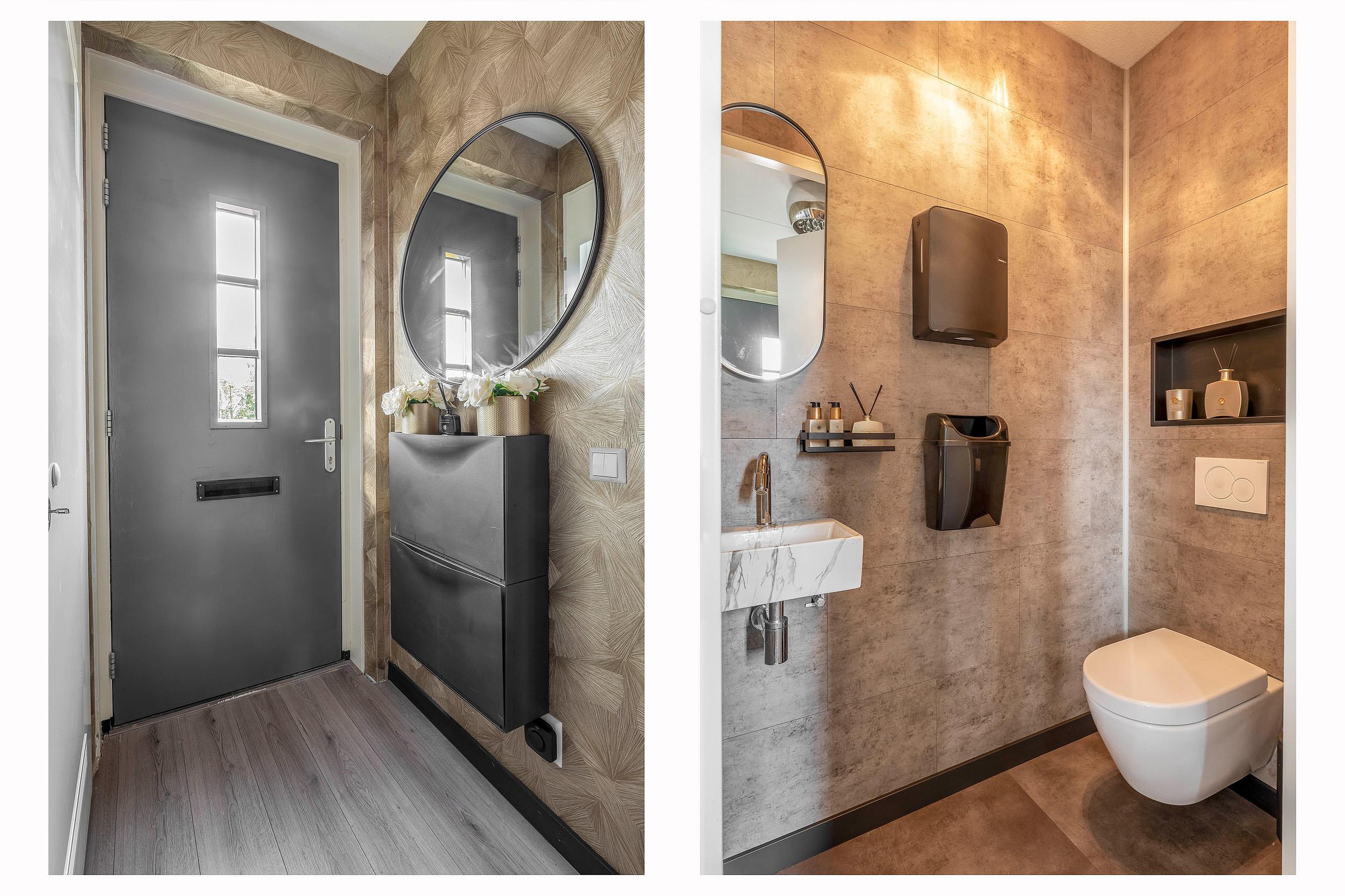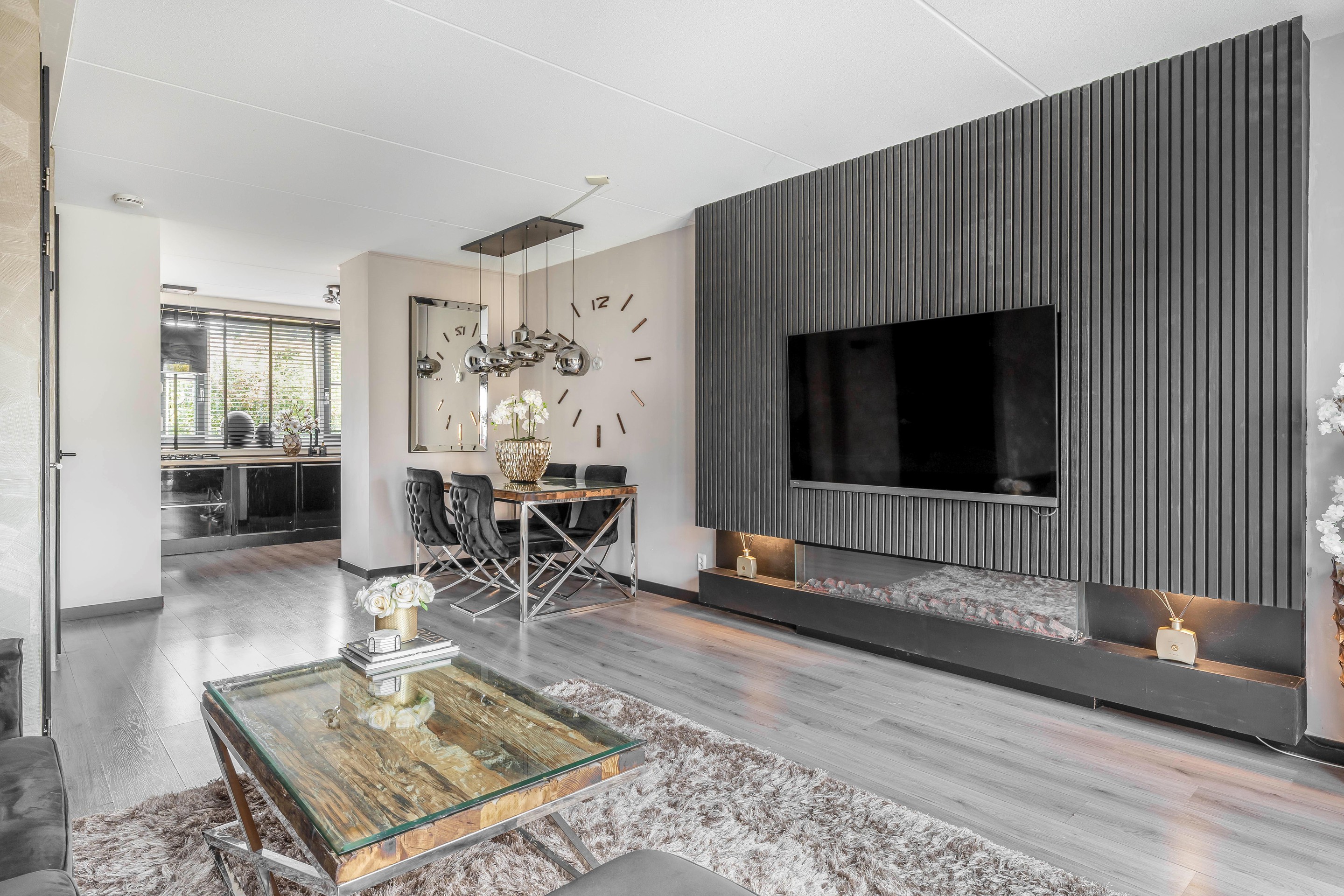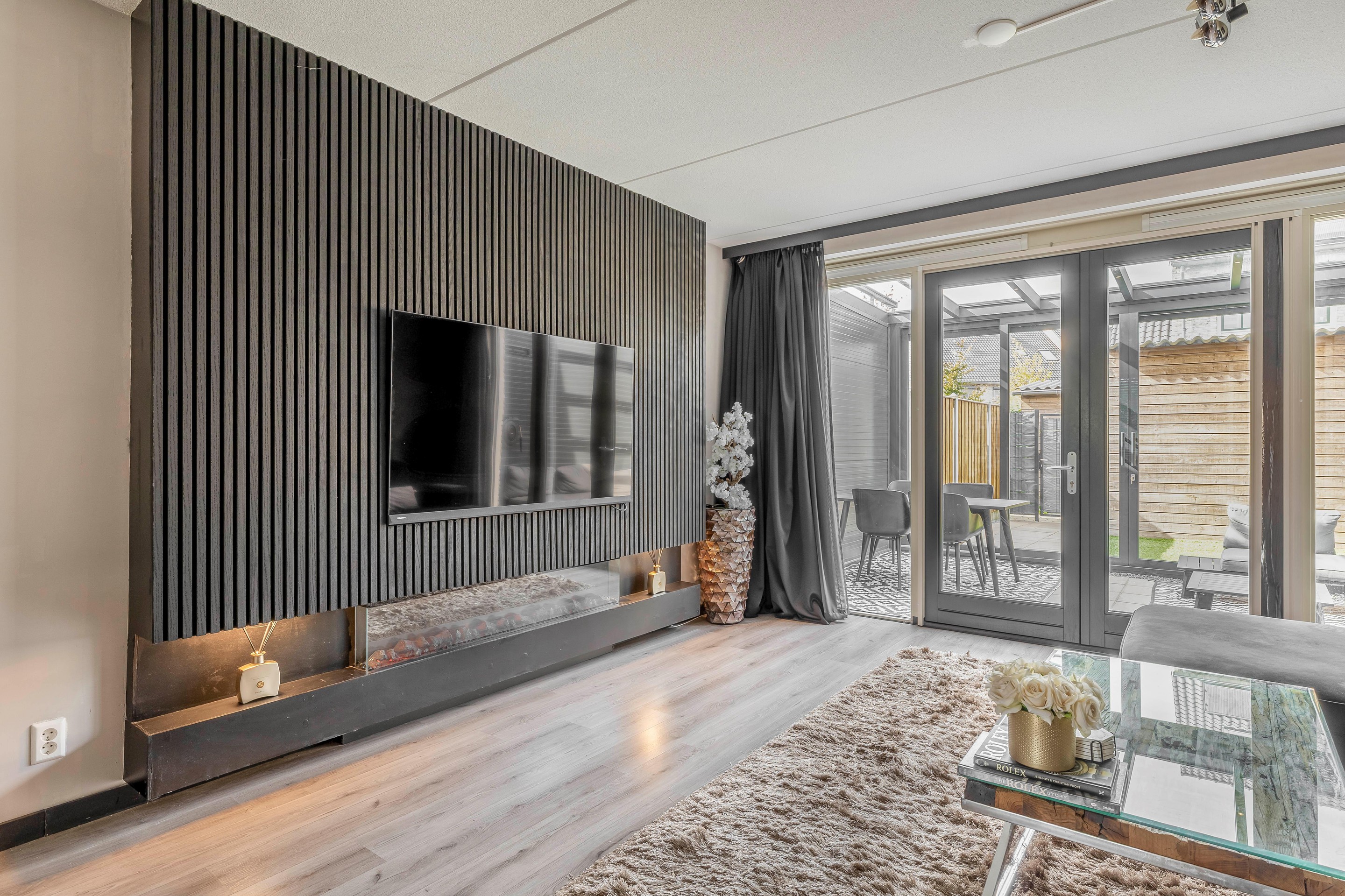 Begane grond Via de nette voortuin bereik je de entree van de woning. De hal is voorzien van een modern afgewerkt toilet met fontein, uitgevoerd in dezelfde luxe stijl als de badkamer op de verdieping. Vanuit de hal stap je de woonkamer binnen, waar direct de warme en eigentijdse sfeer opvalt. De ruimte is strak en stijlvol afgewerkt en beschikt over een fraaie ingebouwde cinema-wand met sfeerhaard, waardoor dit dé plek is om te ontspannen. De vloer loopt naadloos door over de begane grond en zorgt samen met de vloerverwarming voor een rustige, moderne basis.
