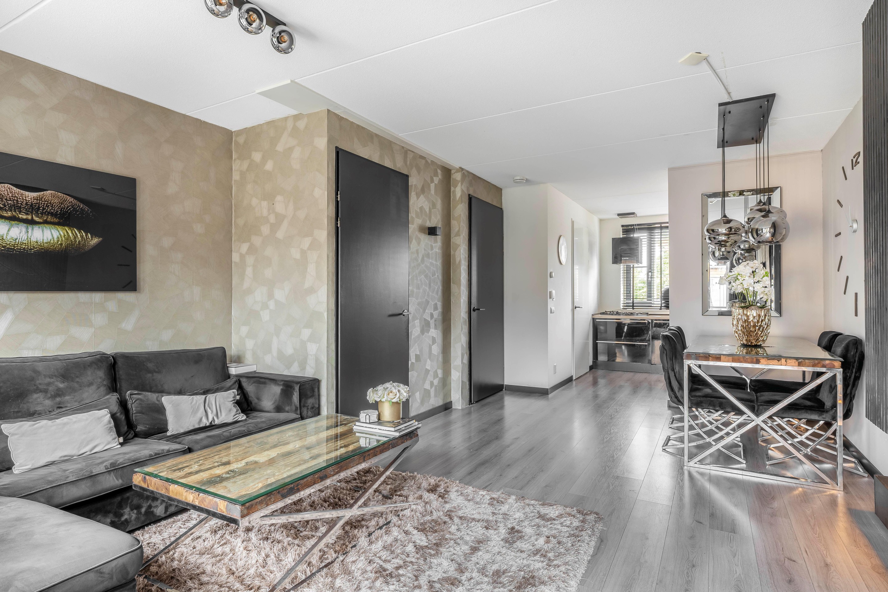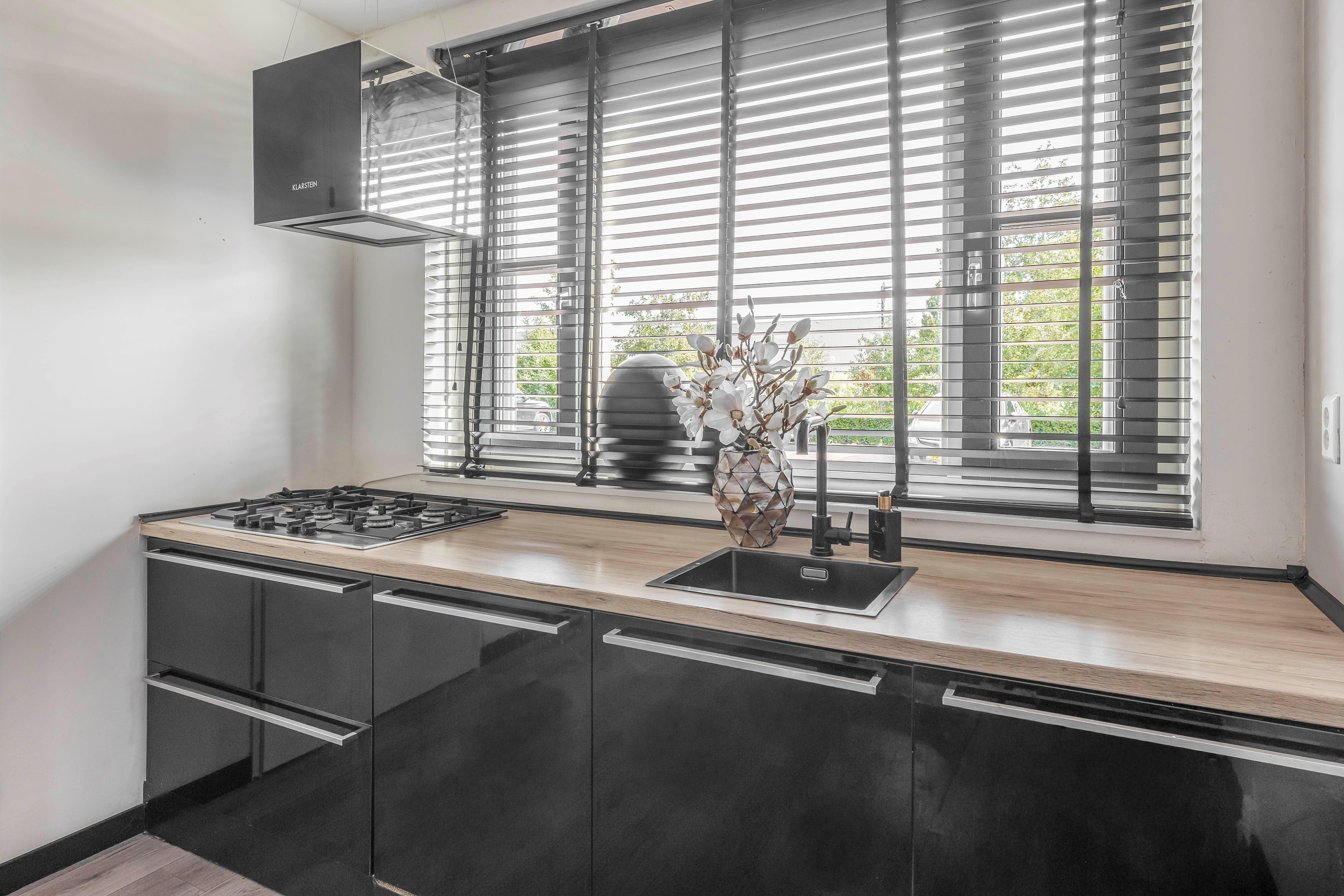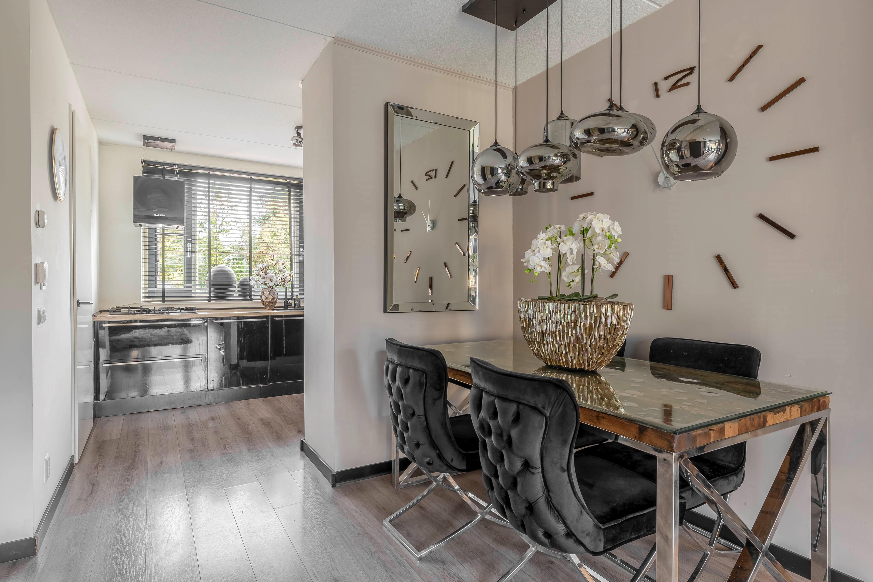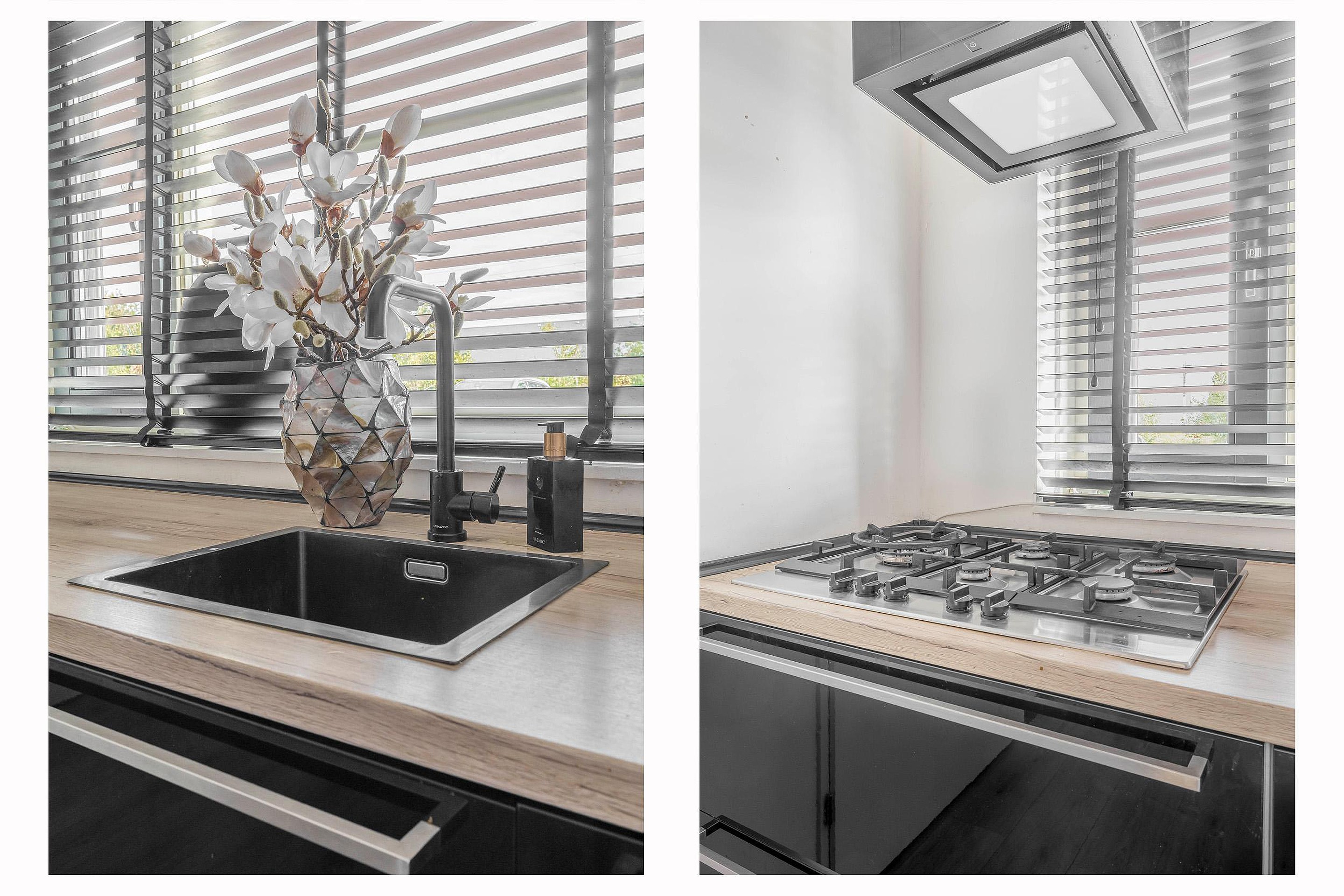 Aan de voorzijde bevindt zich de keuken, een nette en praktische ruimte met Siemens-inbouwapparatuur, een 5-pits gaskookplaat, een Klarstein-afzuigkap, vaatwasser en een prettig uitzicht over de straat. Doordat de eethoek en de keuken subtiel worden gescheiden door een wand, voelt de woonkamer heerlijk ruim en toch gezellig ingedeeld.