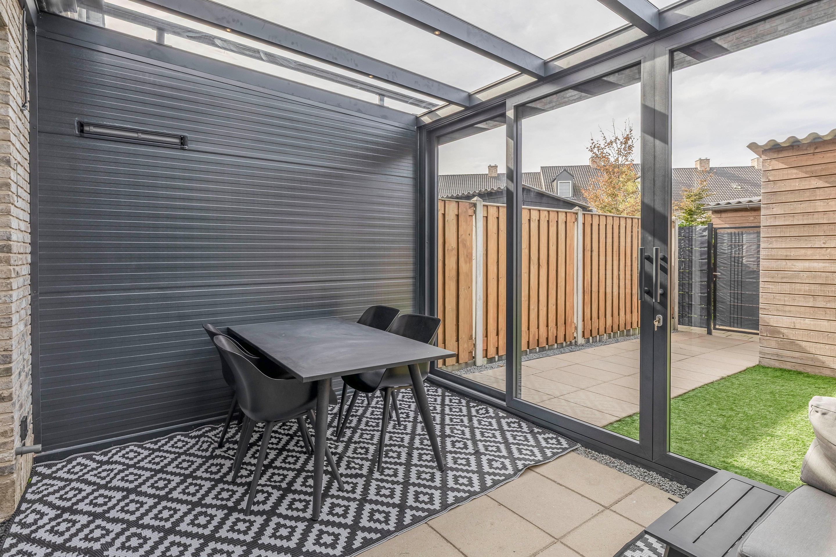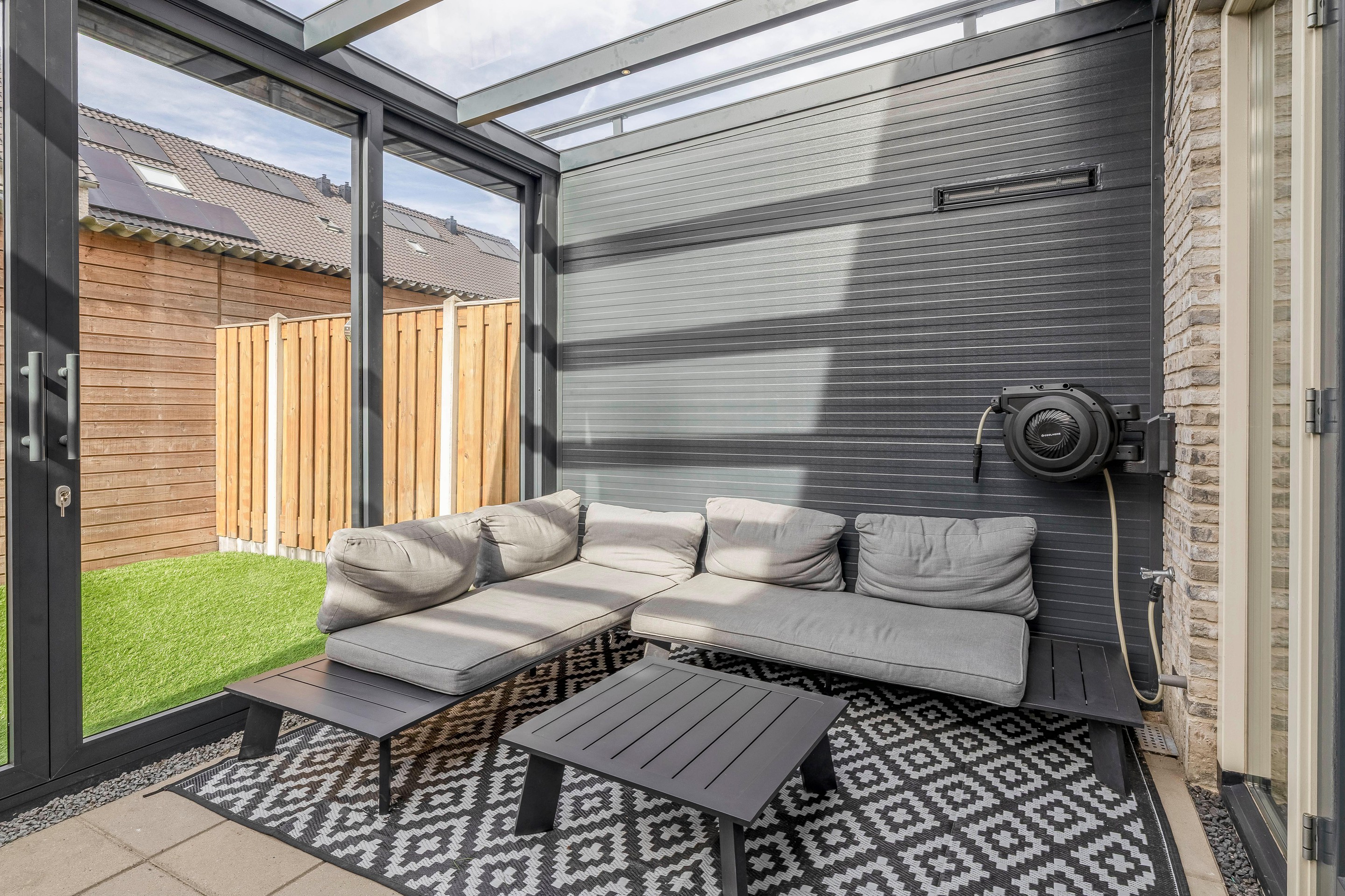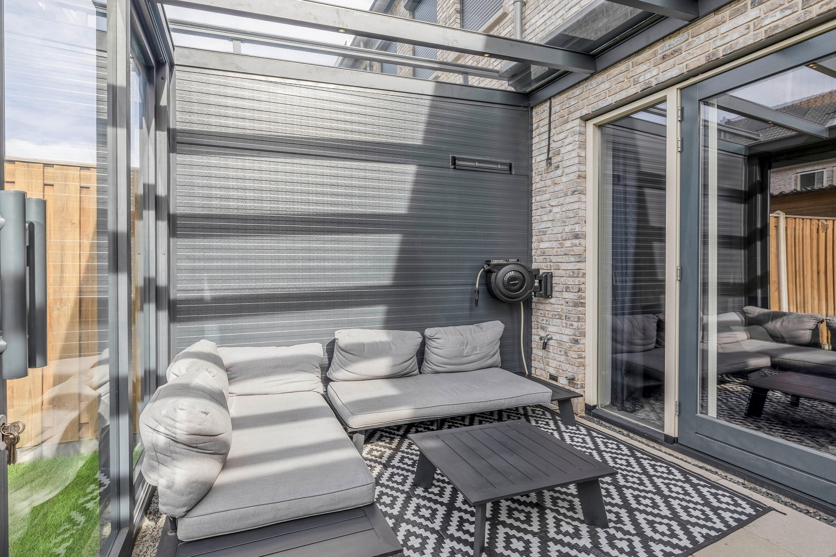In 2025 is aan de achterzijde een volledige serre geplaatst: een schitterende uitbreiding van glas, elektrisch te bedienen en voorzien van inbouwspots. Hierdoor is een extra leefruimte ontstaan die comfortabel te gebruiken is in alle seizoenen, zowel in de zomer als in de winter. De openslaande deuren vanuit de woning richting de achtertuin/serre zijn bovendien voorzien van een hor