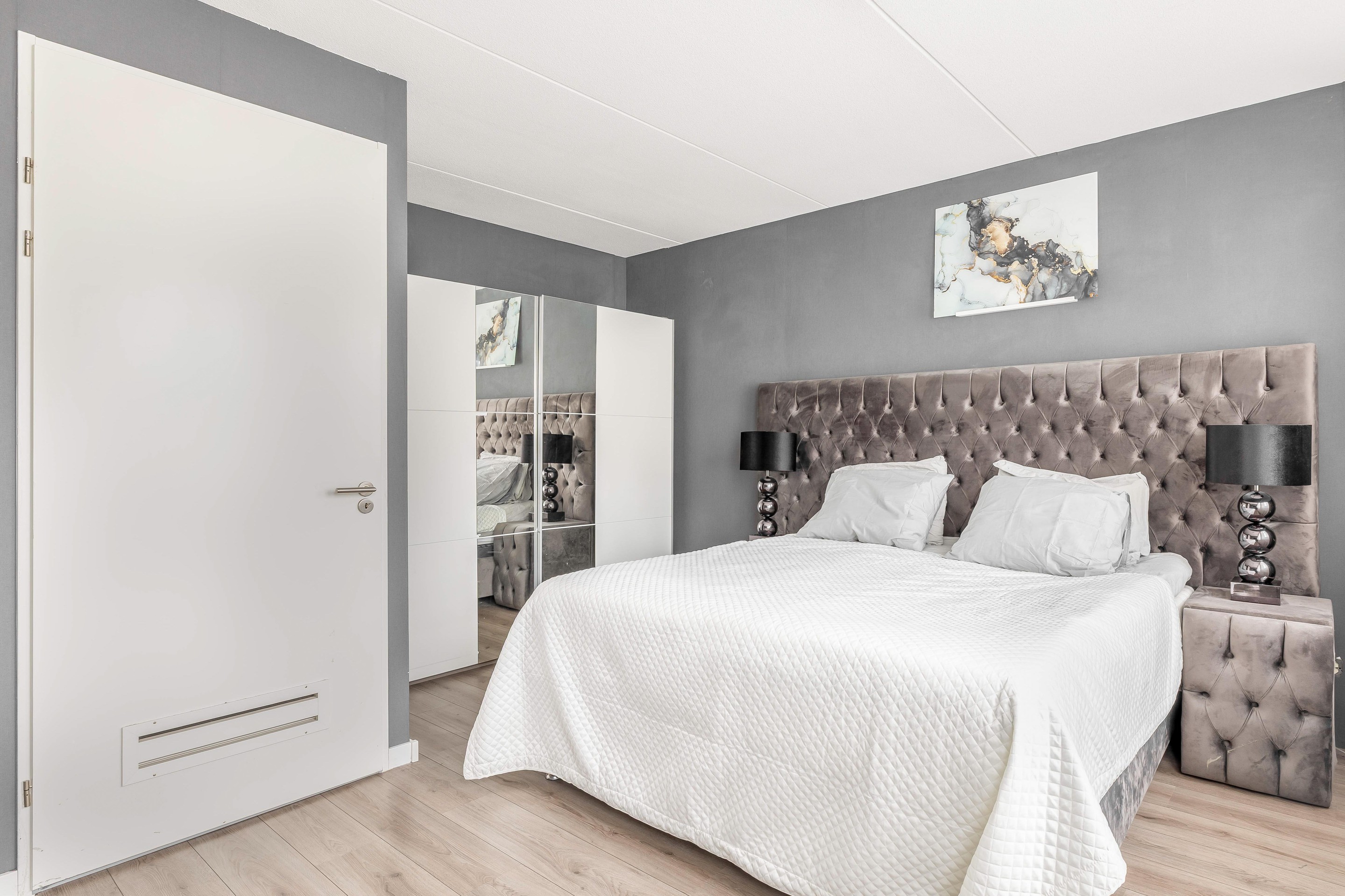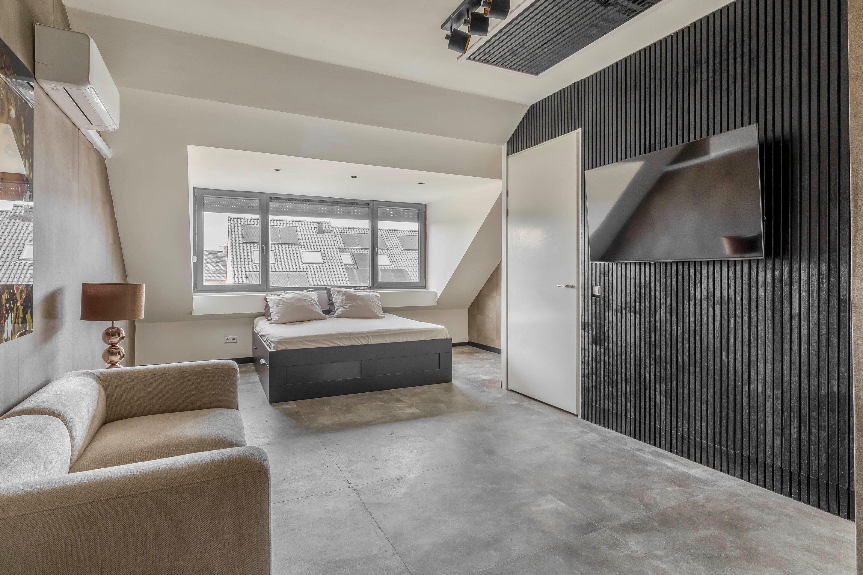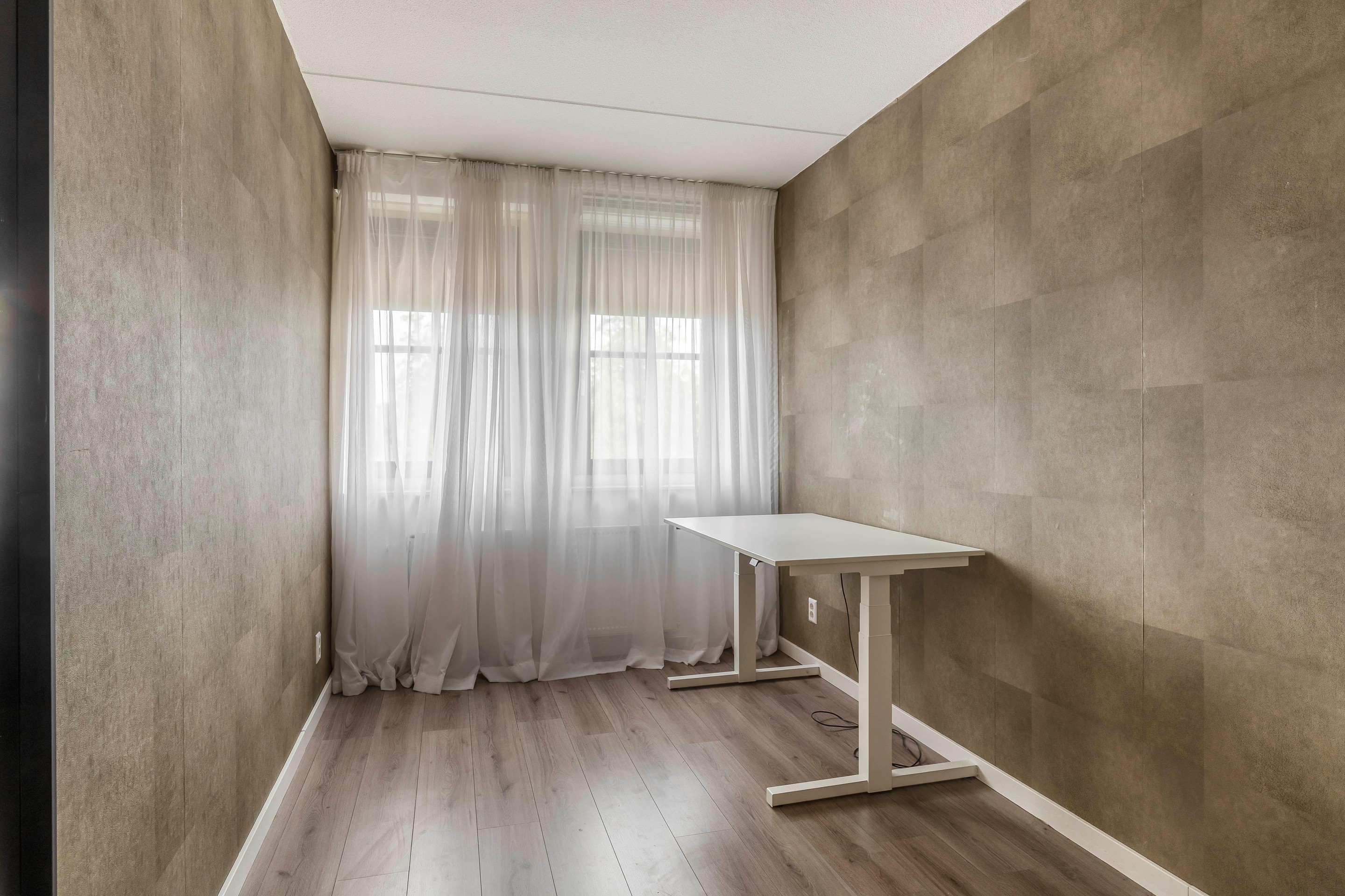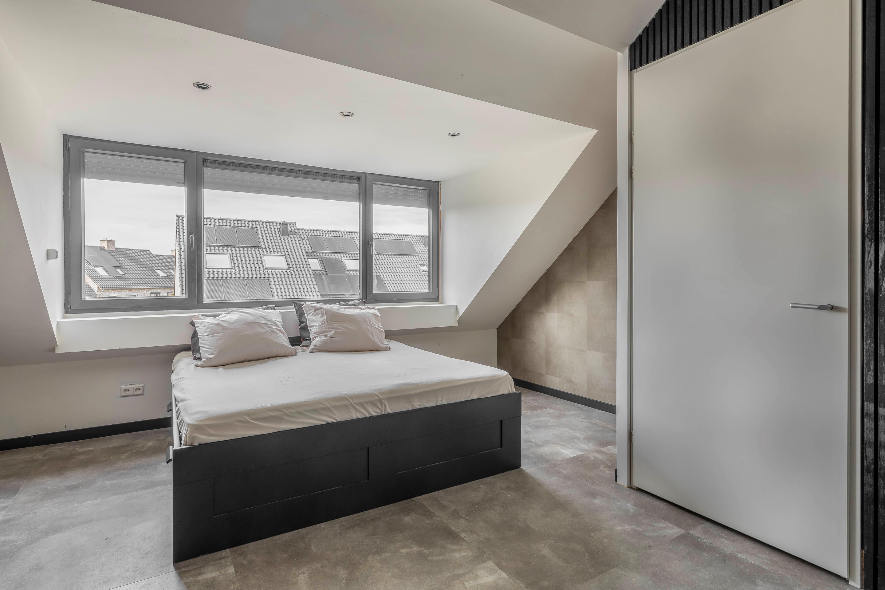 Aan de voorzijde bevindt zich de tweede slaapkamer, eveneens licht en strak afgewerkt. Deze ruimte is ideaal als kinder- of werkkamer en vormt een mooie aanvulling op de woonmogelijkheden.