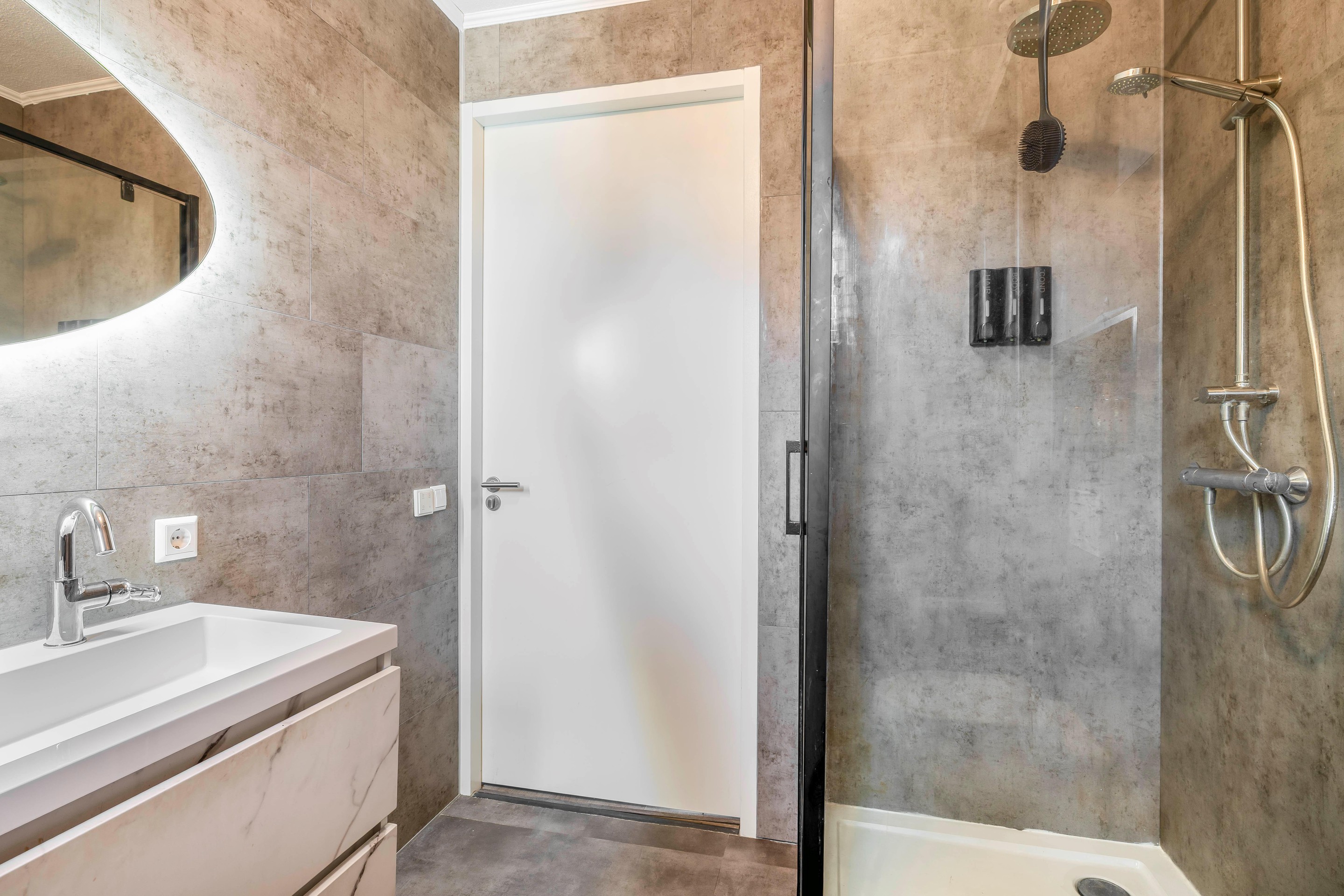 De badkamer, ook aan de voorzijde gelegen, heeft een moderne uitstraling met warme tegeltonen en een strakke afwerking. De ruimte is ingericht met een ligbad, een inloopdouche met regendouche, een zwevend toilet en een wastafelmeubel met twee kranen, waardoor de wastafel praktisch in gebruik is voor meerdere personen. Dankzij de mechanische ventilatie en de nette afwerking is dit een comfortabele en onderhoudsvriendelijke badkamer.