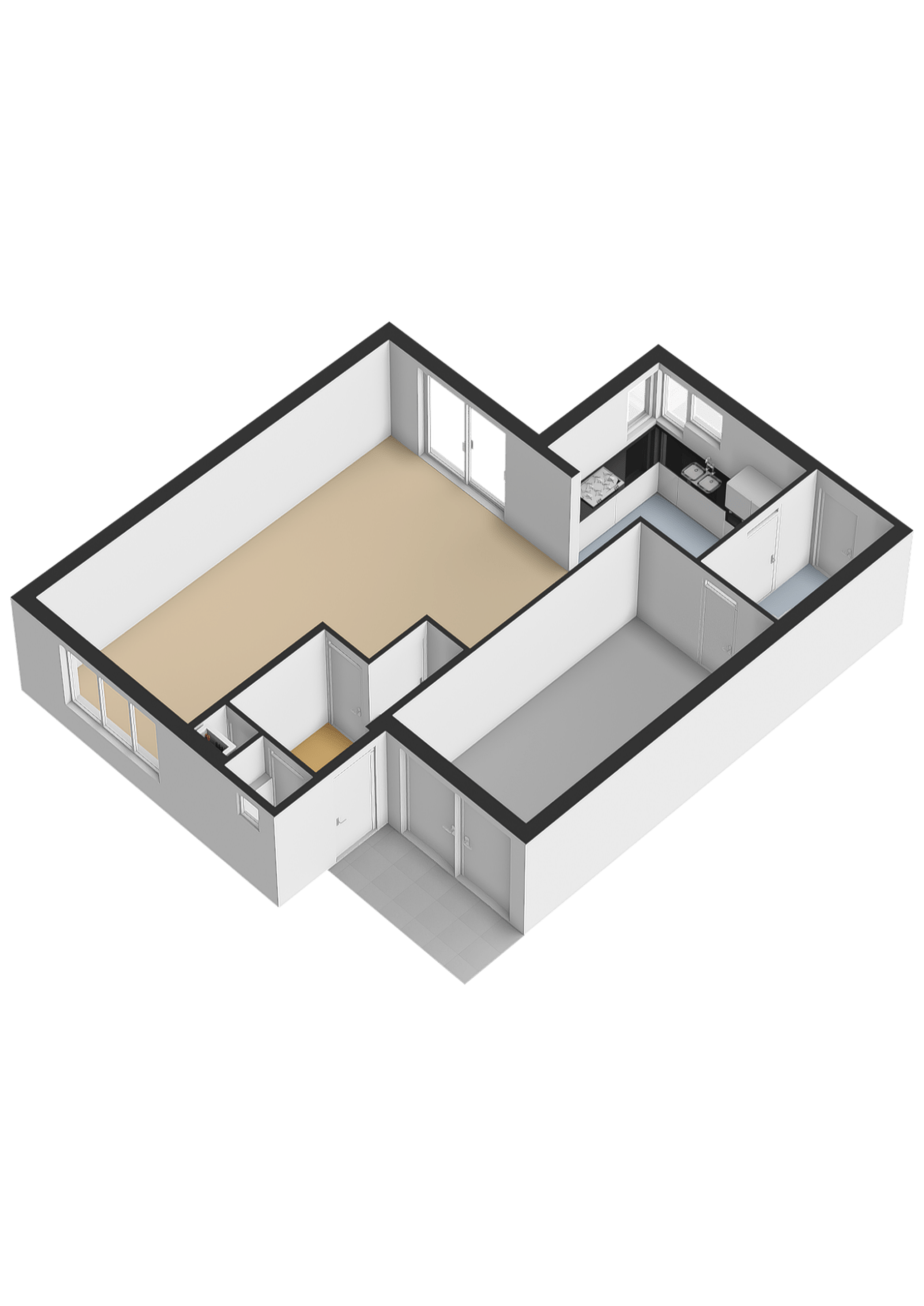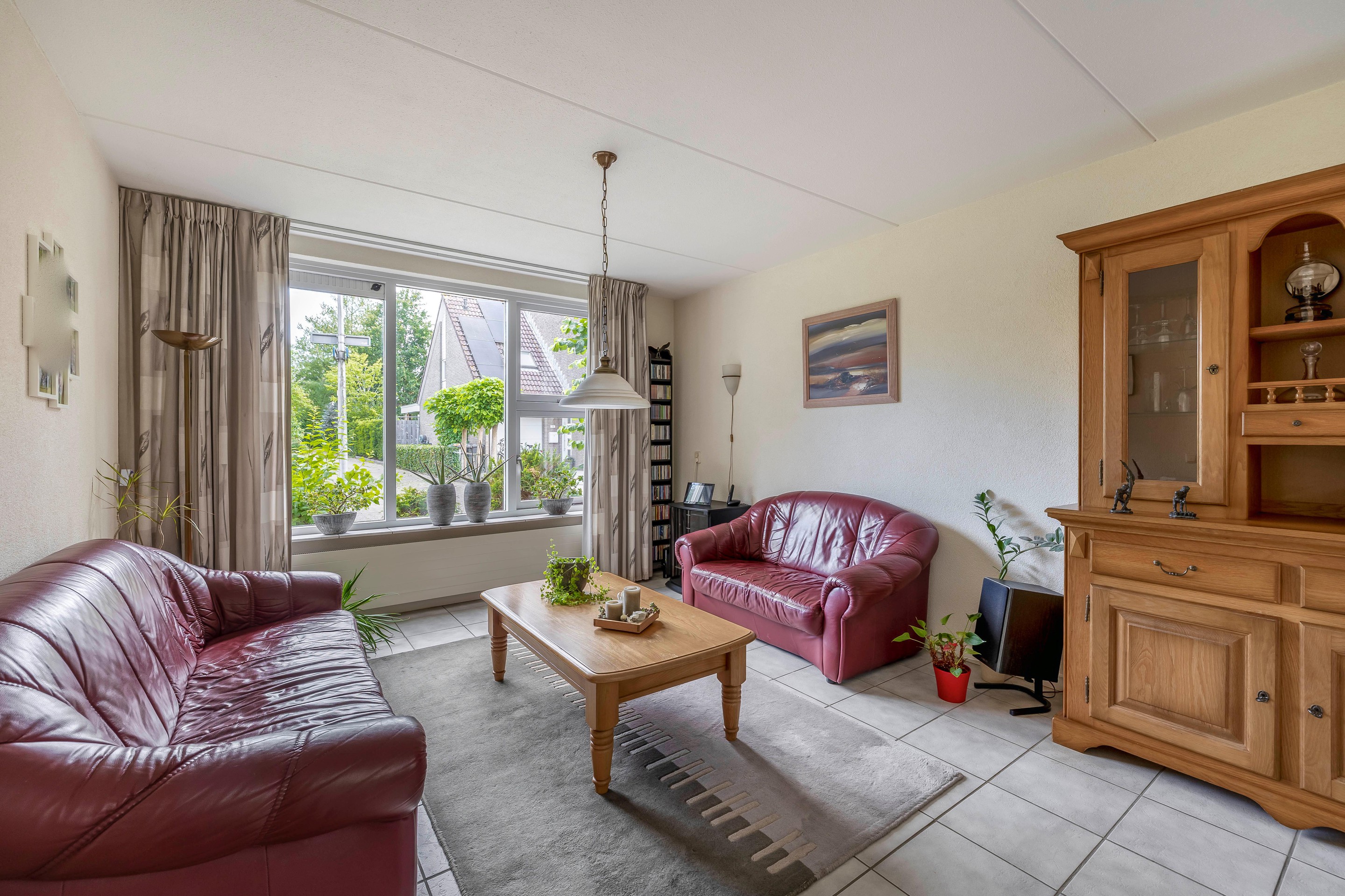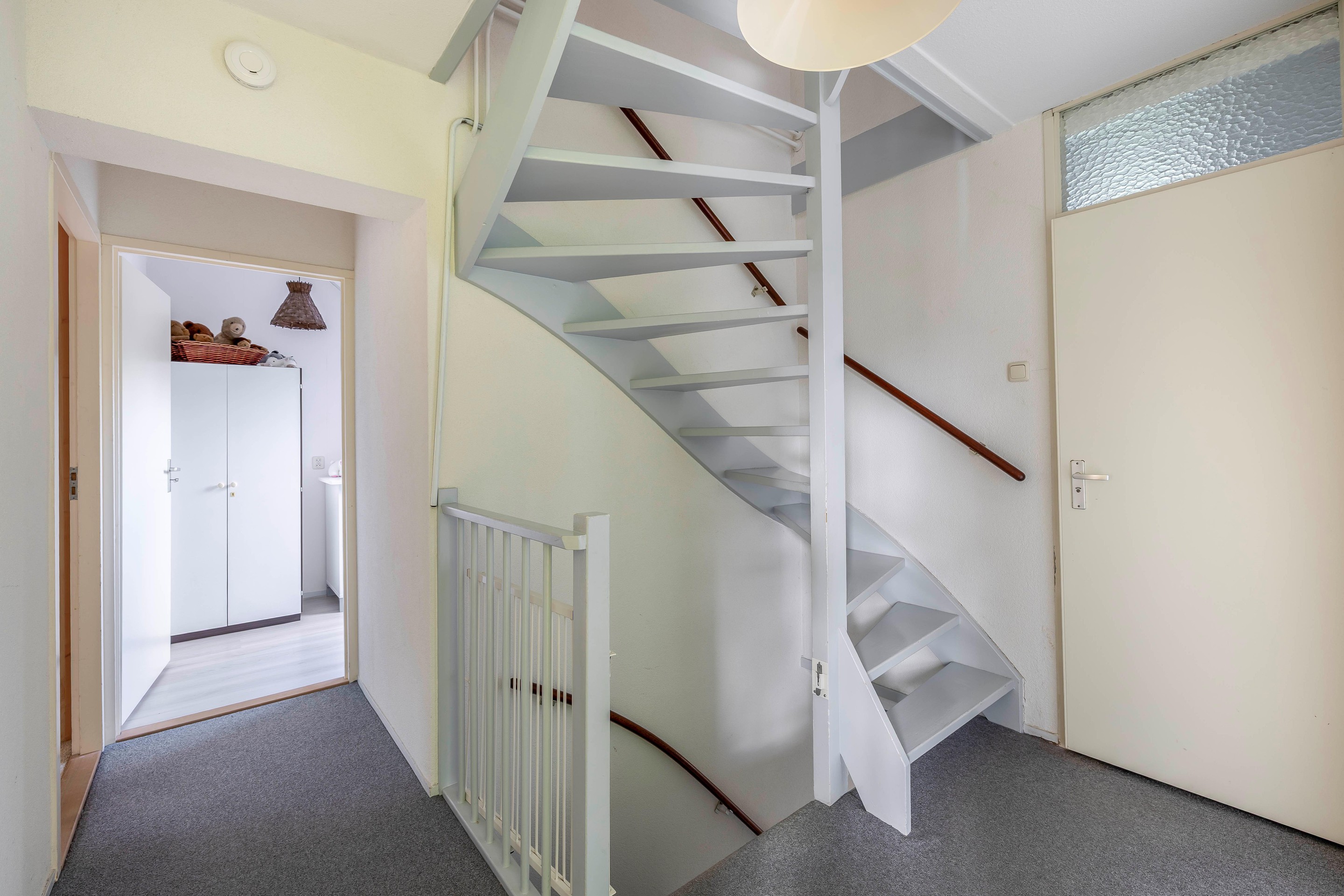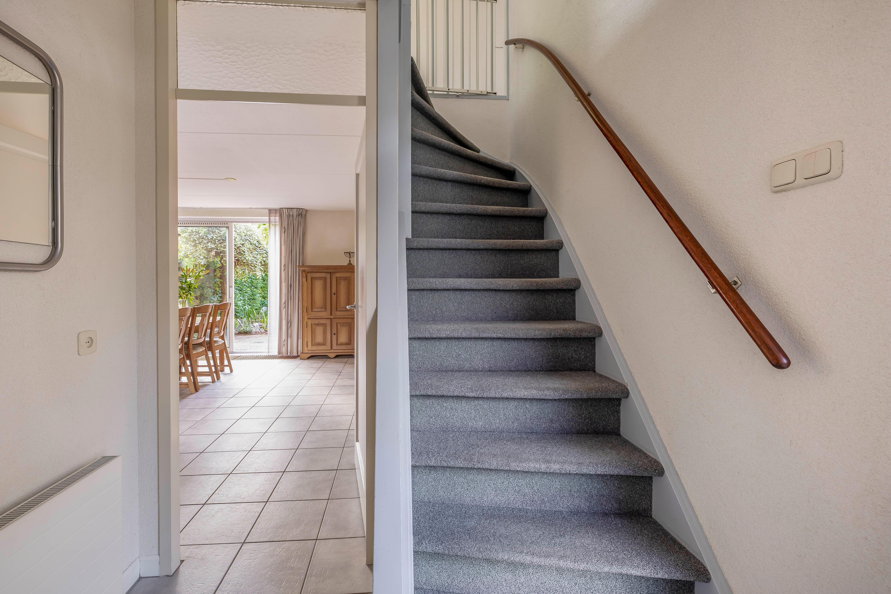 De hal leidt naar de lichte en ruime woonkamer, waar een trapkast handige opbergruimte biedt. De aluminium schuifpui geeft toegang tot de achtertuin en zorgt voor veel natuurlijk licht.
