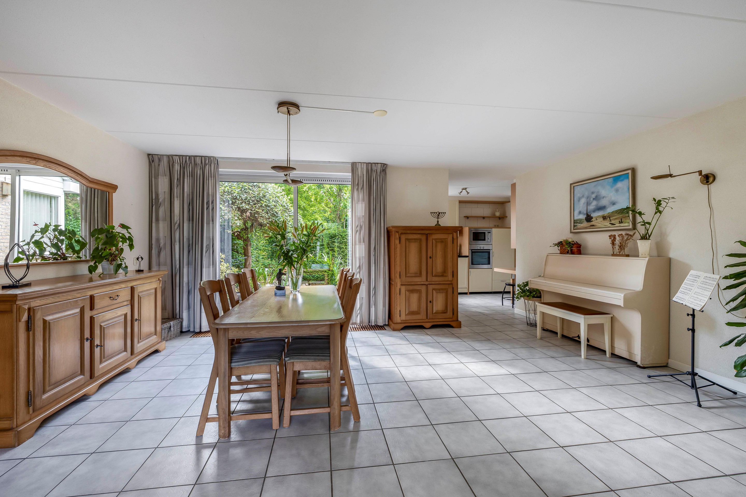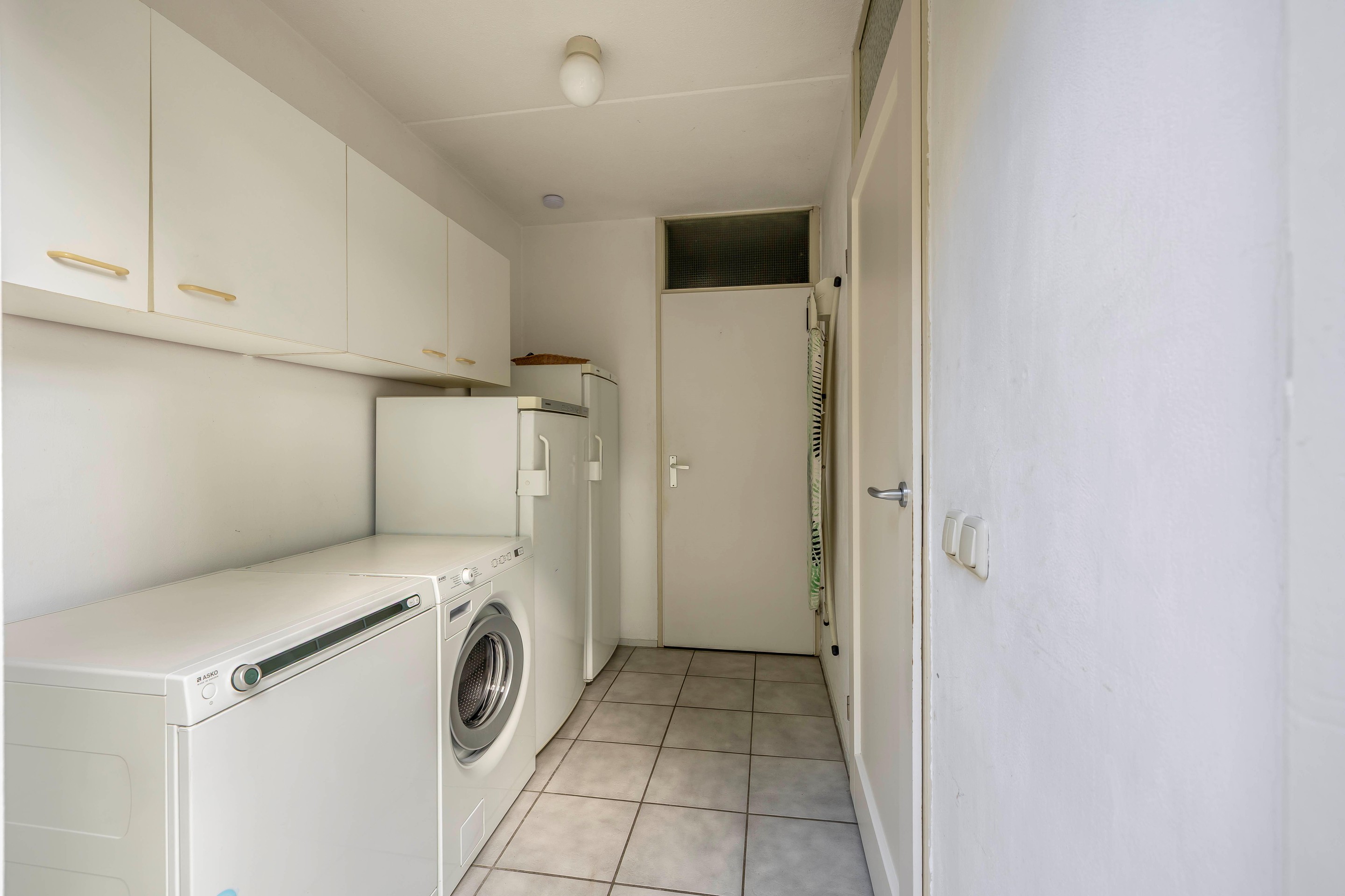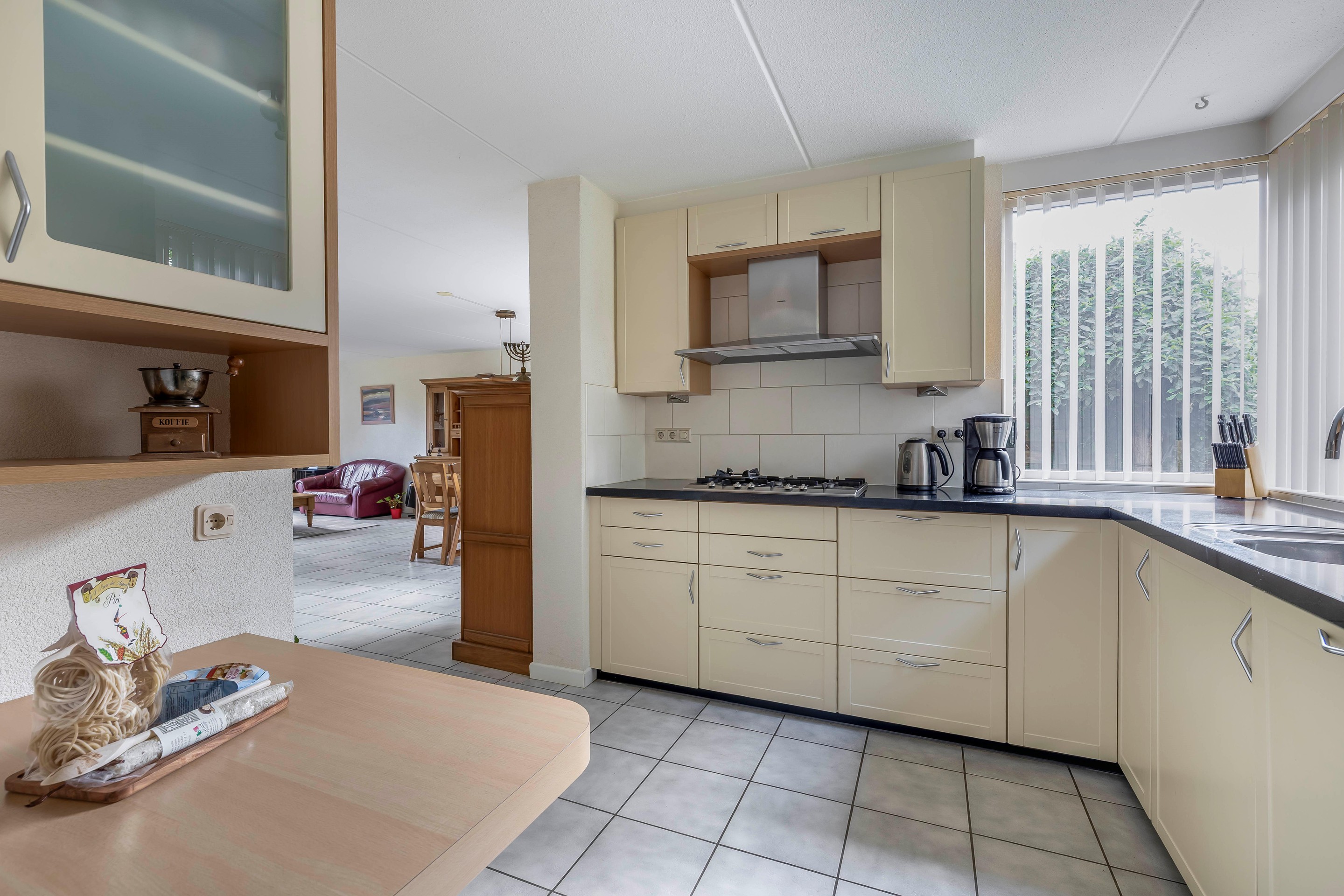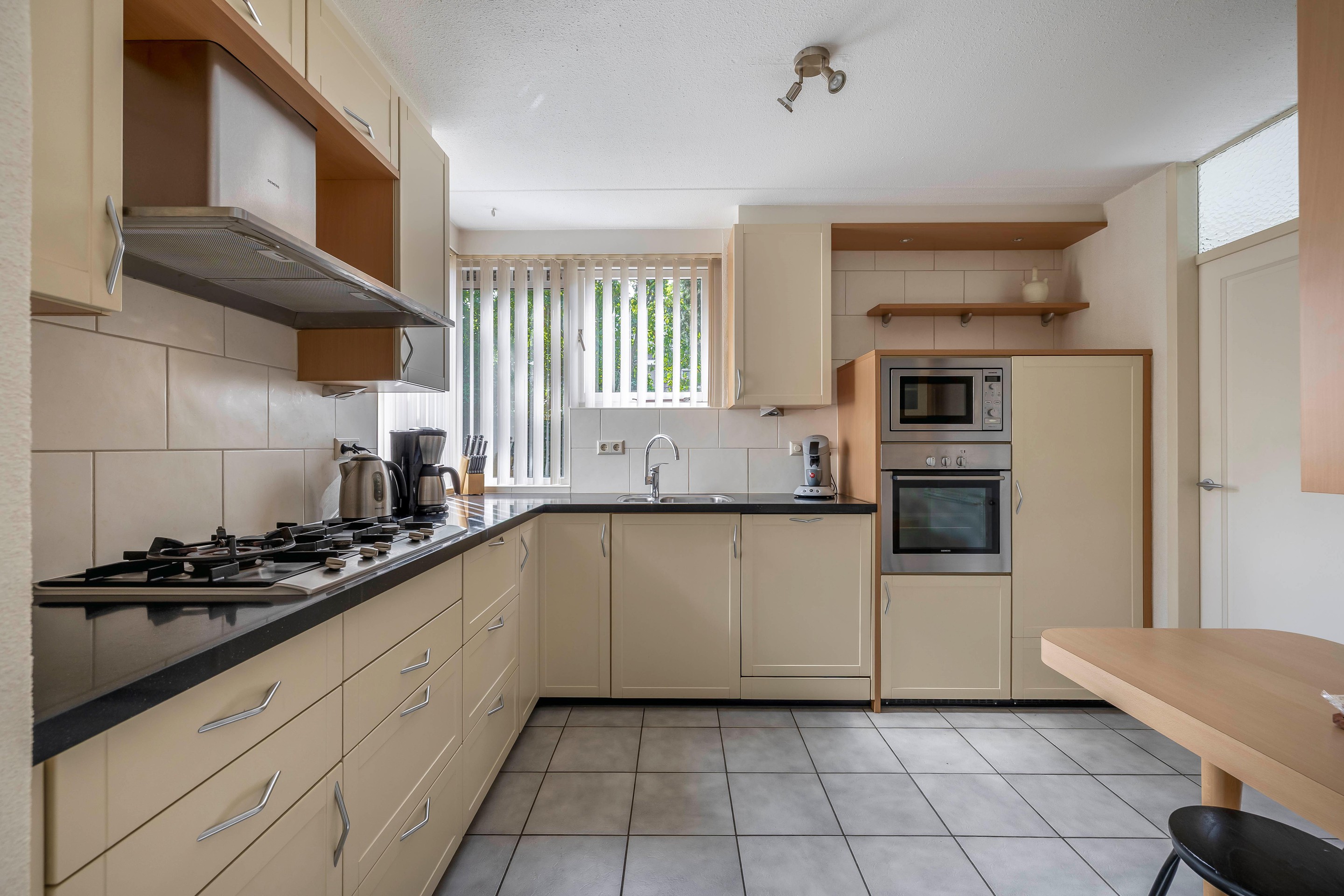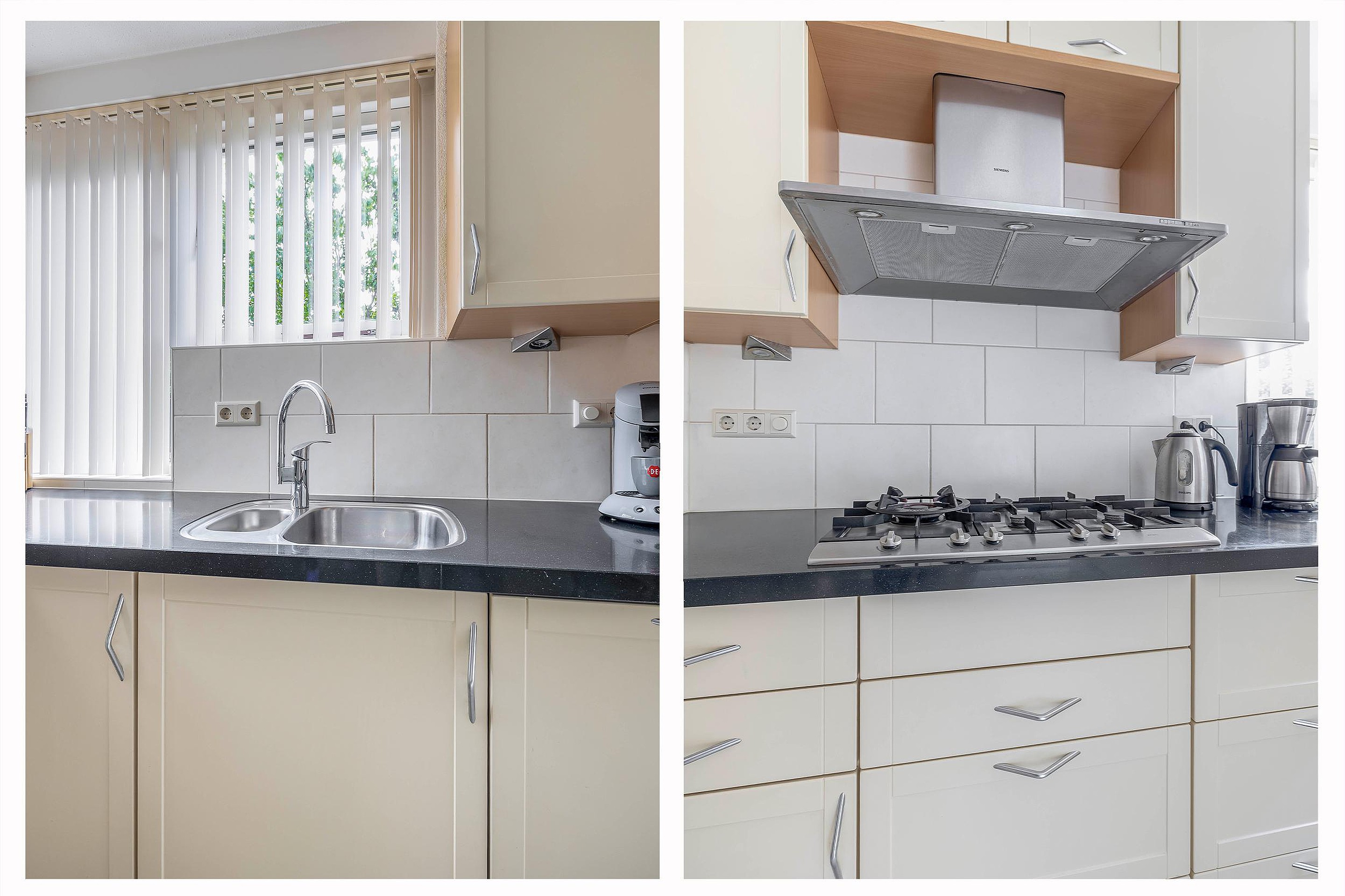 De halfopen keuken in hoekopstelling is compleet uitgerust met diverse inbouwapparatuur, waaronder een 5-pits gaskookplaat, afzuigkap, magnetron, oven, koelkast en vaatwasser. Vanuit de keuken bereikt u de bijkeuken met een aansluiting voor de wasmachine. De bijkeuken biedt zowel toegang tot de tuin als tot de garage.