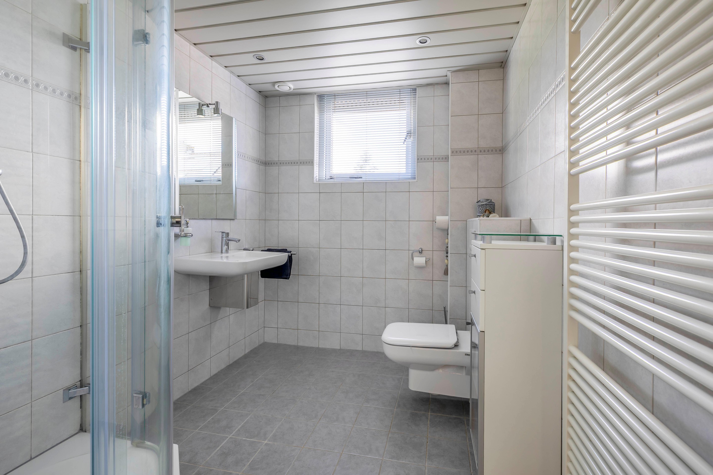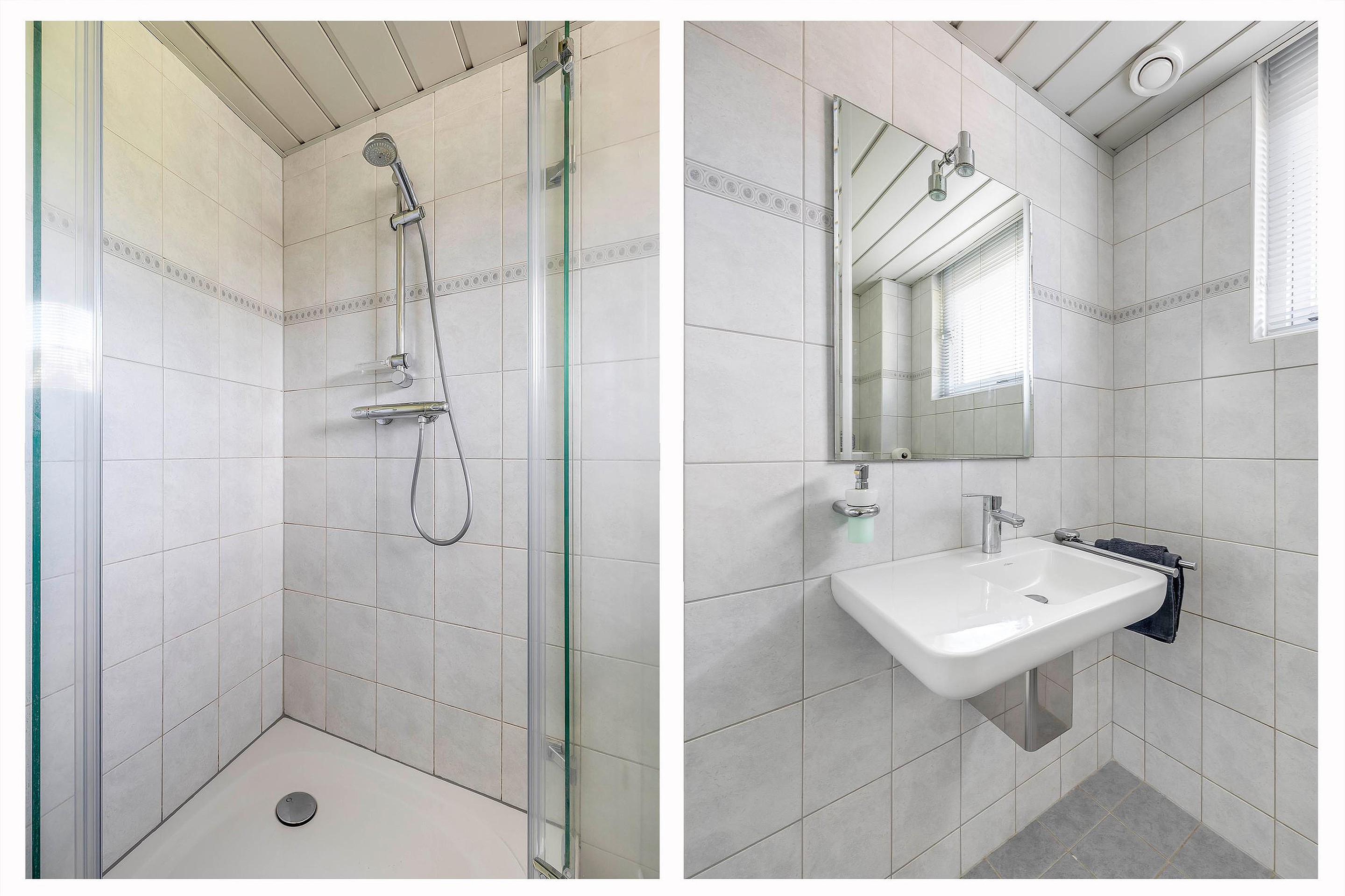 De badkamer is volledig betegeld en beschikt over een moderne douchecabine, een wastafel met spiegel, een handdoekradiator en een vrijhangend toilet.