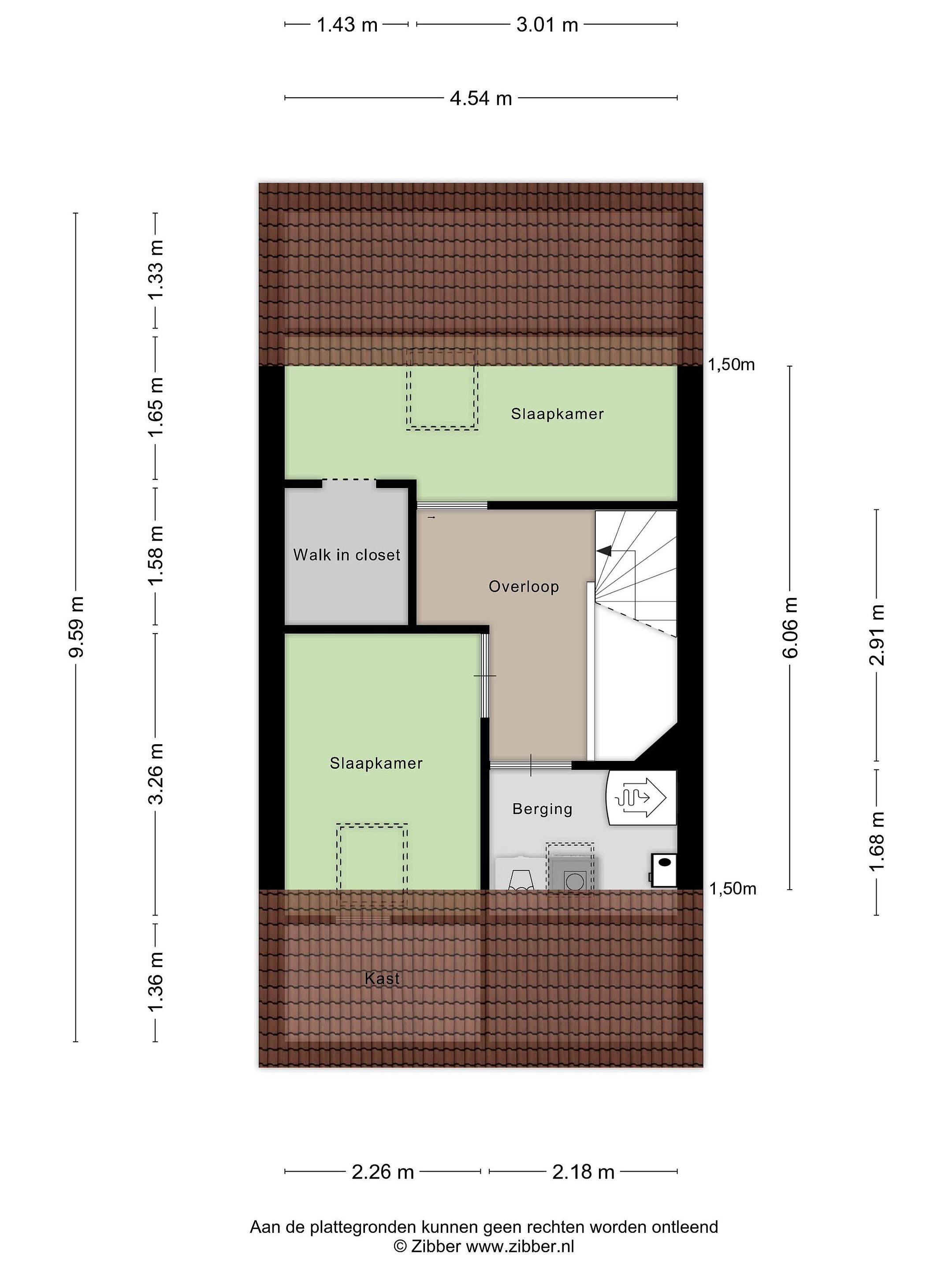 Bergruimte onder de schuine kap aan voor- en achterzijde.
