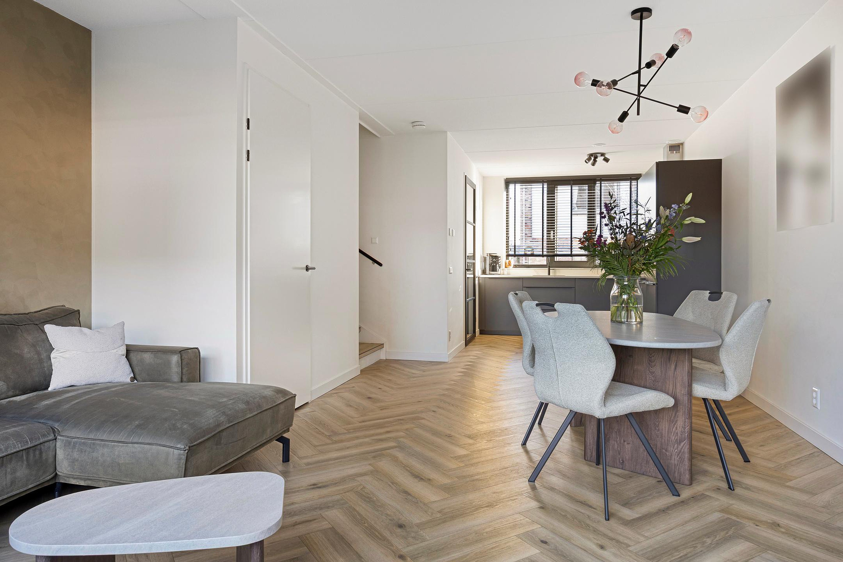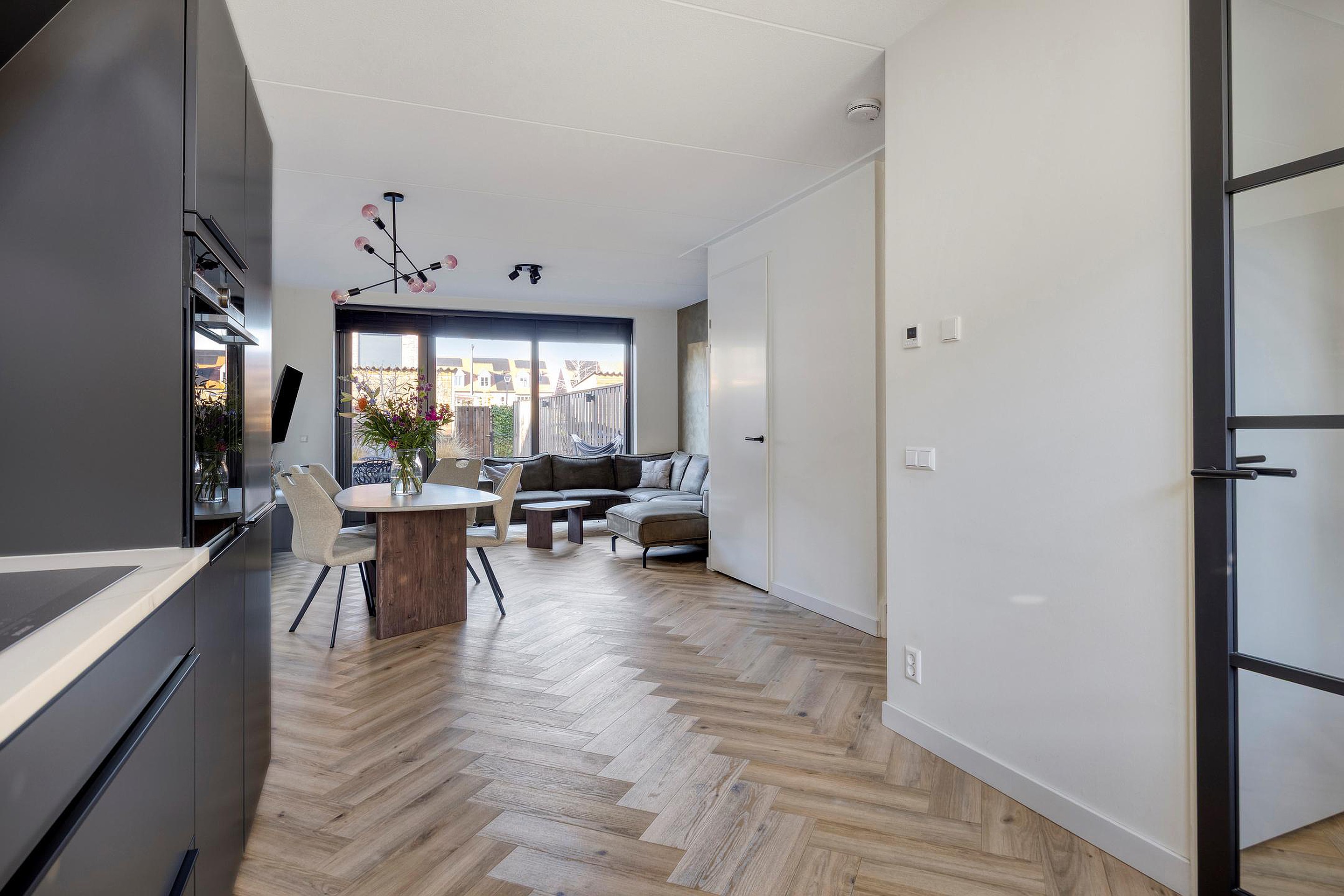 De pvc-vloer ligt in een visgraad motief en loopt door tot in de keuken en woonkamer.