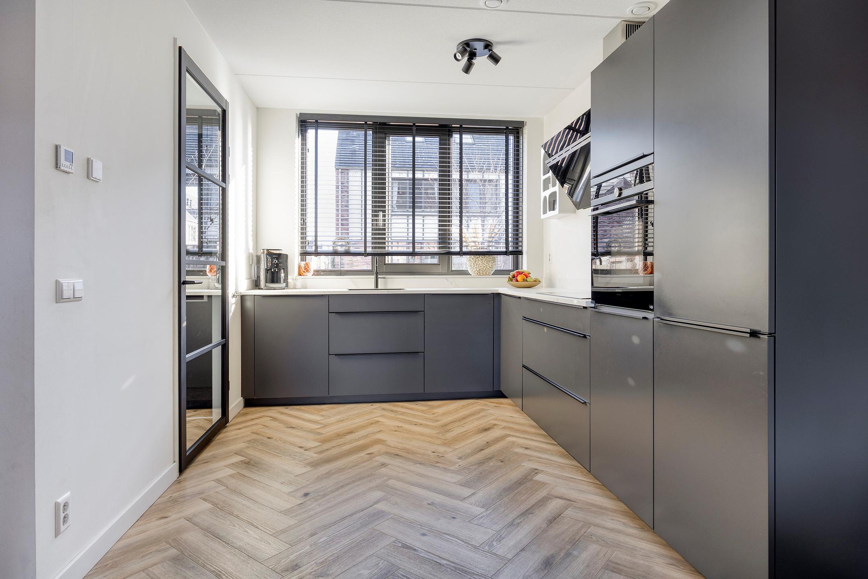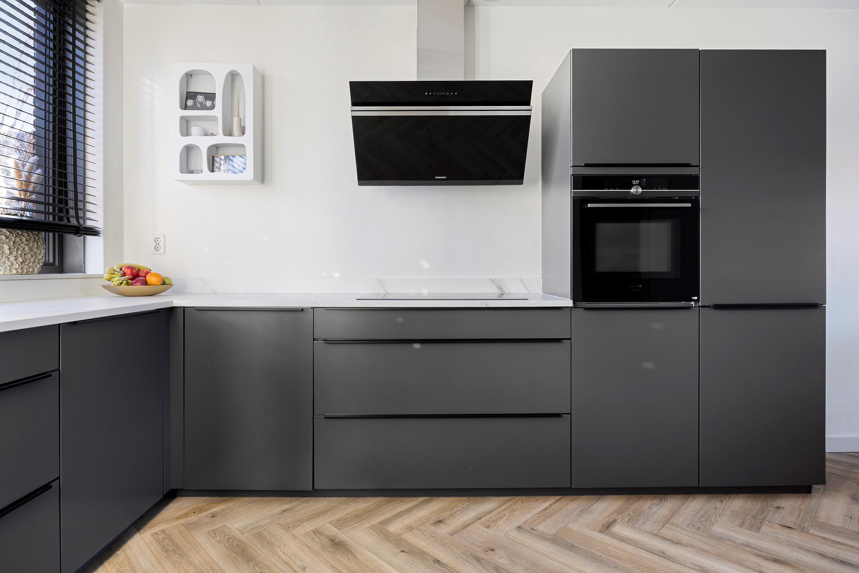 De keuken ligt aan de voorzijde en is modern uitgevoerd in een praktische hoekopstelling met alle benodigde inbouwapparatuur, merk Siemens, zoals een inductie kookplaat, afzuiging, combi magnetron, koelkast, vriezer, vaatwasser. Ook is er een Quooker (kokend water) kraan aanwezig.