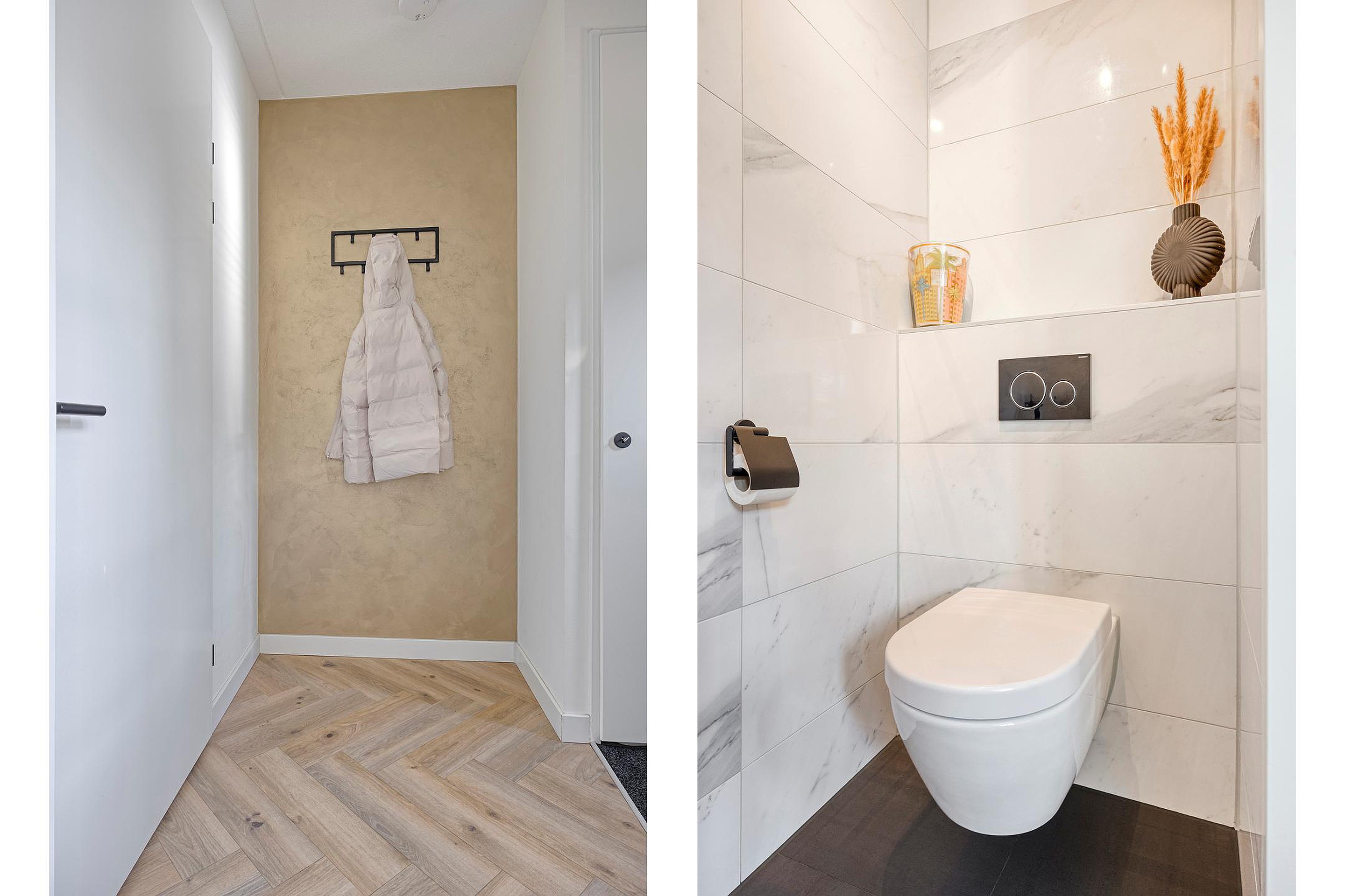 Je komt binnen via de voortuin, waar de verzorgde entree direct de nette en verzorgde uitstraling van het huis laat zien. In de hal vind je de zeer moderne meterkast en het grote toilet is voorzien van een hangend closet.