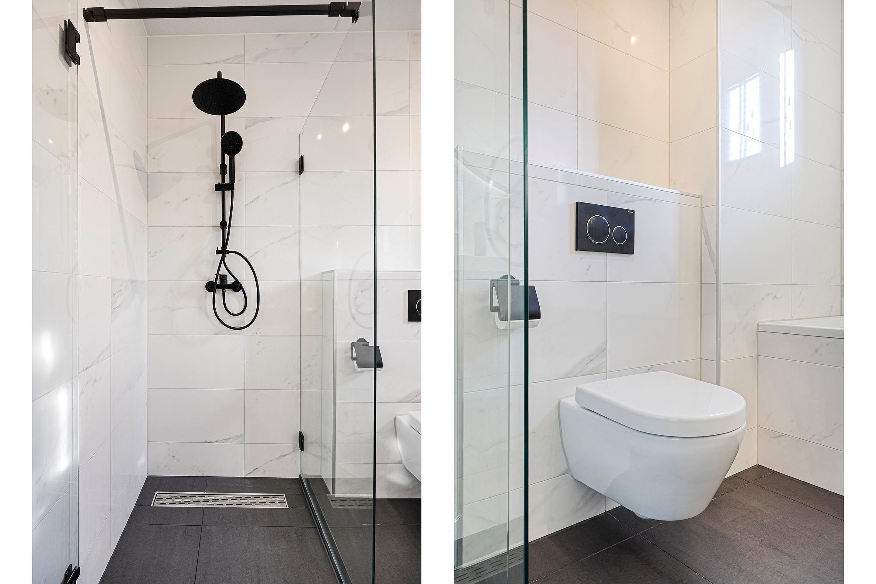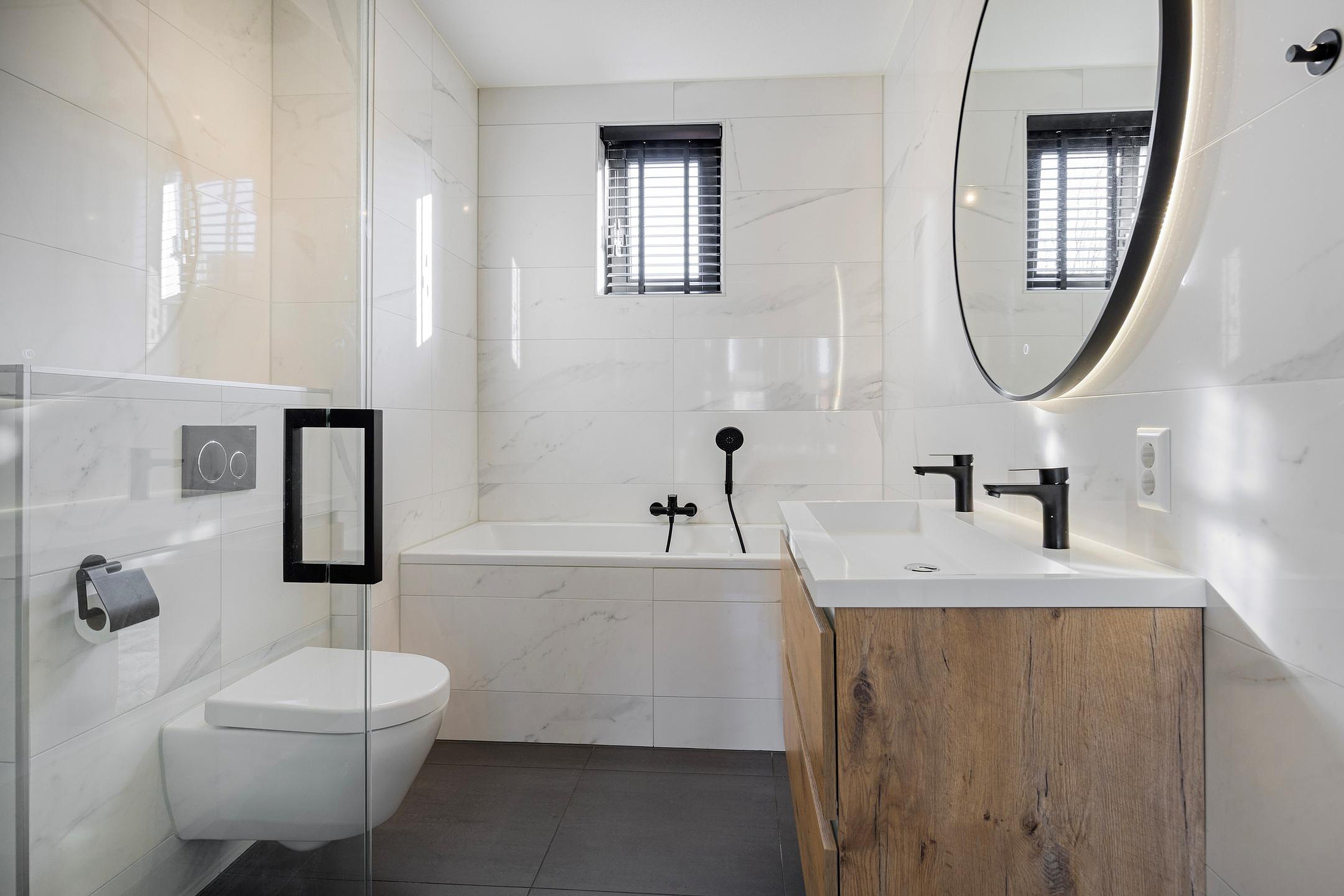 De badkamer is luxe uitgevoerd met een ruime inloopdouche, tweede toilet, bad en een stijlvol wastafelmeubel met bijpassende spiegel. De ruimte is volledig betegeld.