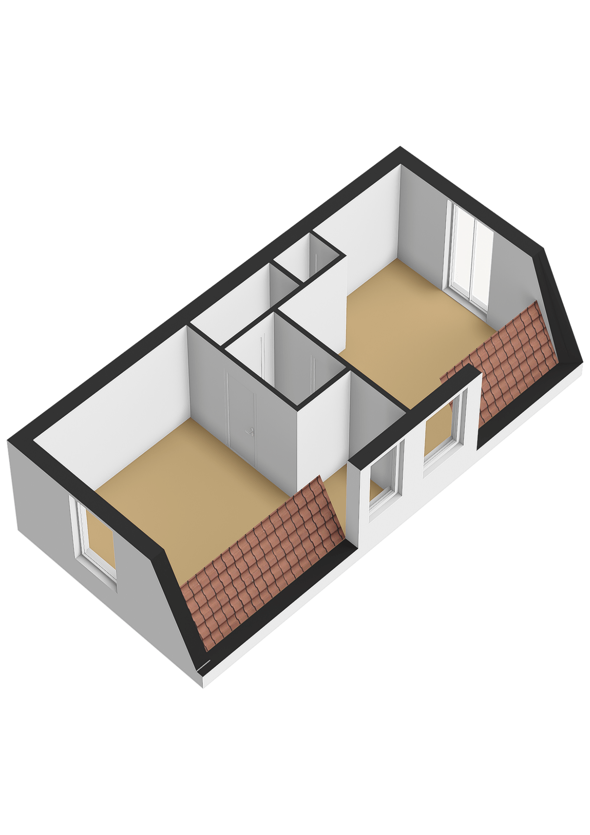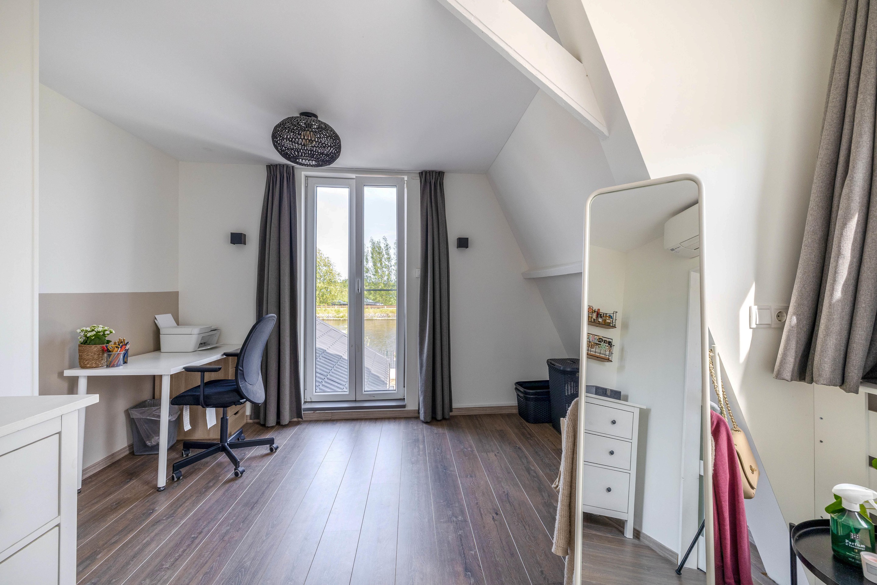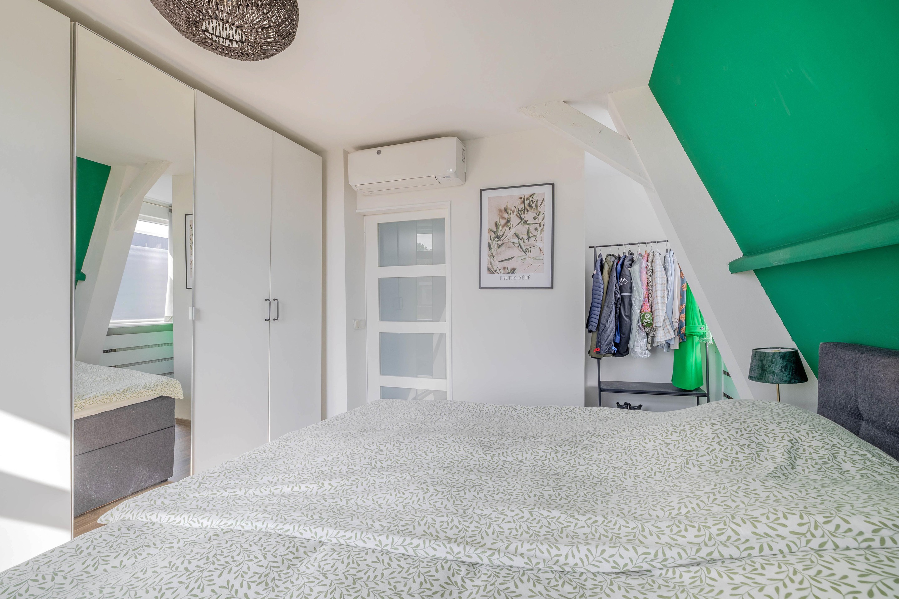 De trapopgang en overloop geven toegang tot beide slaapkamers. De verdieping is vergroot met een dakkapel die doorloopt in beide slaapkamers, waarin airco-installaties aanwezig zijn.