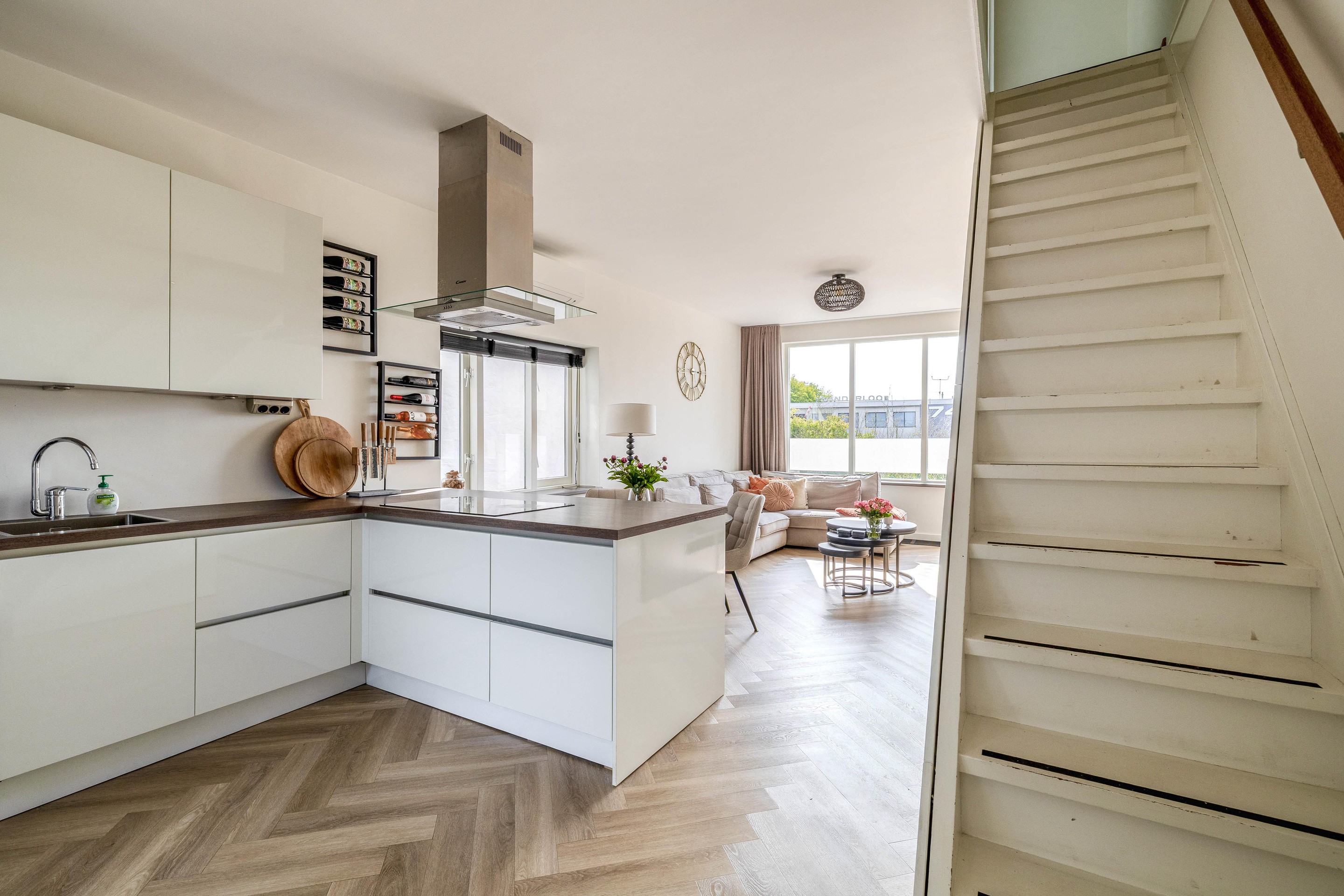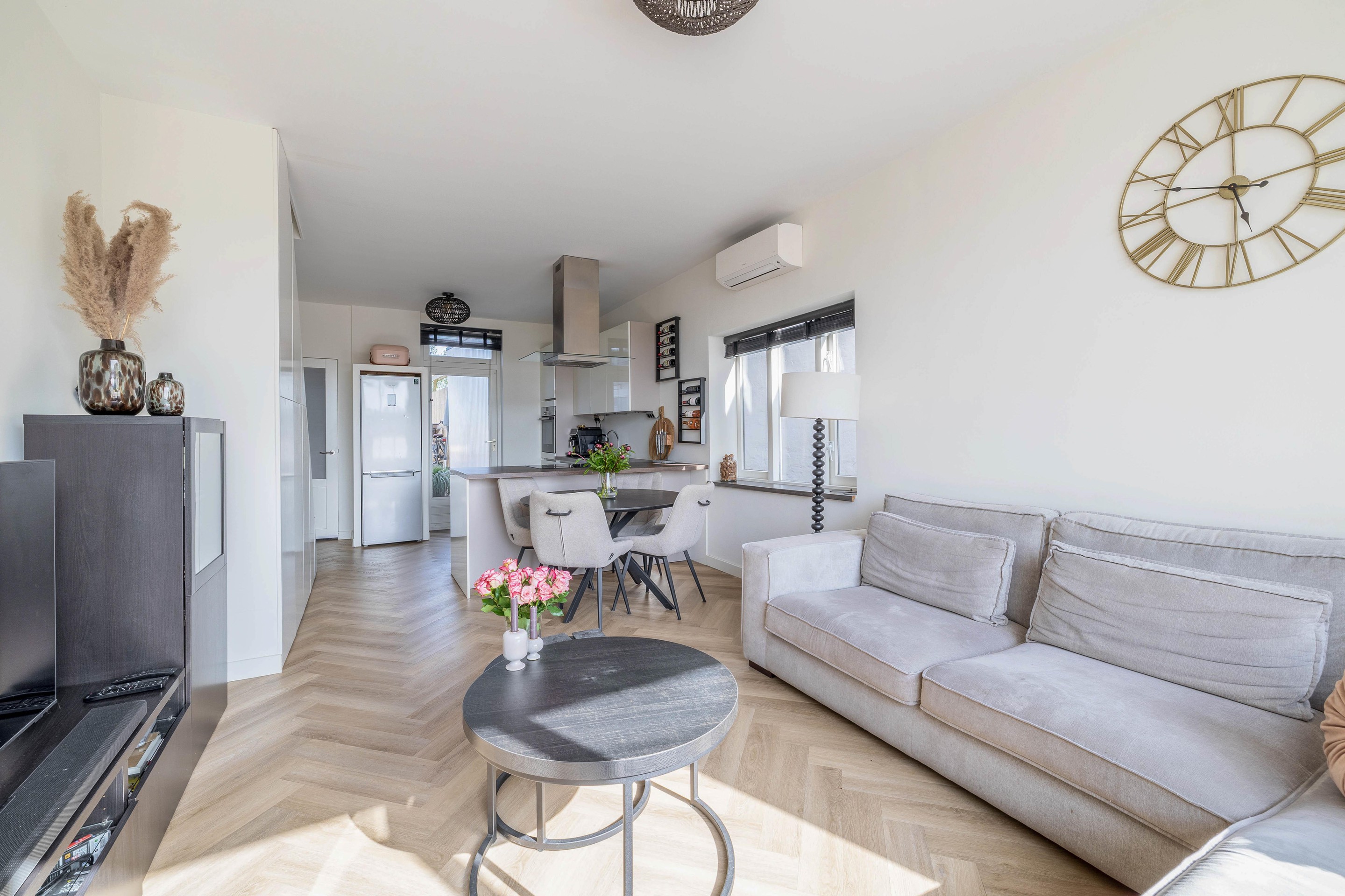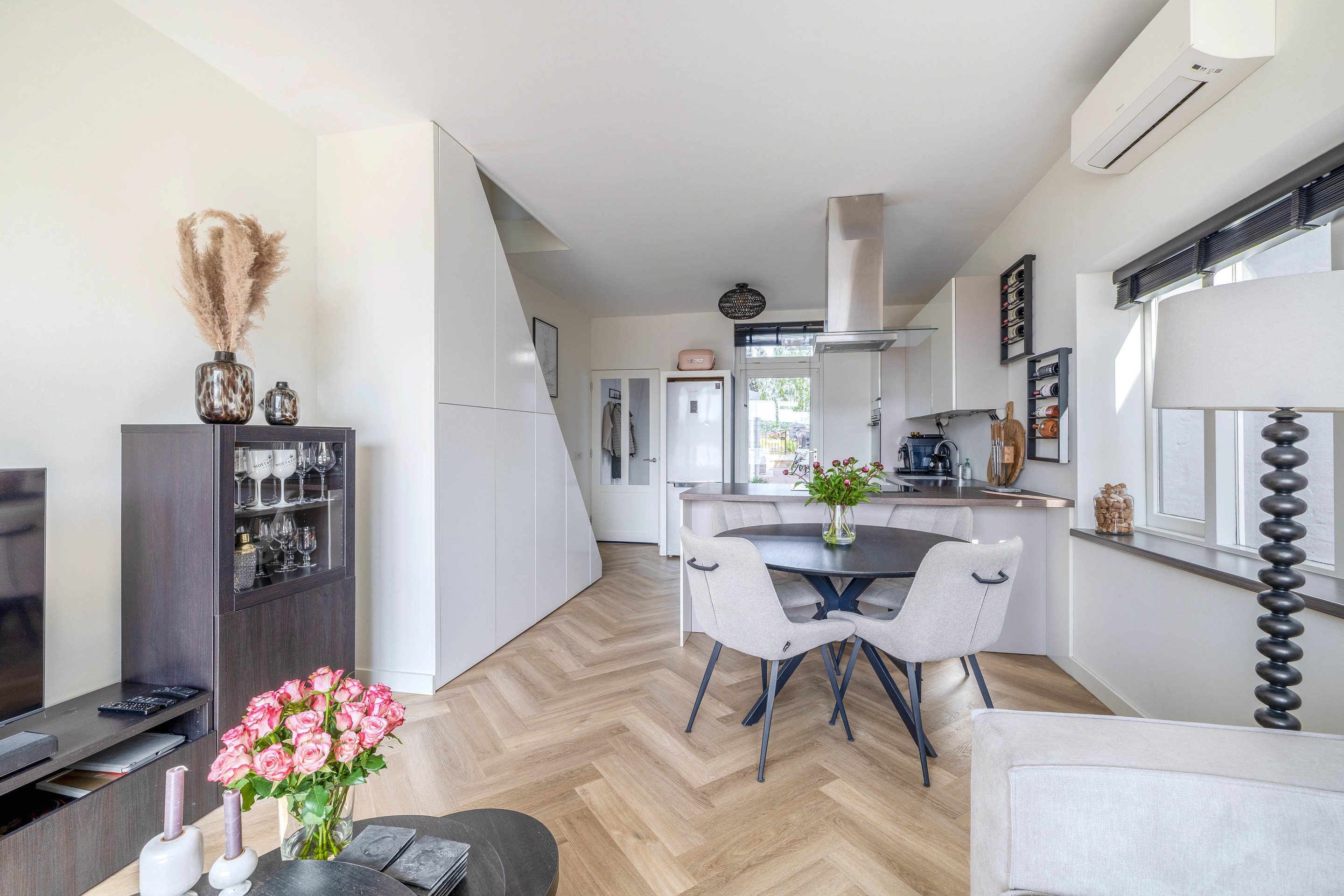 De woonkamer en open keuken vormen één geheel en zijn keurig afgewerkt met stucwerk. In een hoekkast van de woonkamer bevindt zich de meterkast (7 groepen en 2 aardlekschakelaars). De keuken is groot en L-vormig geplaatst, voorzien van diverse inbouwapparatuur waaronder een inductiekookplaat, afzuigkap en vaatwasser. Vanuit de keuken is er ook toegang tot de tuin. De woonkamer heeft een airco-installatie.
