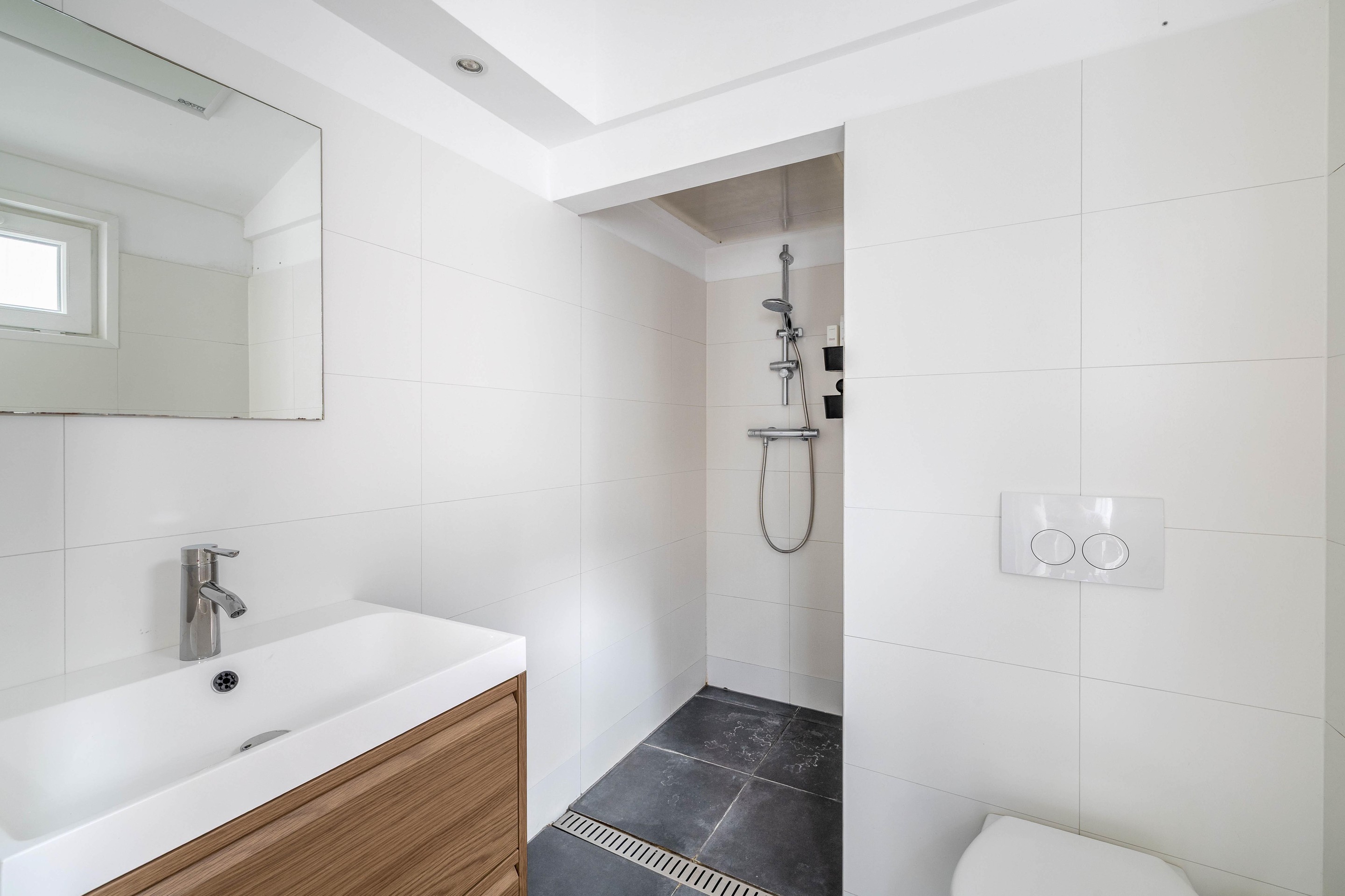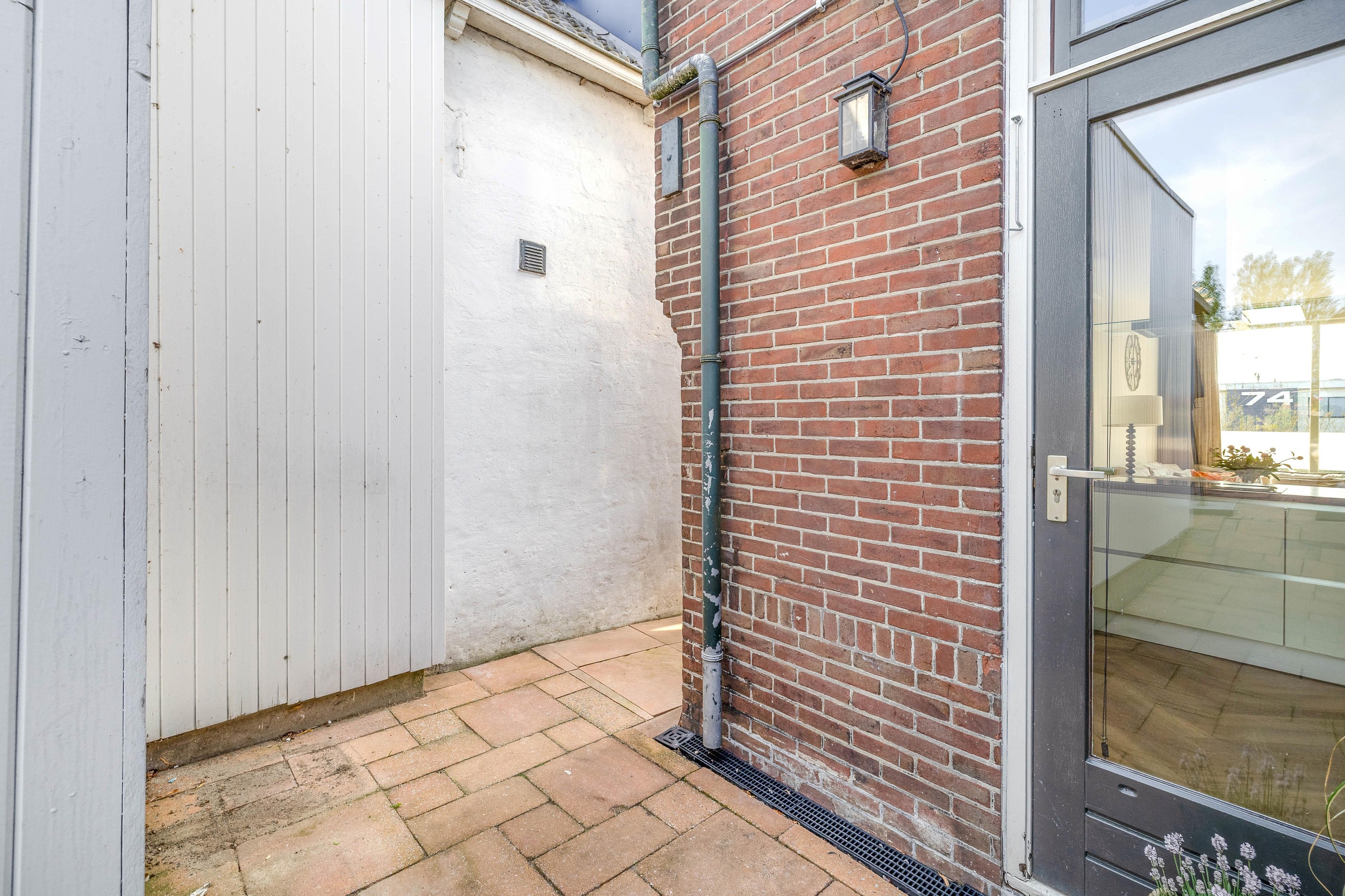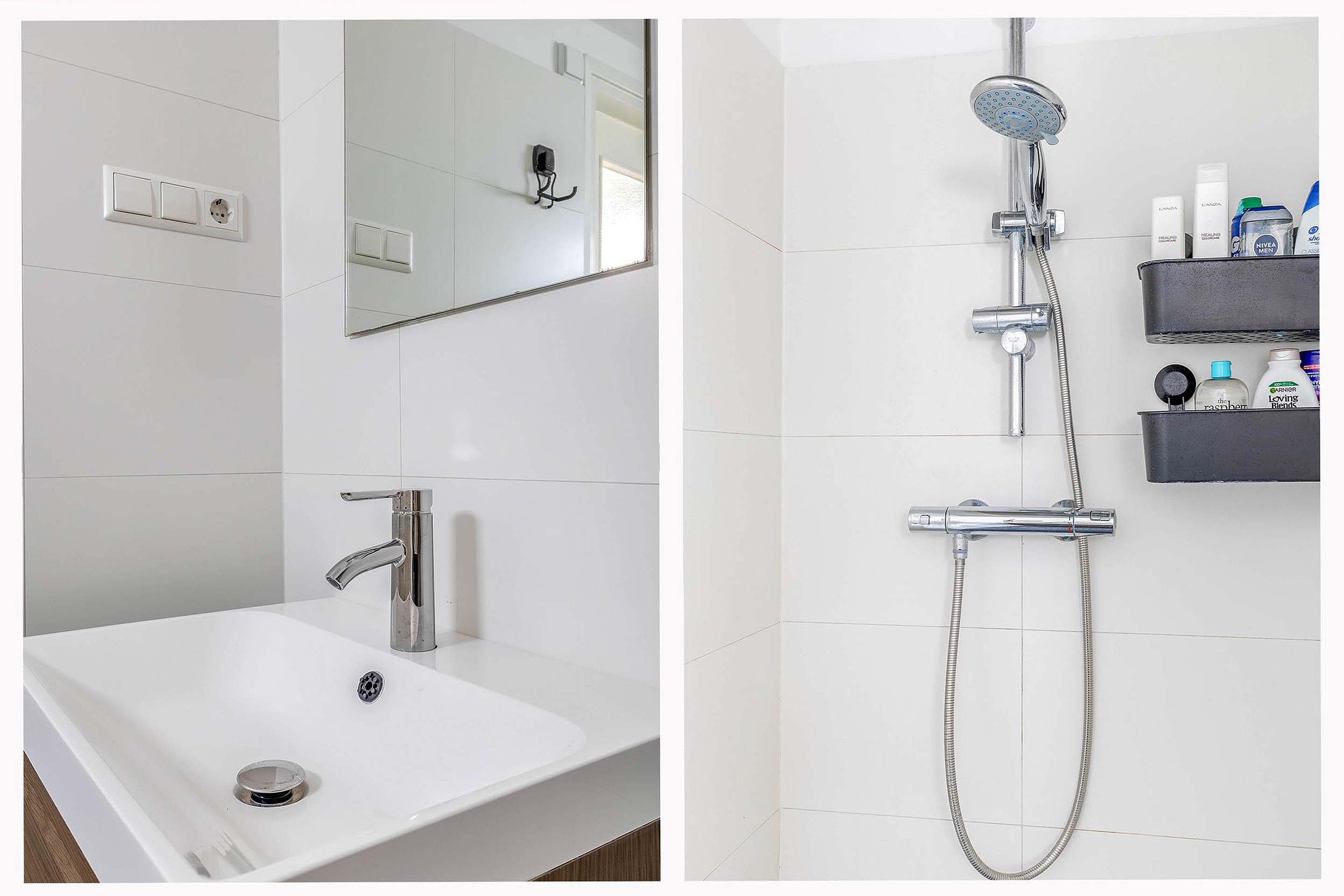 Via de poort komt men in de achtertuin. De toegang tot de woning verloopt via de tuin en binnenkomst gebeurt in de hal. Deze hal geeft toegang tot de moderne badkamer en keuken aan de achterzijde. De badkamer is volledig betegeld en voorzien van een wastafelmeubel, hangtoilet en inloopdouche. Verwarming gebeurt door middel van een infraroodpaneel en de vloerverwarming.