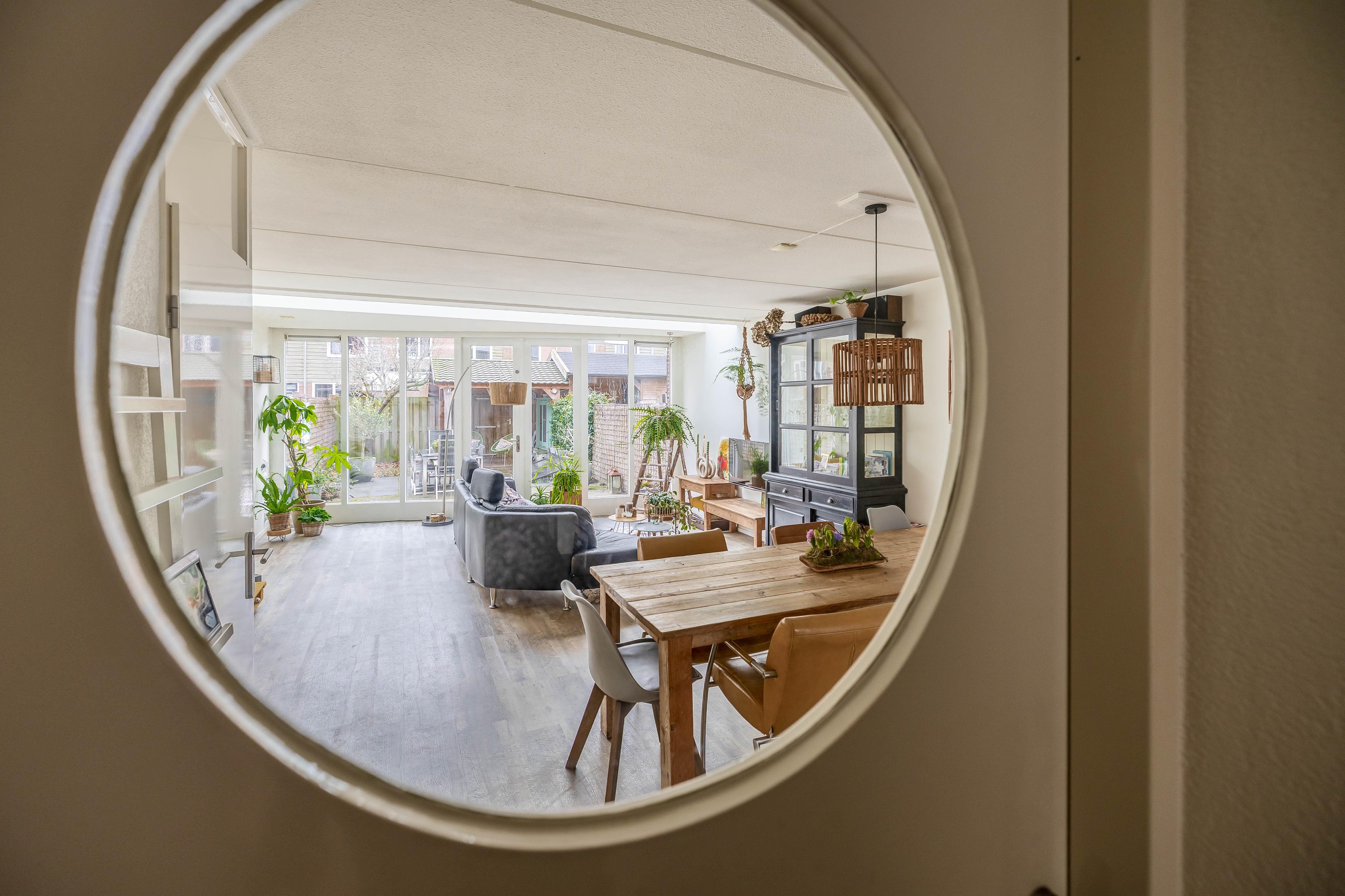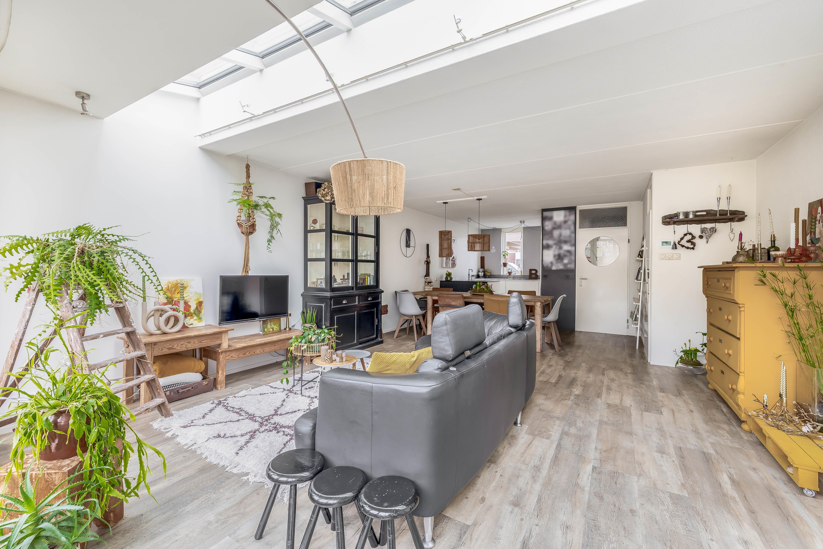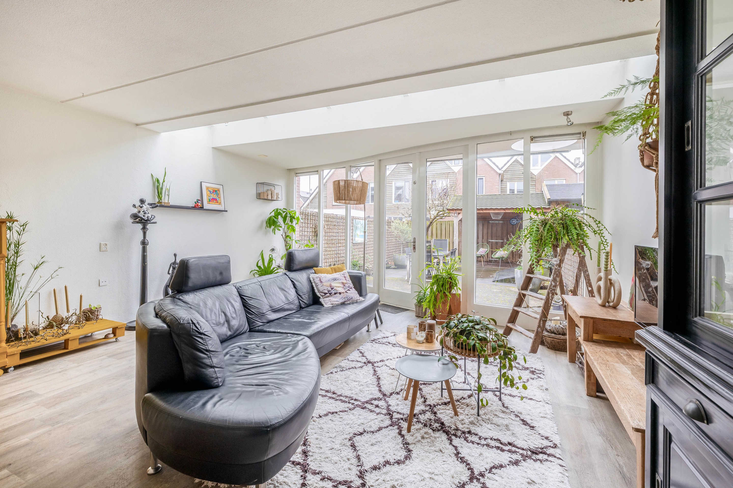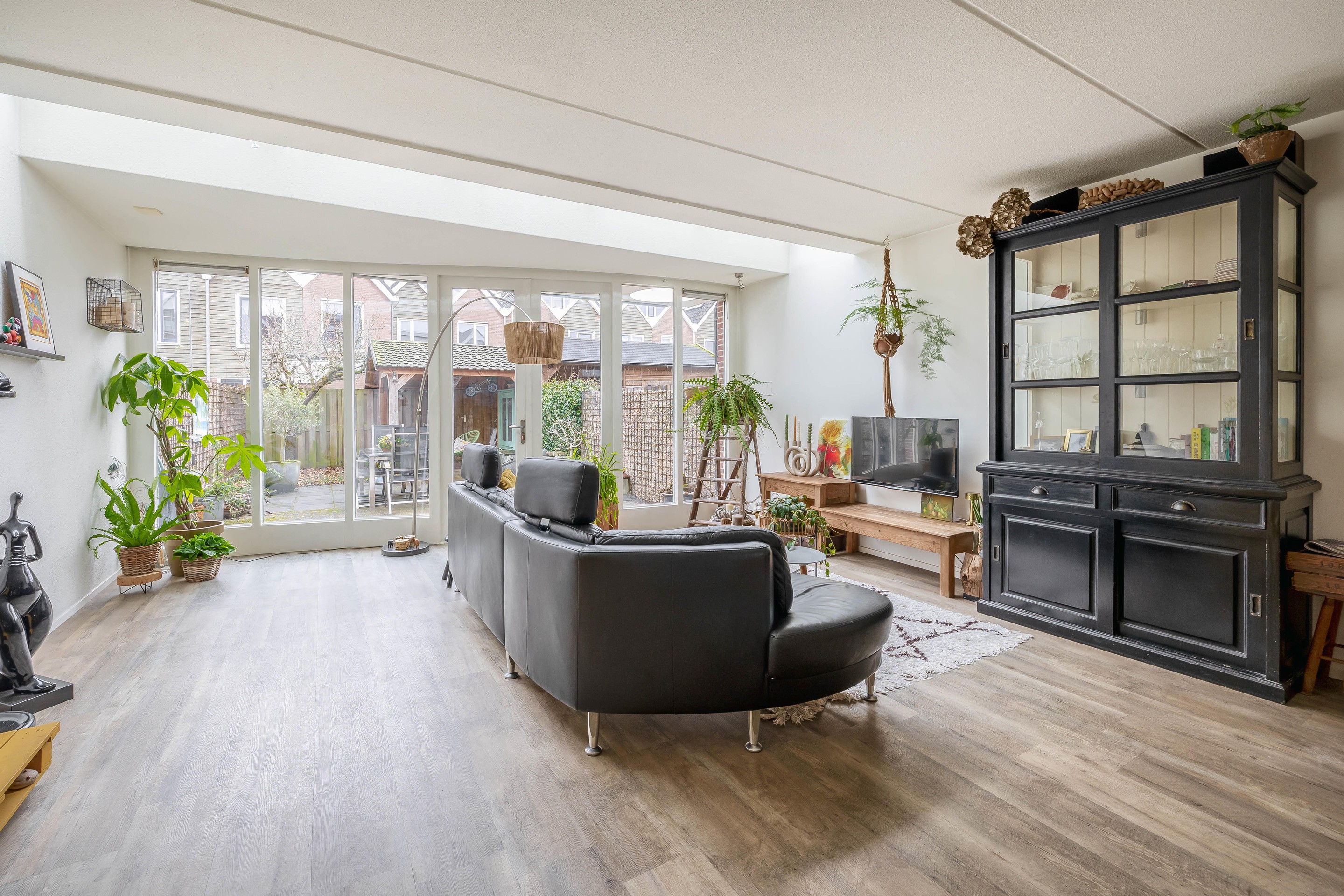U komt de woning binnen in een royale entree met toegang tot de berging, het toilet, de trap en de deur naar de woonkamer. Bij het betreden van de woonkamer valt direct de enorme ruimte op. De kamer is namelijk flink uitgebouwd. De uitbouw is met een zogenoemde lichtstraat aan de woning verbonden. Dit geeft niet alleen een heel speels effect maar zorgt voor veel extra lichtinval. De raampartijen geven zicht op de tuin.