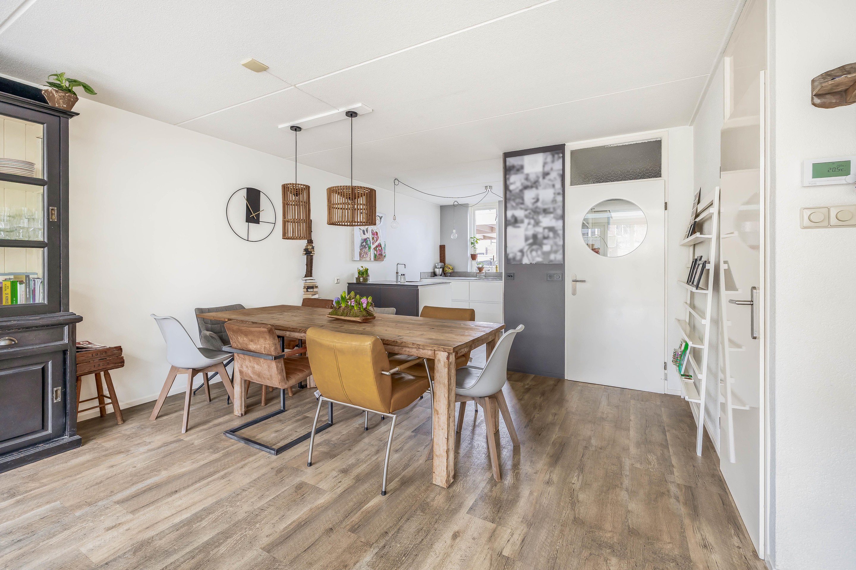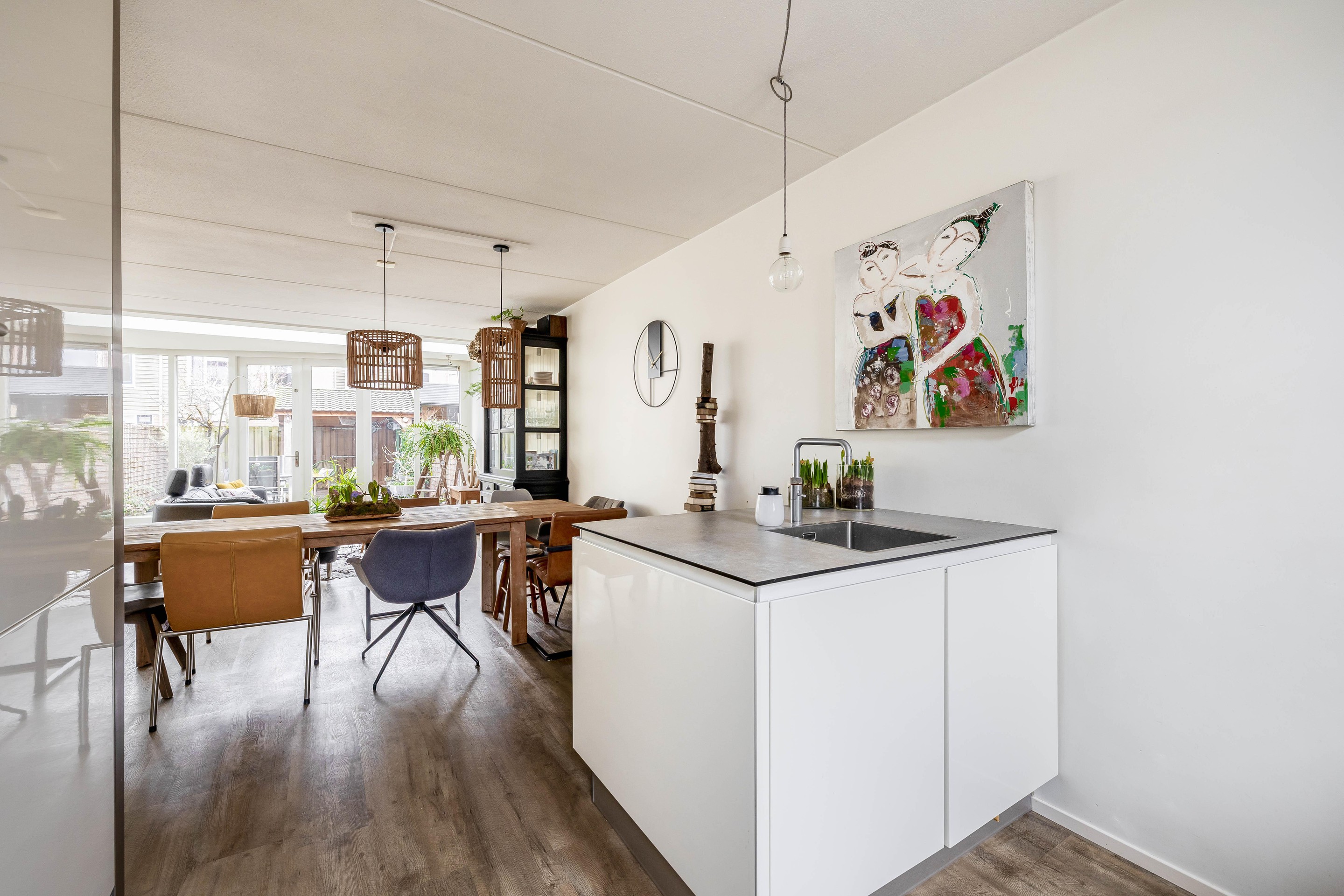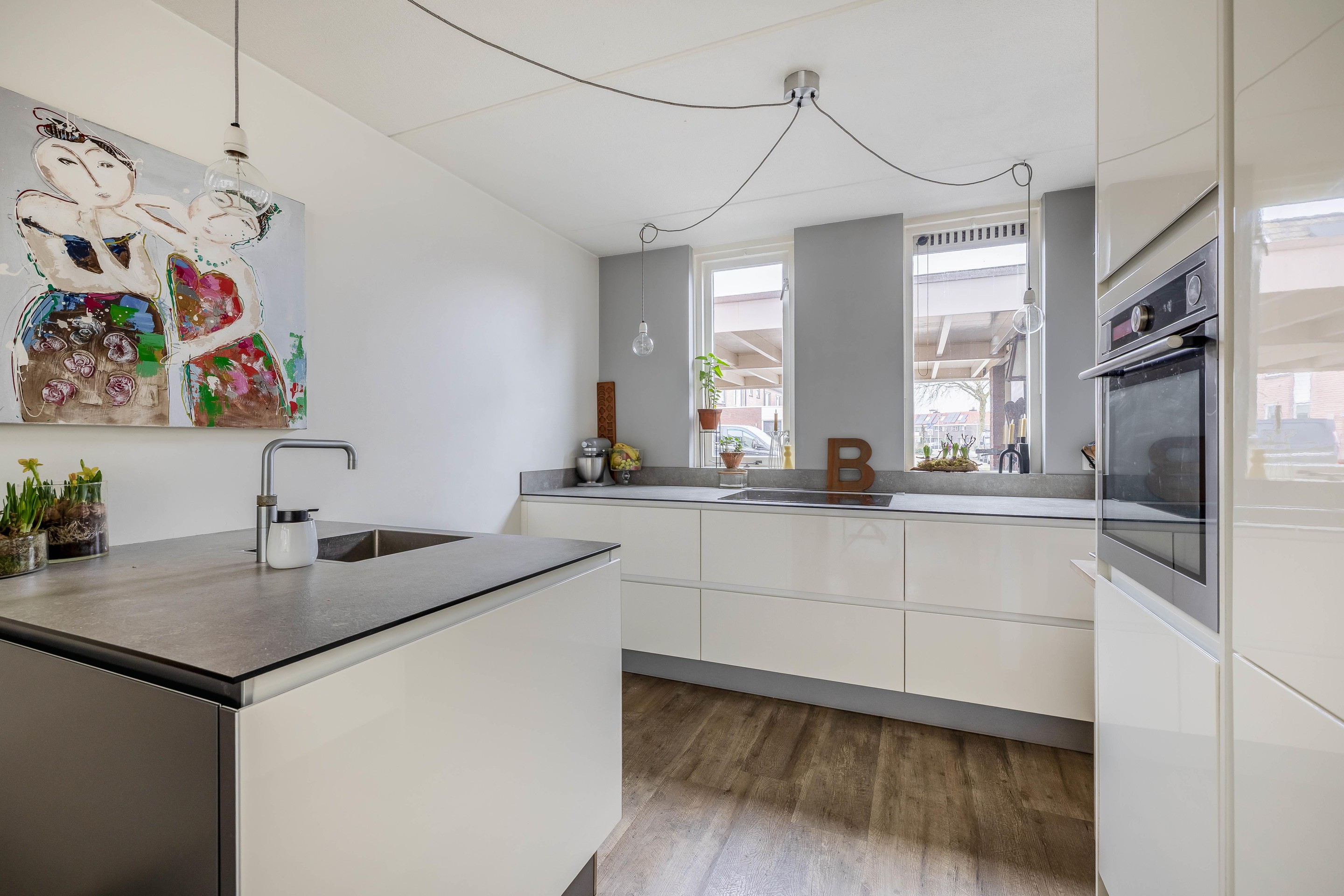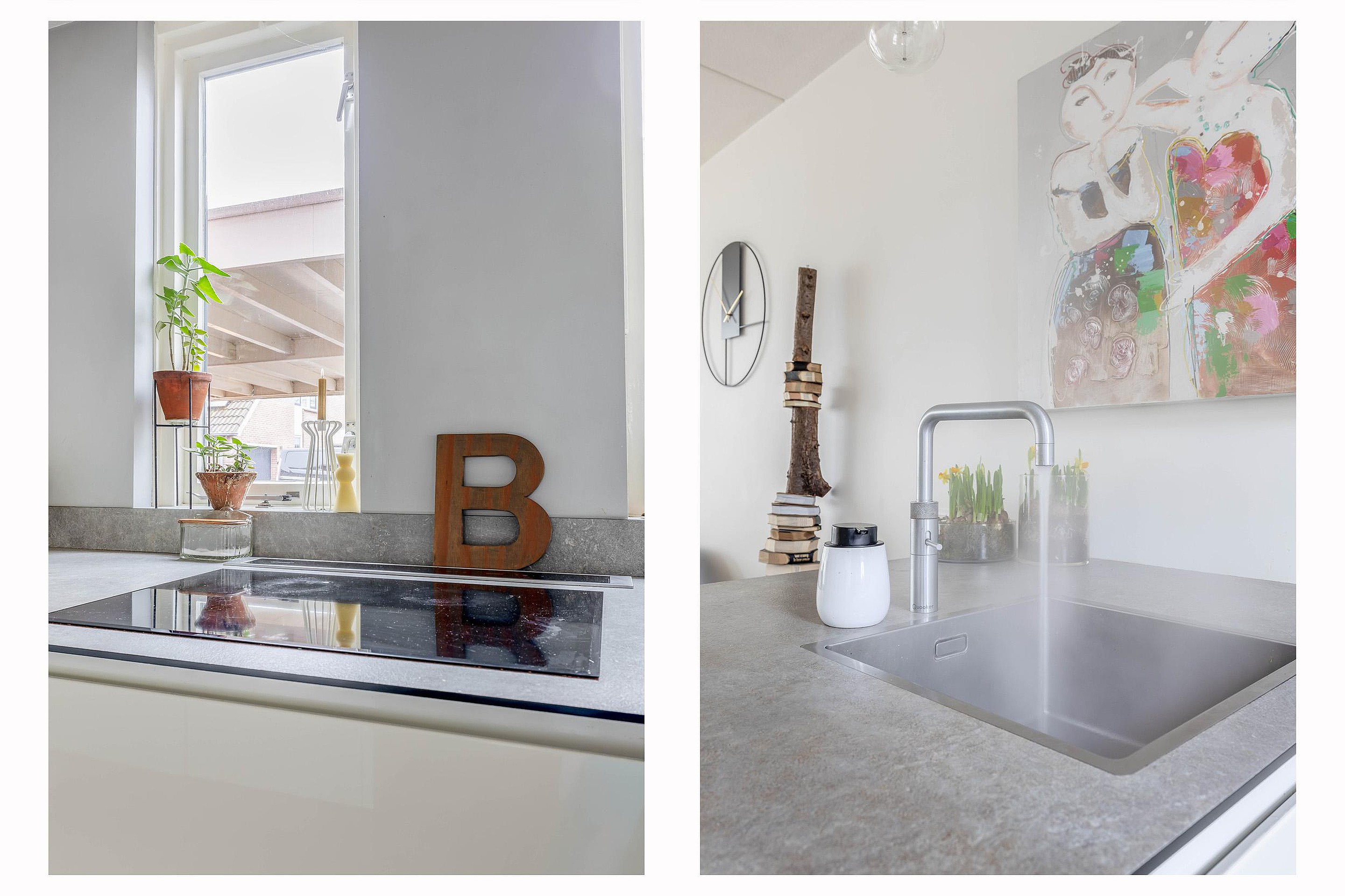 De keuken is gevoelsmatig voorzien van drie “losse elementen”, namelijk het lange gedeelte voor het raam, waarop je kookt, het spoeleiland aan de woonkamerkant en de een apparatenkast met daarin de inbouwapparatuur. Deze moderne keuken is voorzien van lichte kastfronten en een dun Topcore werkblad. De inbouwapparatuur bestaat uit een Quooker, inductiekookplaat, vaatwasser, koelkast en een stoomoven. Vanuit de keuken kijk je vrijuit over de wijk. De begane grond is verder afgewerkt met een pvc-vloer met vloerverwarming en schilderwerk in lichte en frissen tinten. Onder de trap is nog een praktische trapkast aanwezig.