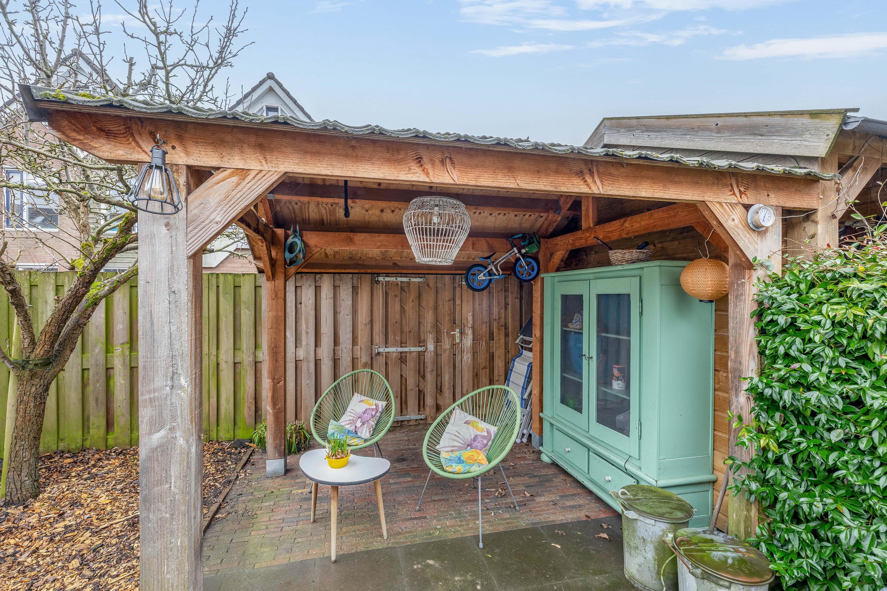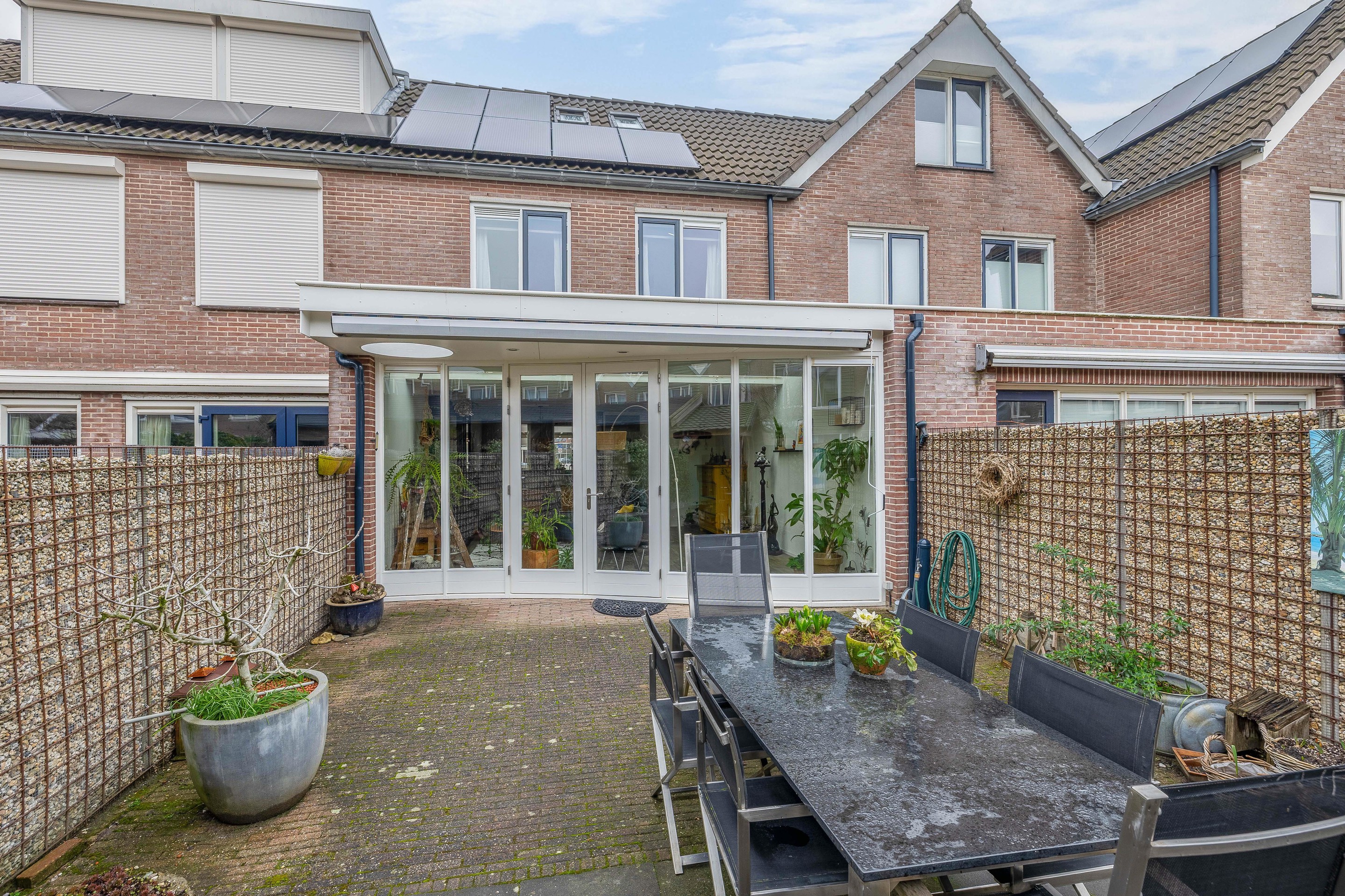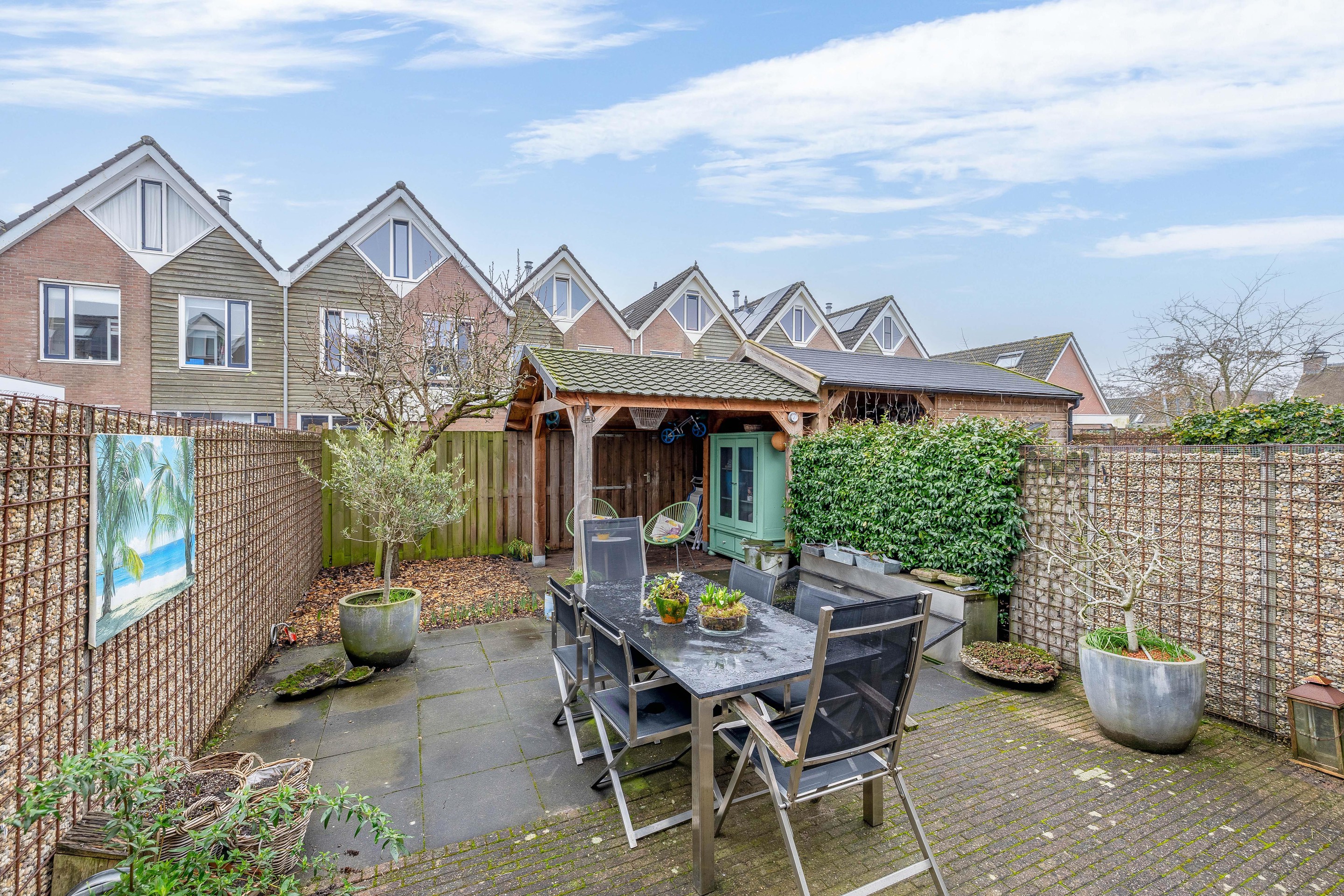 De ruim negen meter diepe tuin ligt op het zuiden, heeft aantrekkelijke indeling en vraagt niet om veel onderhoud. De beplanting zit in voornamelijk in potten en er is een kleine vijver aanwezig. Achter in de tuin staat een overkapping waaronder je lang kunt genieten van deze aantrekkelijke tuin. Op de achtergevel is een zonnescherm geplaatst en op het dak van het woonhuis liggen de 12 zonnepanelen. De houten schutting heeft een afsluitbare poort.