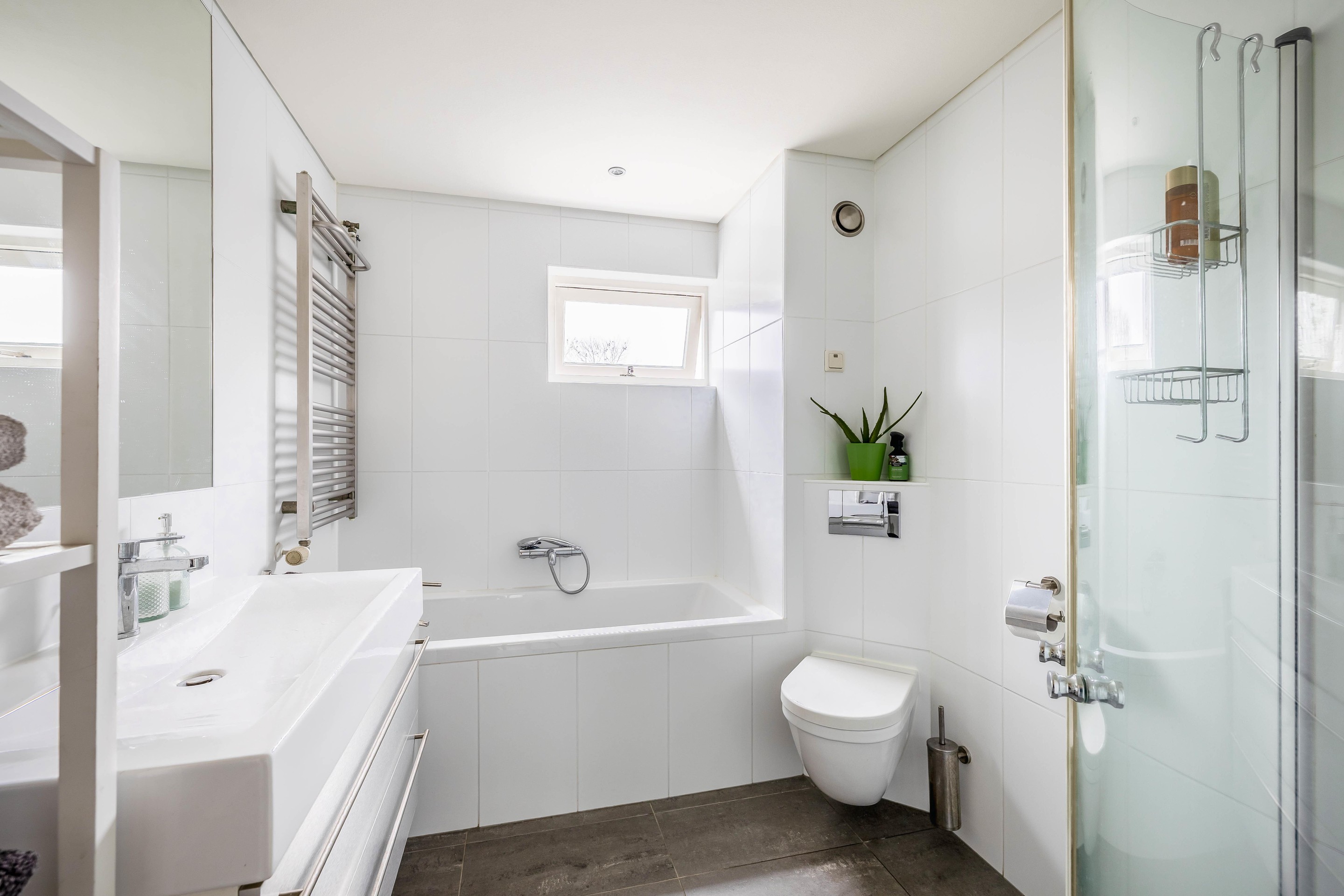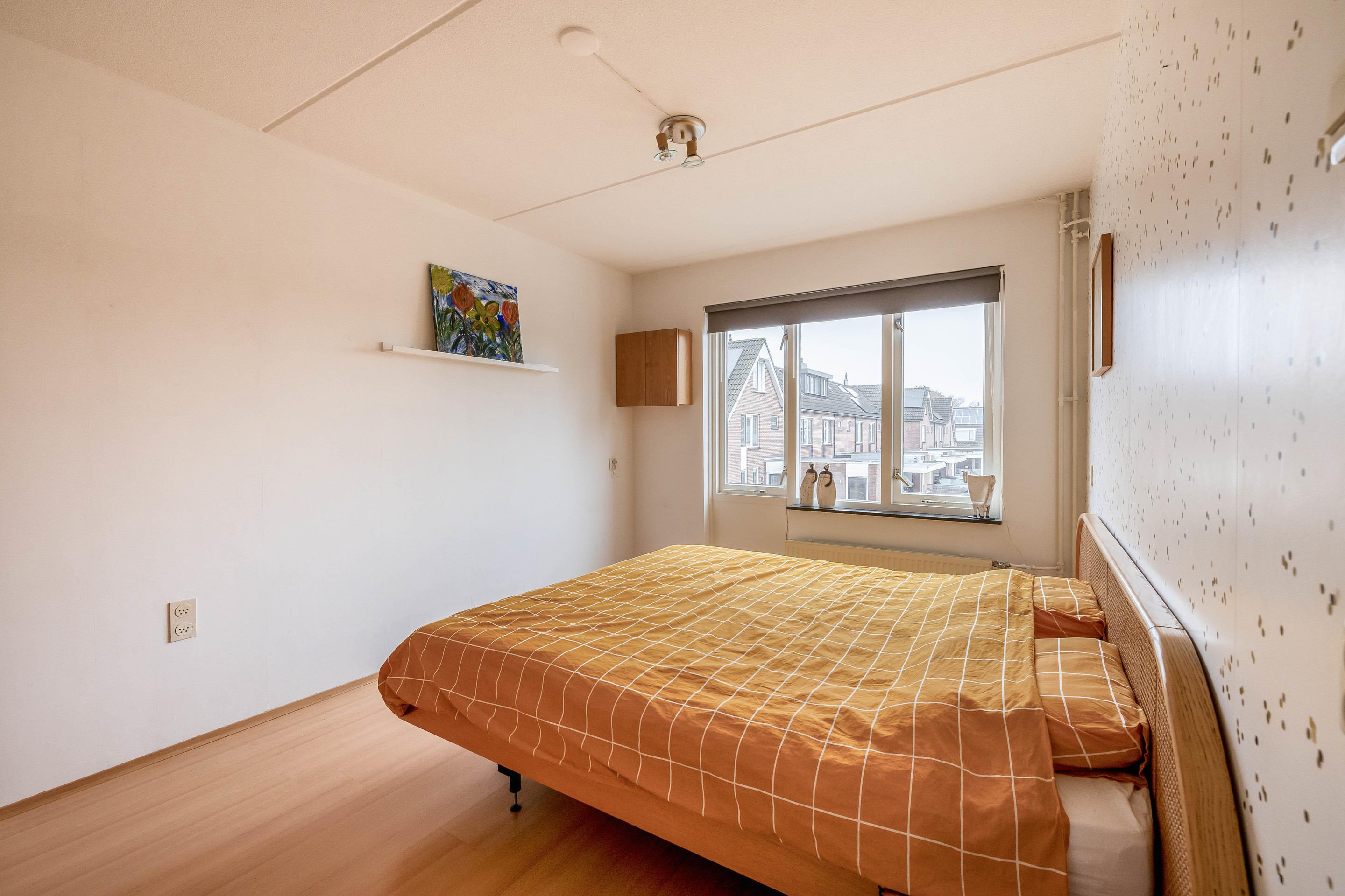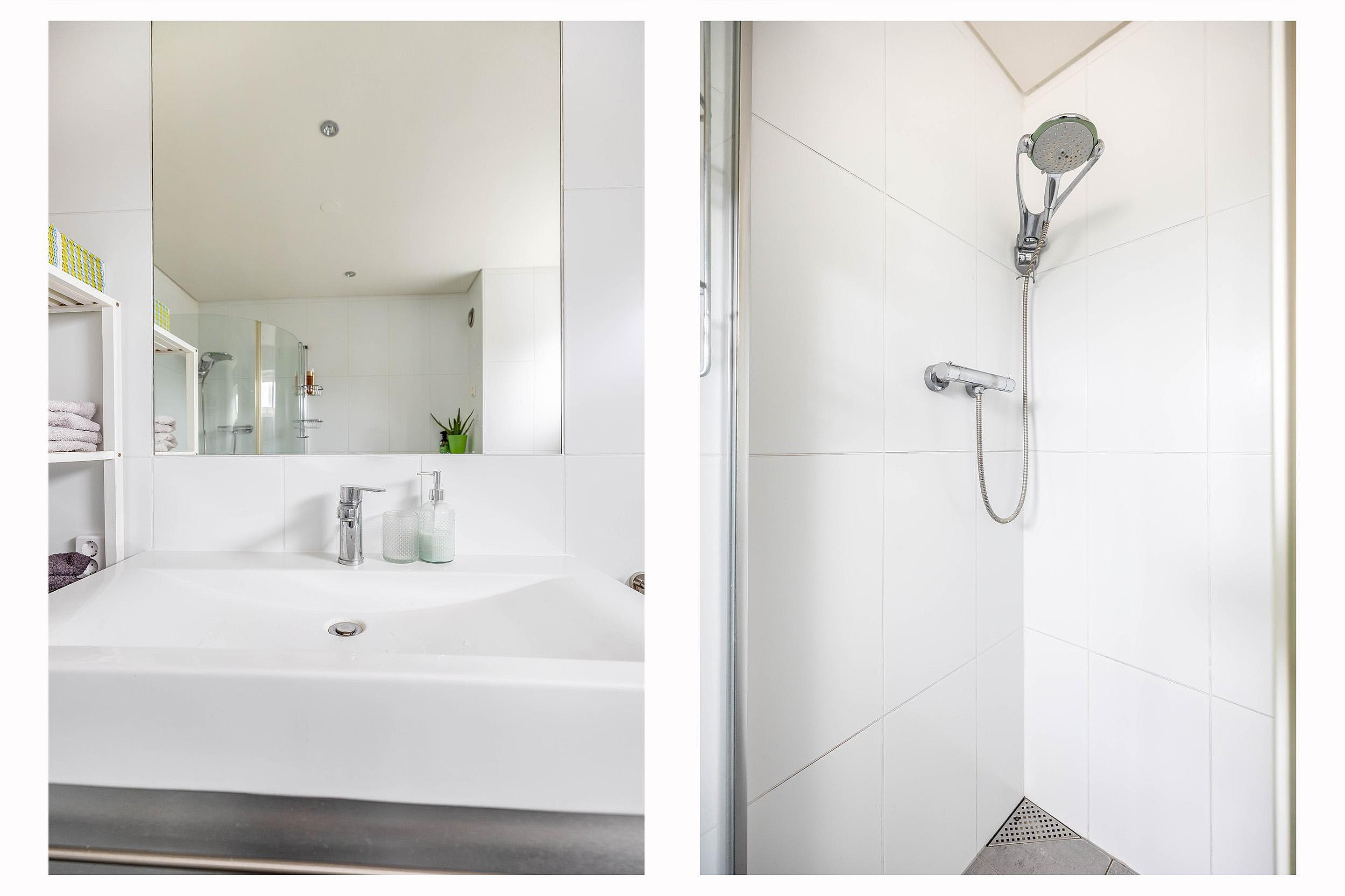 Verdiepingen: De trap in de gang brengt u naar de eerste verdieping. Hier waren oorspronkelijk drie flinke slaapkamers en een badkamer gesitueerd. De huidige eigenaren hebben dit aangepast naar een indeling met 2 flinke slaapkamers, een inloopkast én de luxe badkamer. De slaapkamer aan de voorzijde is 298 x 420 cm groot en die aan de achterzijde 515 x 315 cm. De afwerking is overal keurig verzorgd met laminaatvloeren. De nette badkamer ligt aan de voorzijde en is ingedeeld met een ligbad, inloopdouche, breed wastafelmeubel en licht tegelwerk. De ventilatie is geregeld middels een raam en mechanische ventilatie. In het plafond zijn inbouwspots geplaatst.