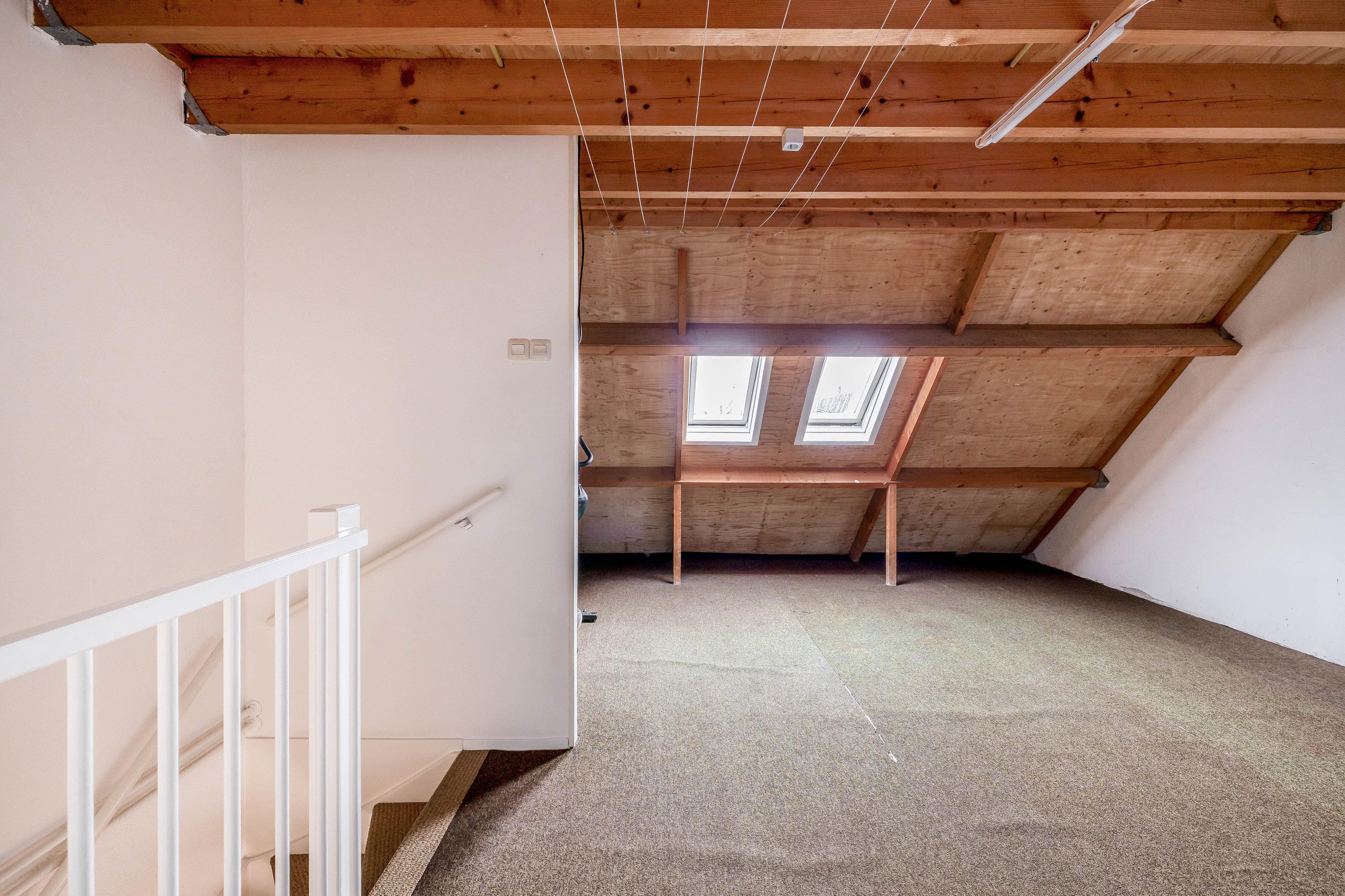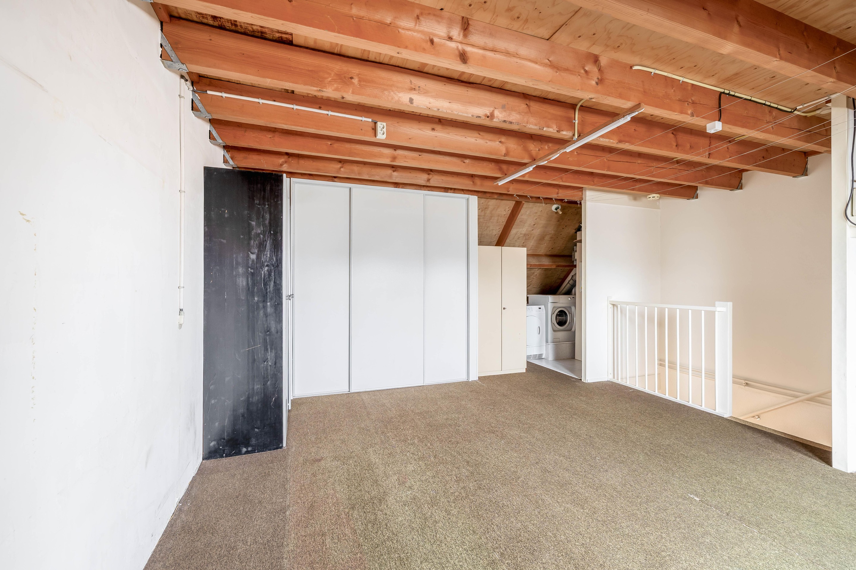De tweede trap ontsluit de open zolderruimte. Deze ruimte is echt enorm en biedt legio mogelijkheden zoals extra kamers, een hobbyruimte of bijvoorbeeld een thuiskantoor. De oppervlakte van de verdieping is (netto, min 1,5 meter hoog) bijna 30 m2, dus maak je plannen waar. Tevens op de zolder de opstelplaats van de cv-installatie, wasmachine en wasdroger.