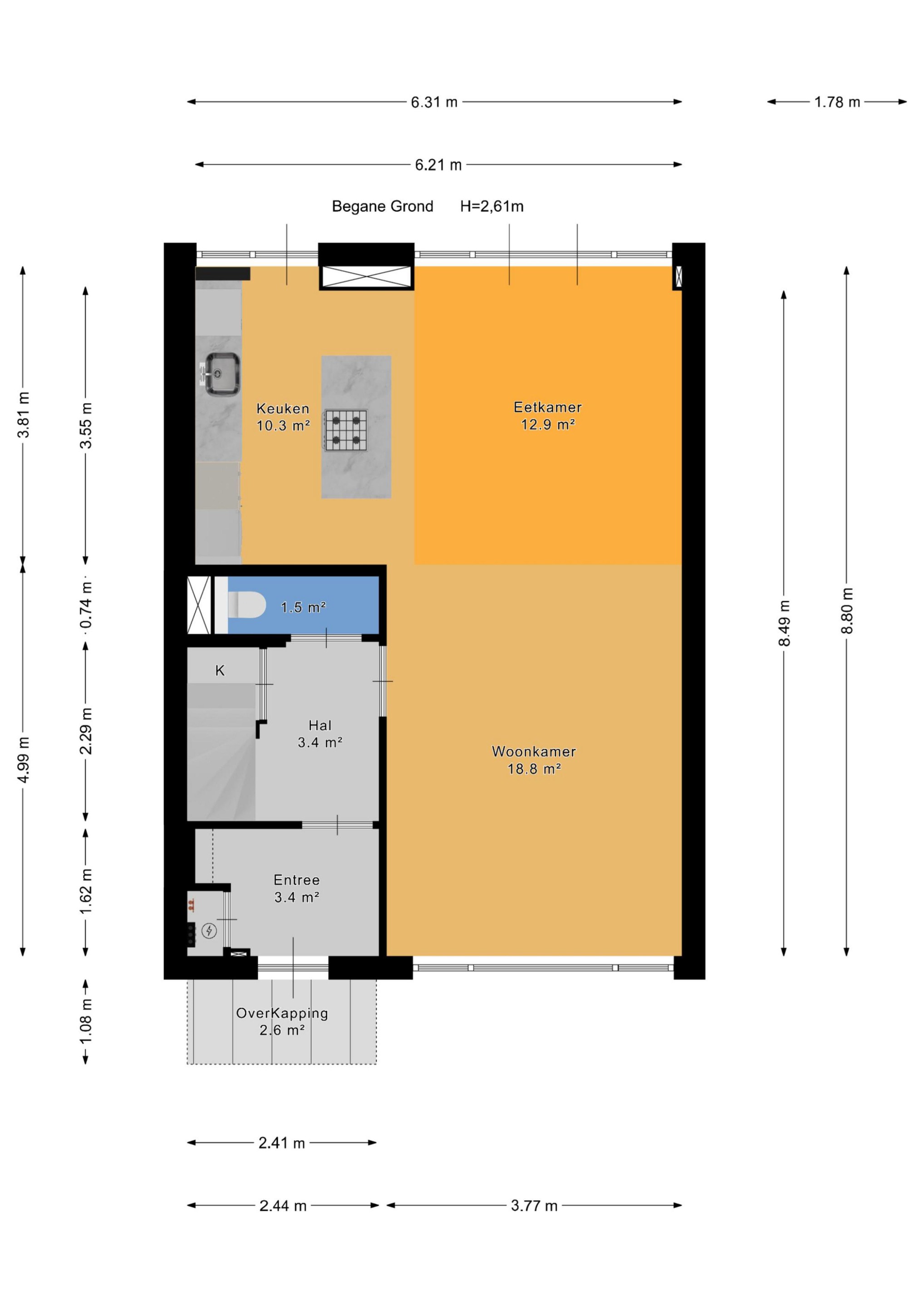Begane grond De entree aan de voorzijde van de woning leidt naar een voorportaal met garderobe en de meterkast, die met twaalf groepen en drie aardlekschakelaars keurig is uitgerust. Vervolgens betreedt u de ruime en sfeervolle entreehal. Hier vindt u een praktische trapkast en een toiletruimte met een vrijhangend toilet.