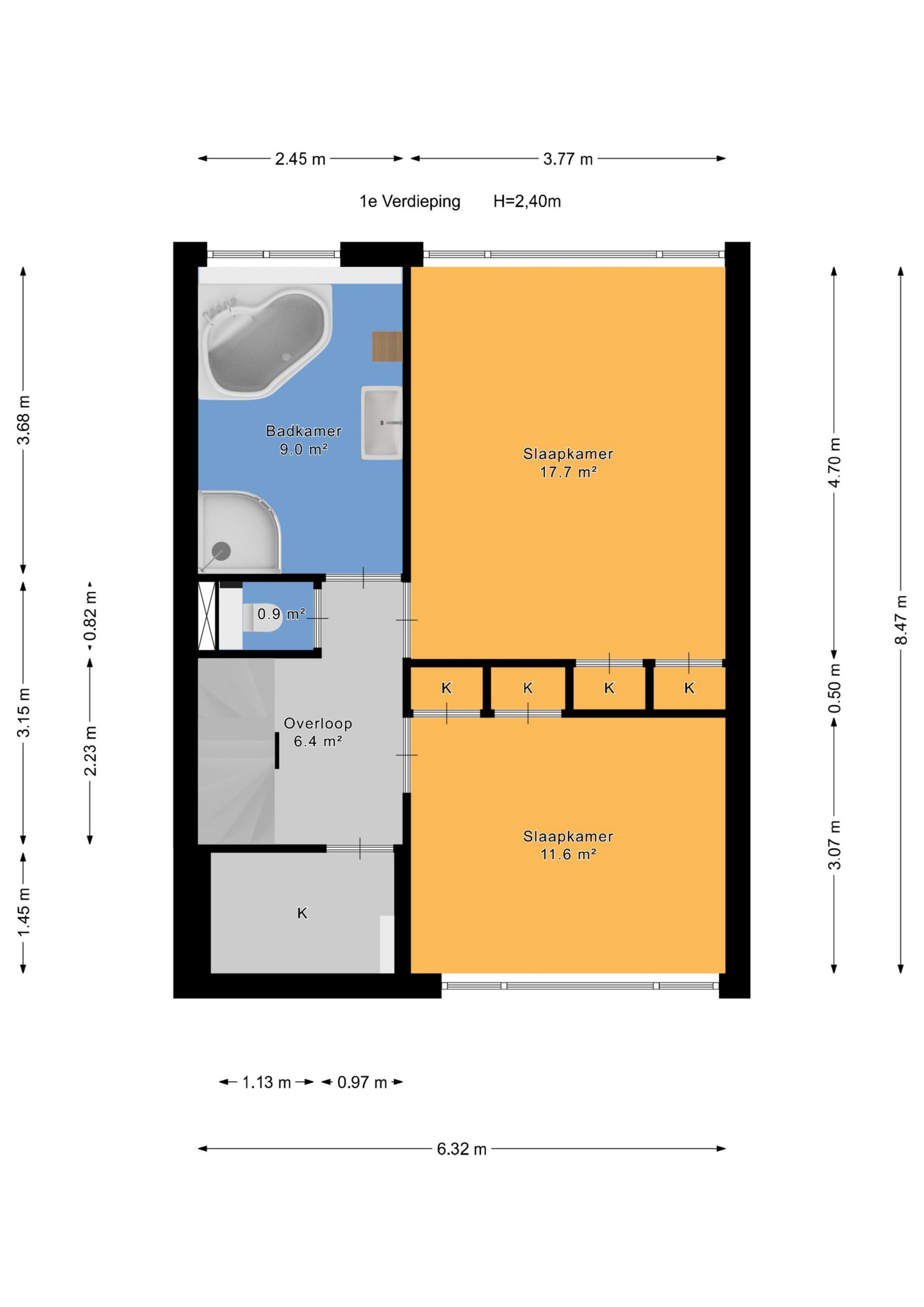 Eerste verdieping De eerste verdieping opent met een ruime overloop, die de centrale spil is. Vanaf hier heeft u toegang tot twee slaapkamers, het separate toilet en de riante badkamer.